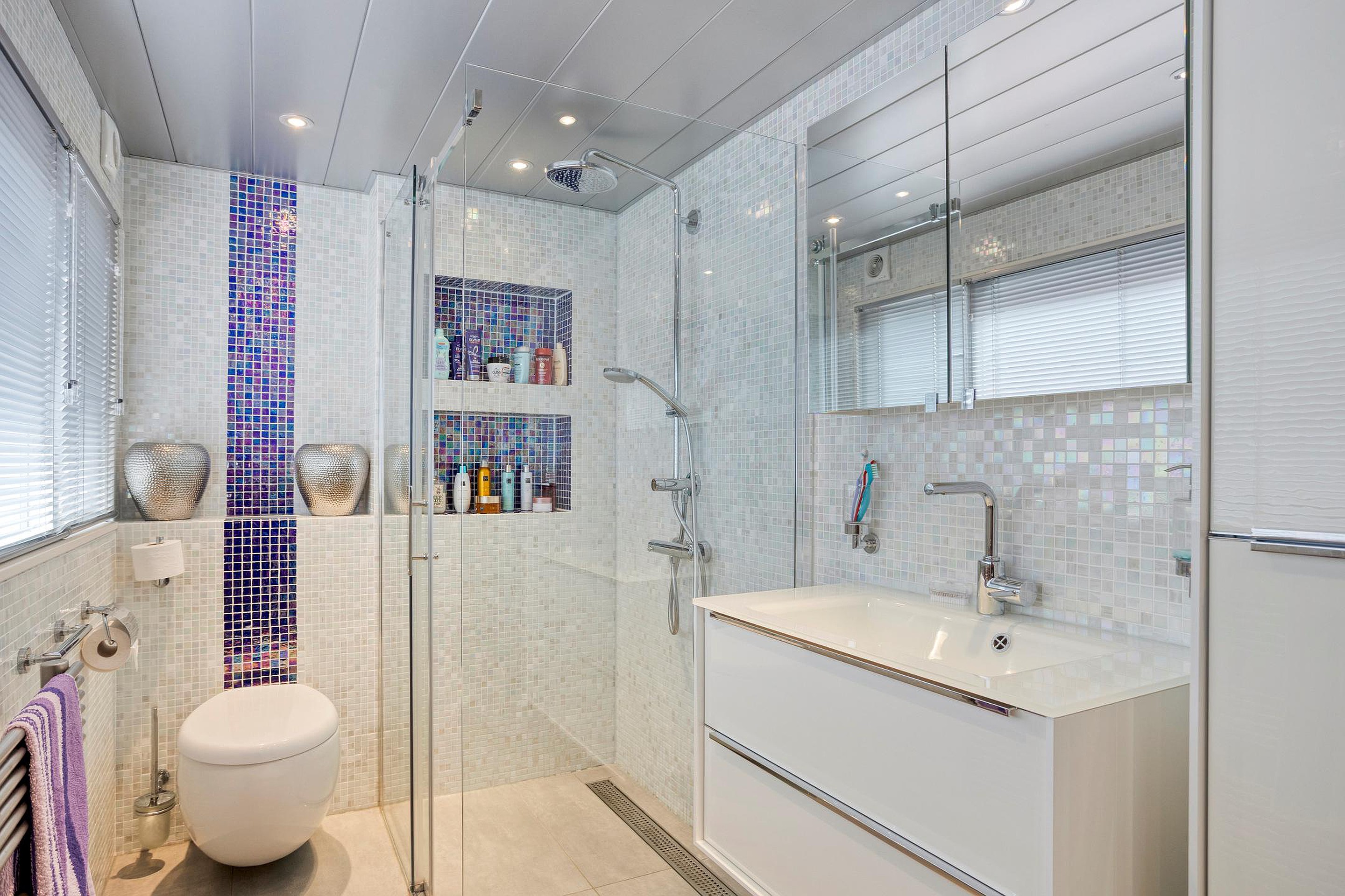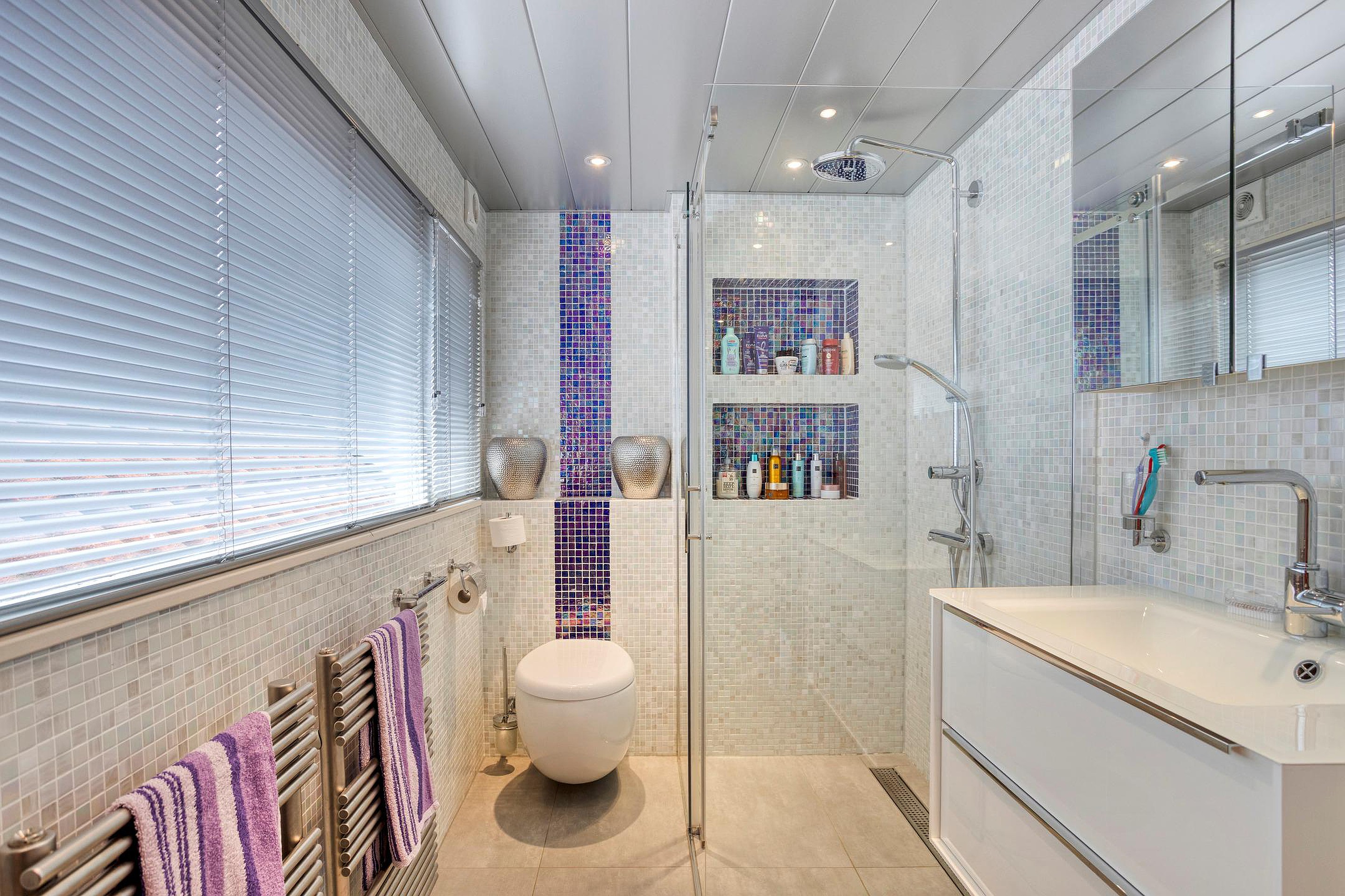 1e verdieping: overloop, 2 ruime slaapkamers waarvan één toegang met een loopdeur naar het dakterras. Keurige luxe badkamer met een inloopdouche, wastafelmeubel en 2e toilet.
