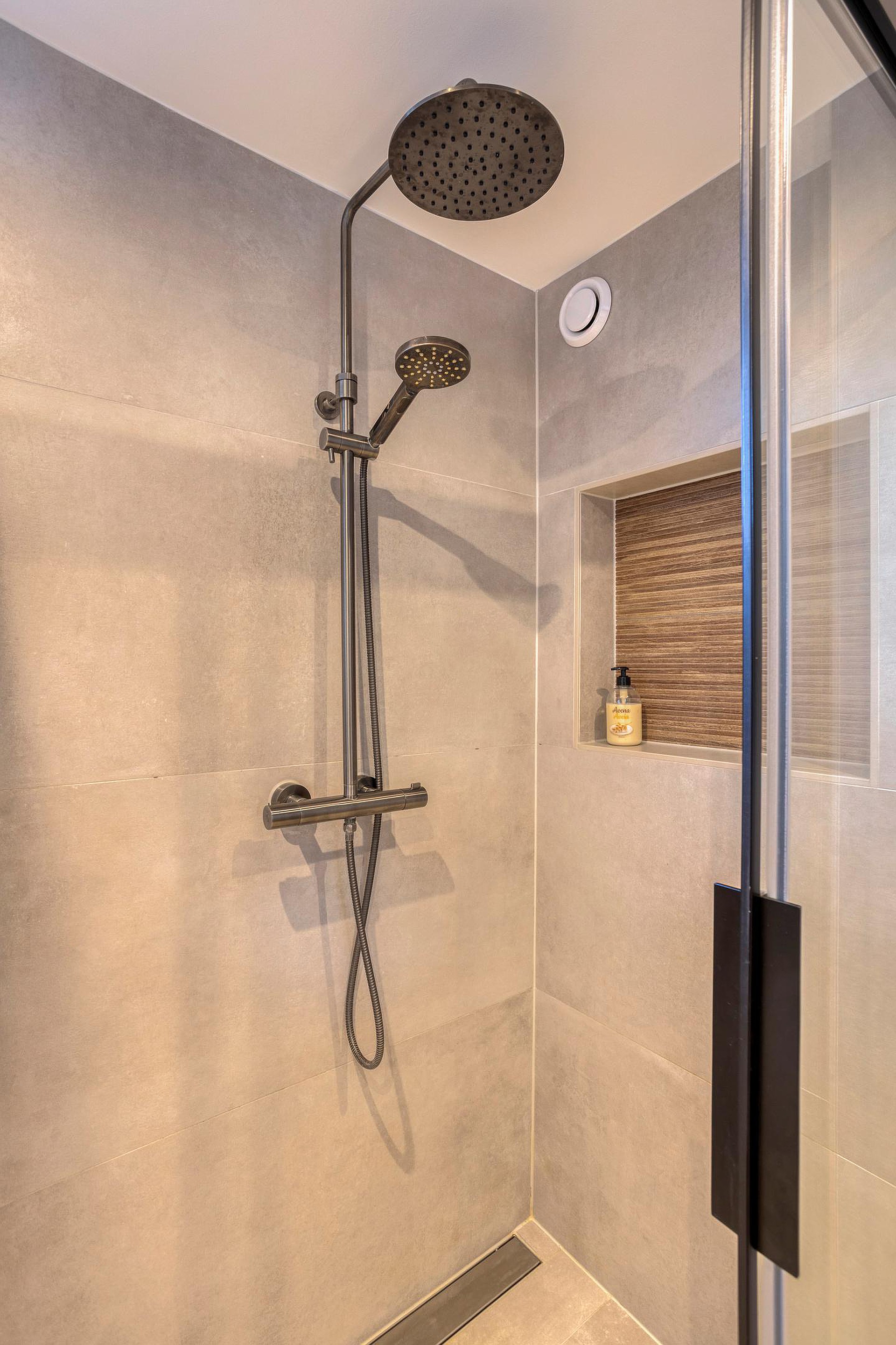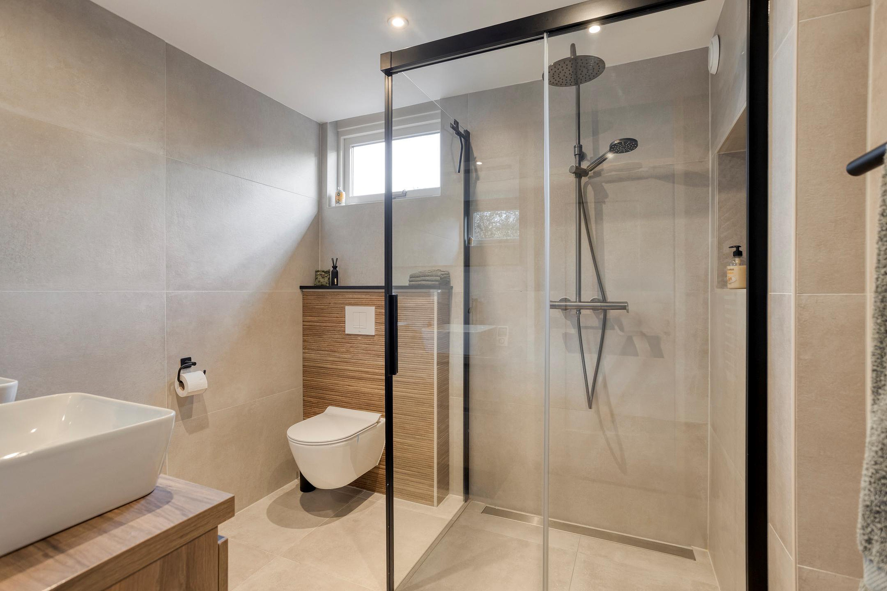 1e verdieping: ruime overloop, 3 ruime slaapkamers waarvan één met een vaste kast en één toegang naar het zonnig gelegen dakterras op het zuiden, luxe badkamer met een inloopdouche, dubbel wastafelmeubel en 2e toilet.