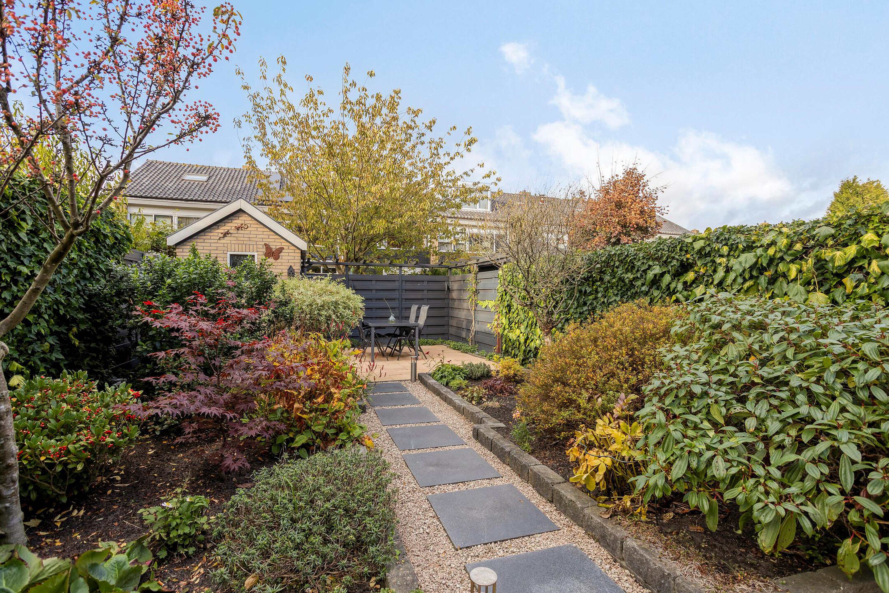 Begane grond: entree, hal met meterkast, toilet met een fonteintje, trapkast, ruime woonkamer, moderne keuken met diverse inbouwapparaten en een schuifpui/ loopdeur naar de diepe achtertuin (N) met vrijstaande stenen berging en achterom. Tevens is er aan de voorzijde een inpandige berging.