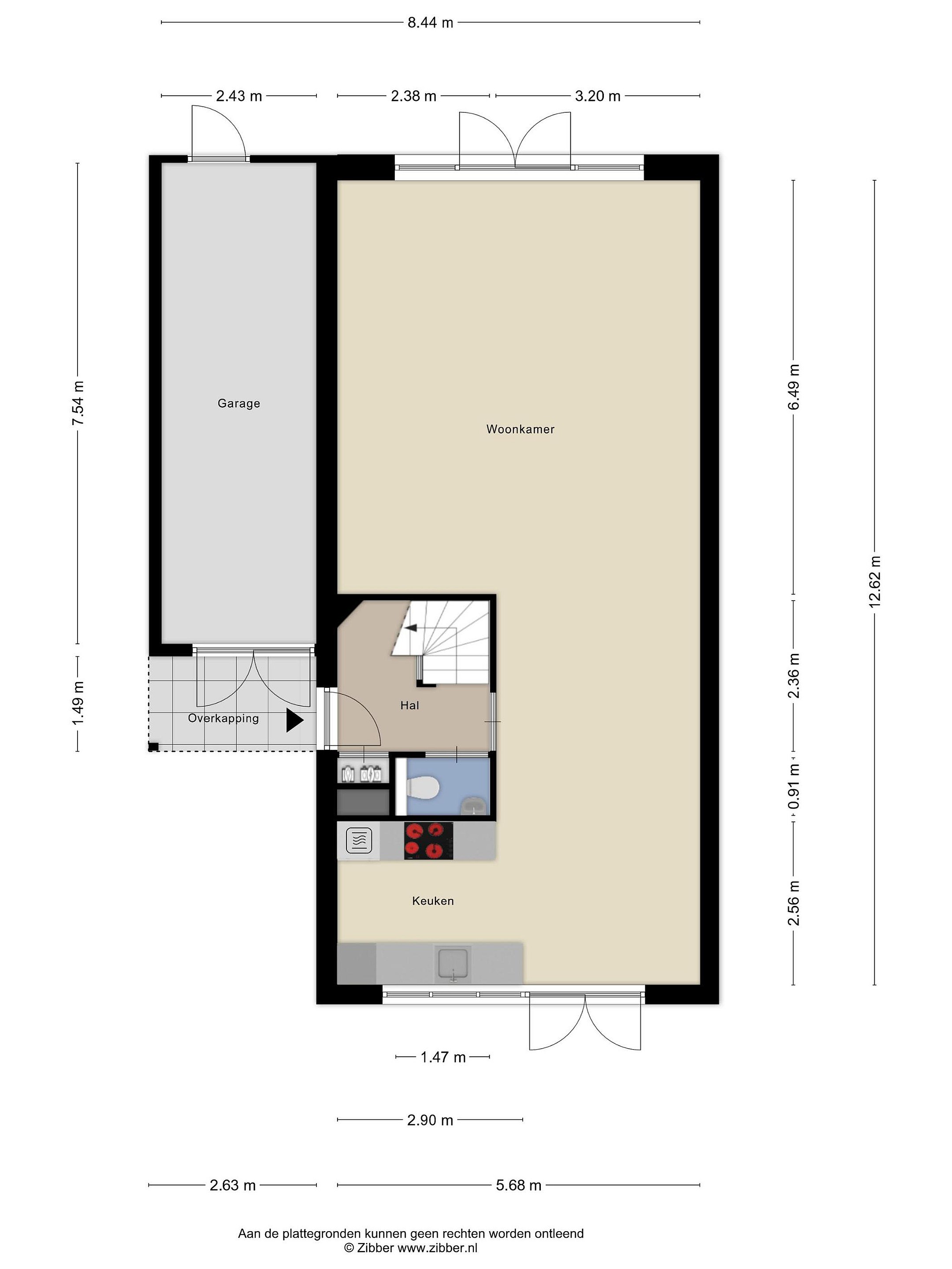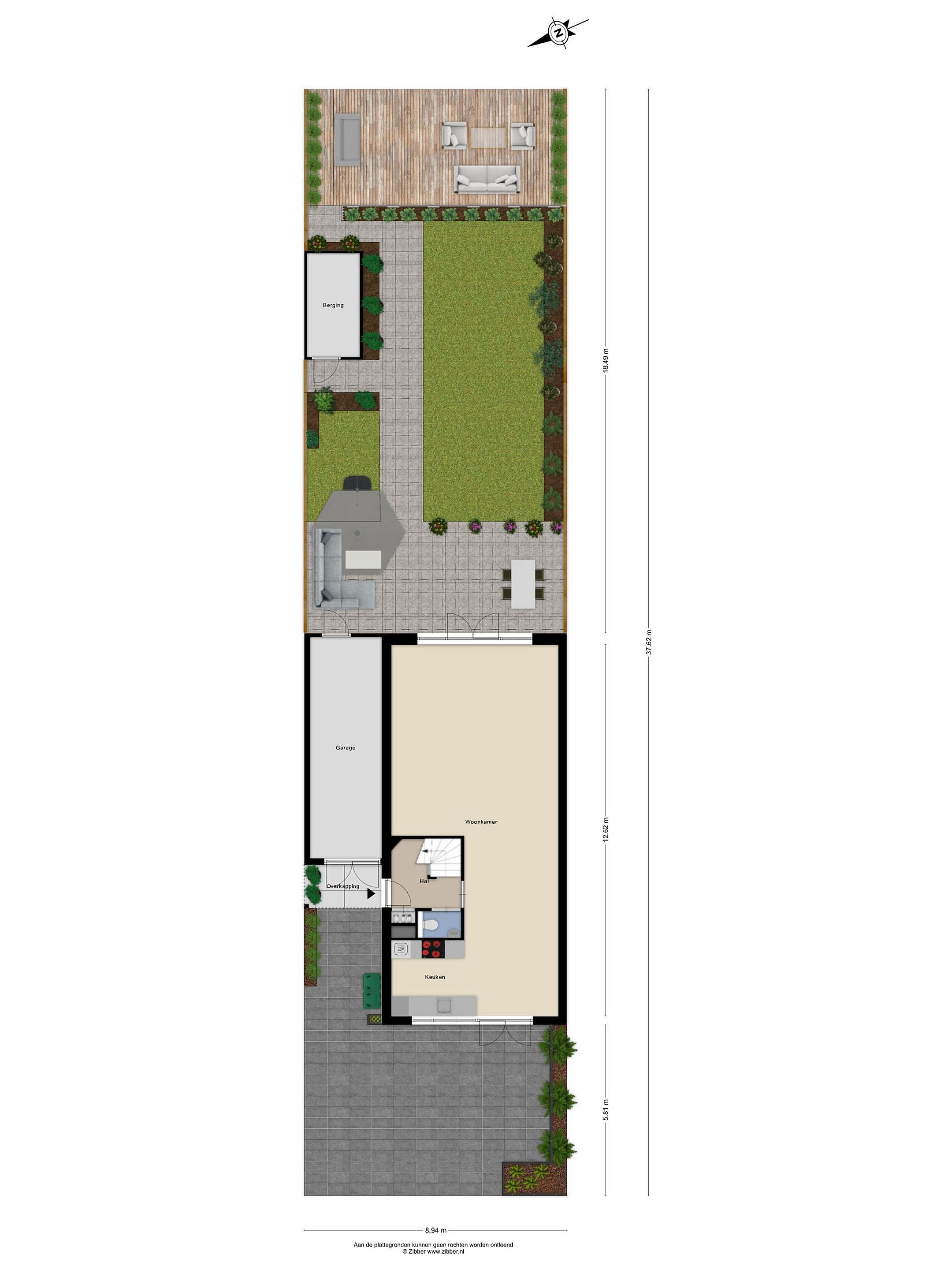 Begane grond: voortuin met oprit voor meerdere auto’s, entree, hal met meterkast, toilet met een fonteintje, ruime en lichte woonkamer, open keuken met inbouwapparatuur en zowel voor- als achter openslaande deuren. Diepe achtertuin (Z/O) met terrassen en vlonder aan het water, vrijstaande houten berging en 7,5 meter diepe berging naast de woning met achterom.