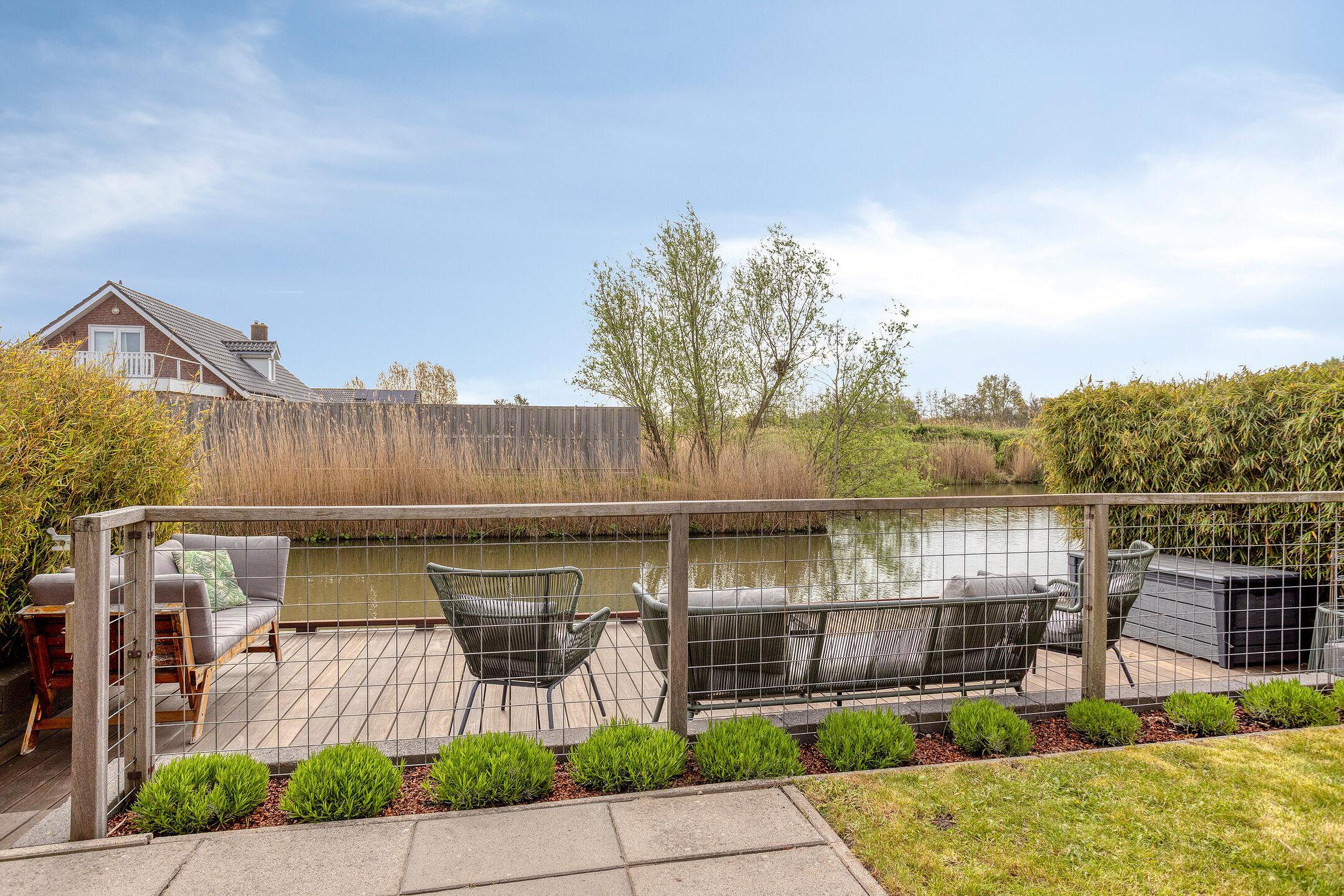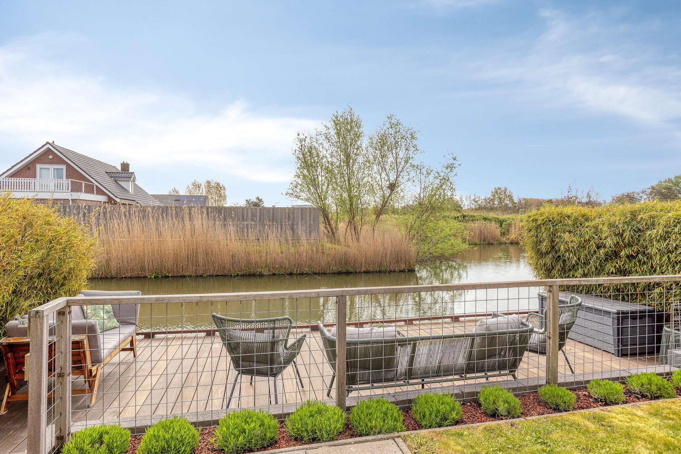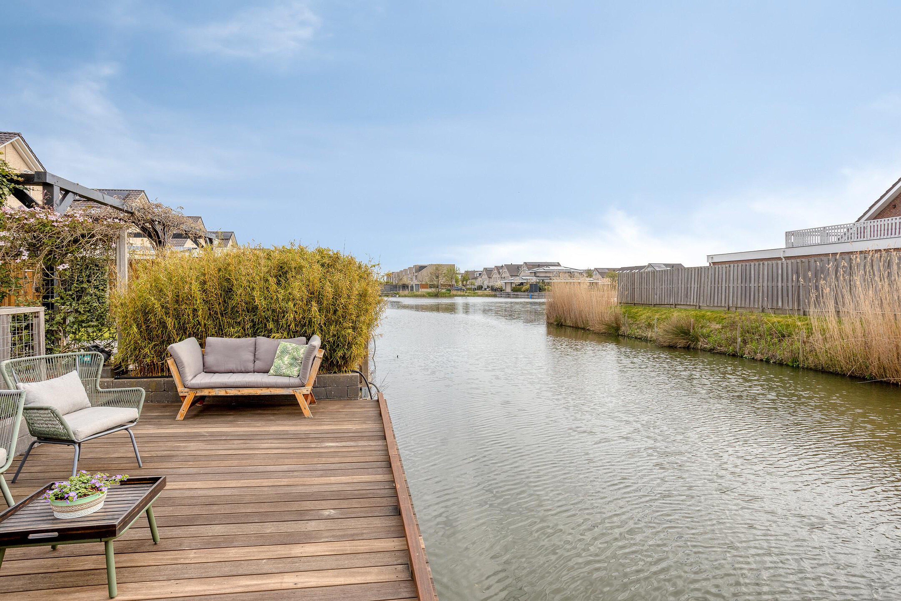 Bijzonderheden : Berging van 7,5 meter diep met garagedeur naast de woning, diepe tuin aan het water, uitbouw, oprit voor meerdere auto’s en laadpaal.