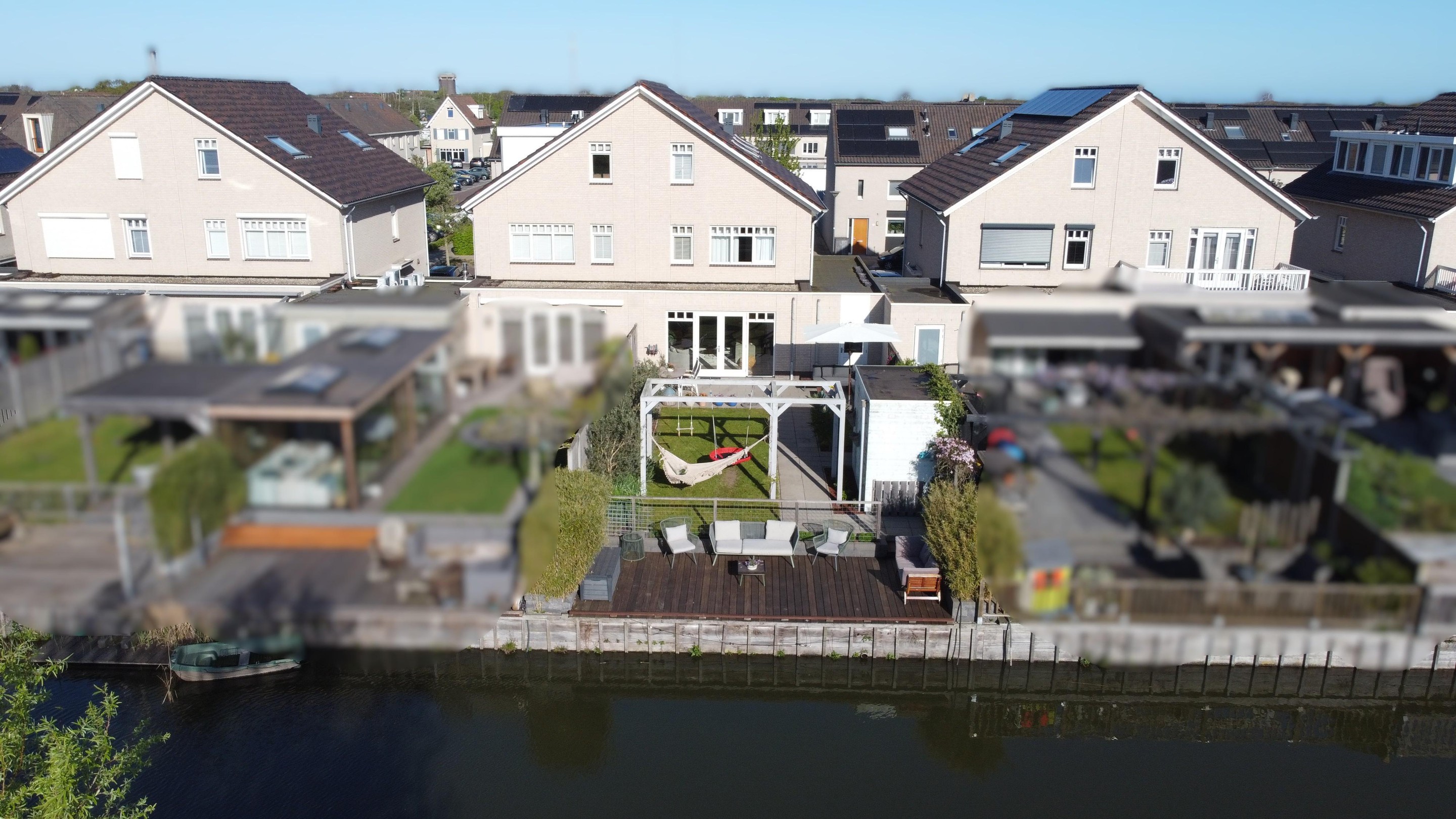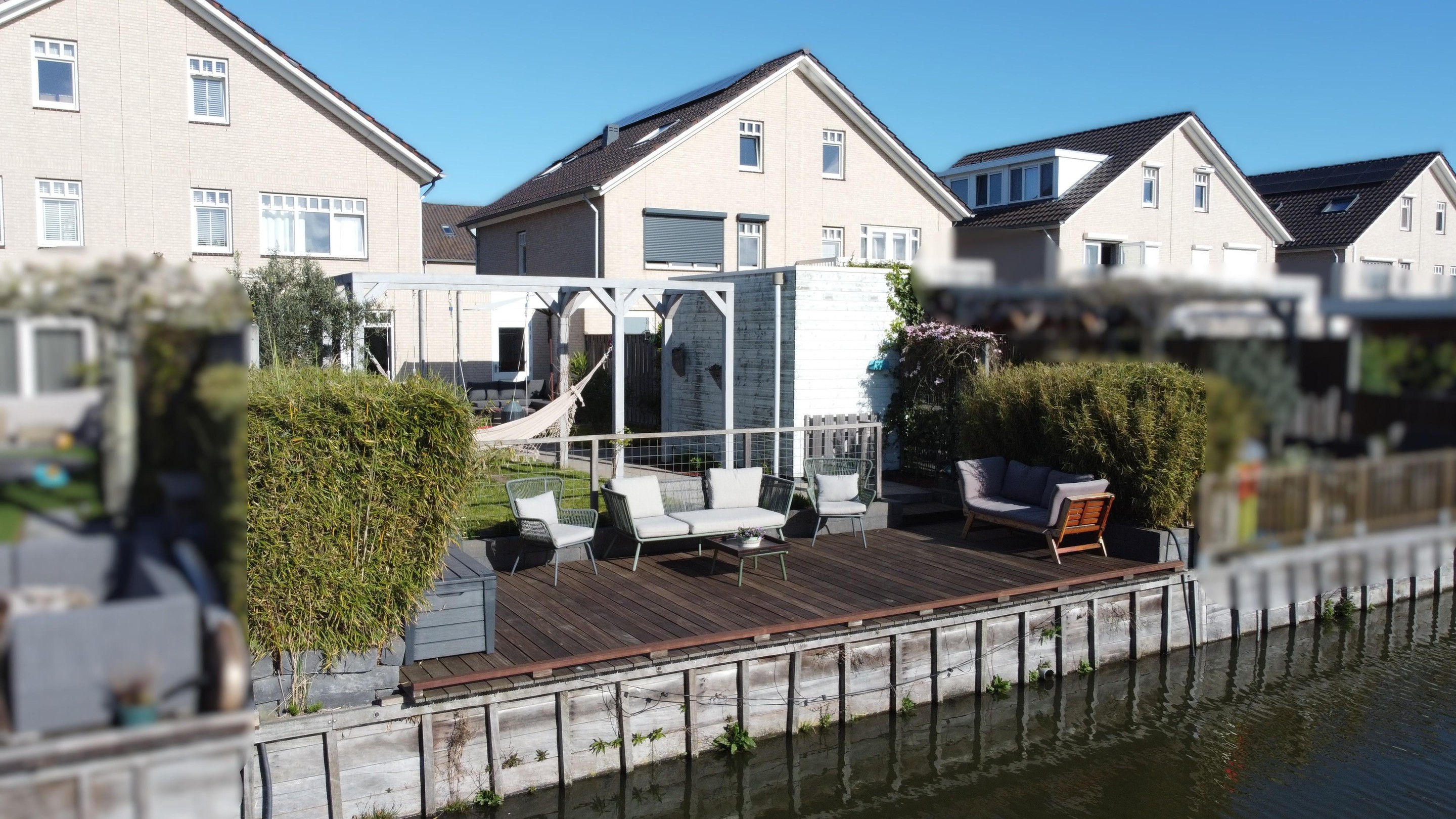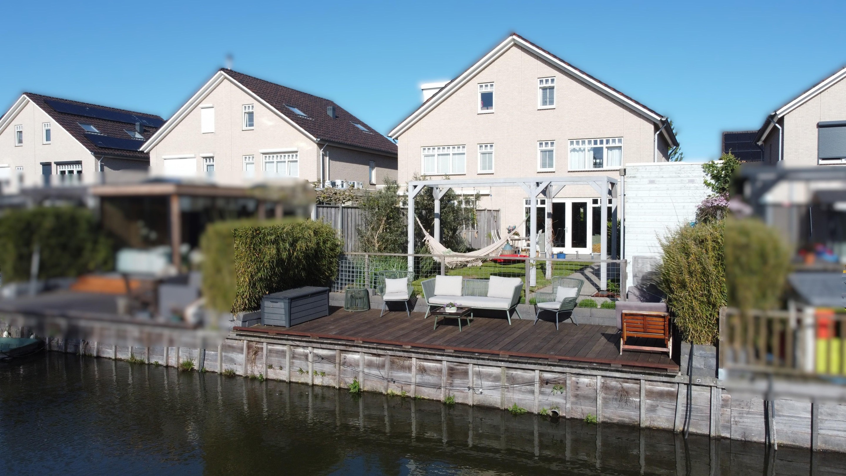 Bijzonderheden : Berging van 7,5 meter diep met garagedeur naast de woning, diepe tuin aan het water, uitbouw, oprit voor meerdere auto’s en laadpaal.