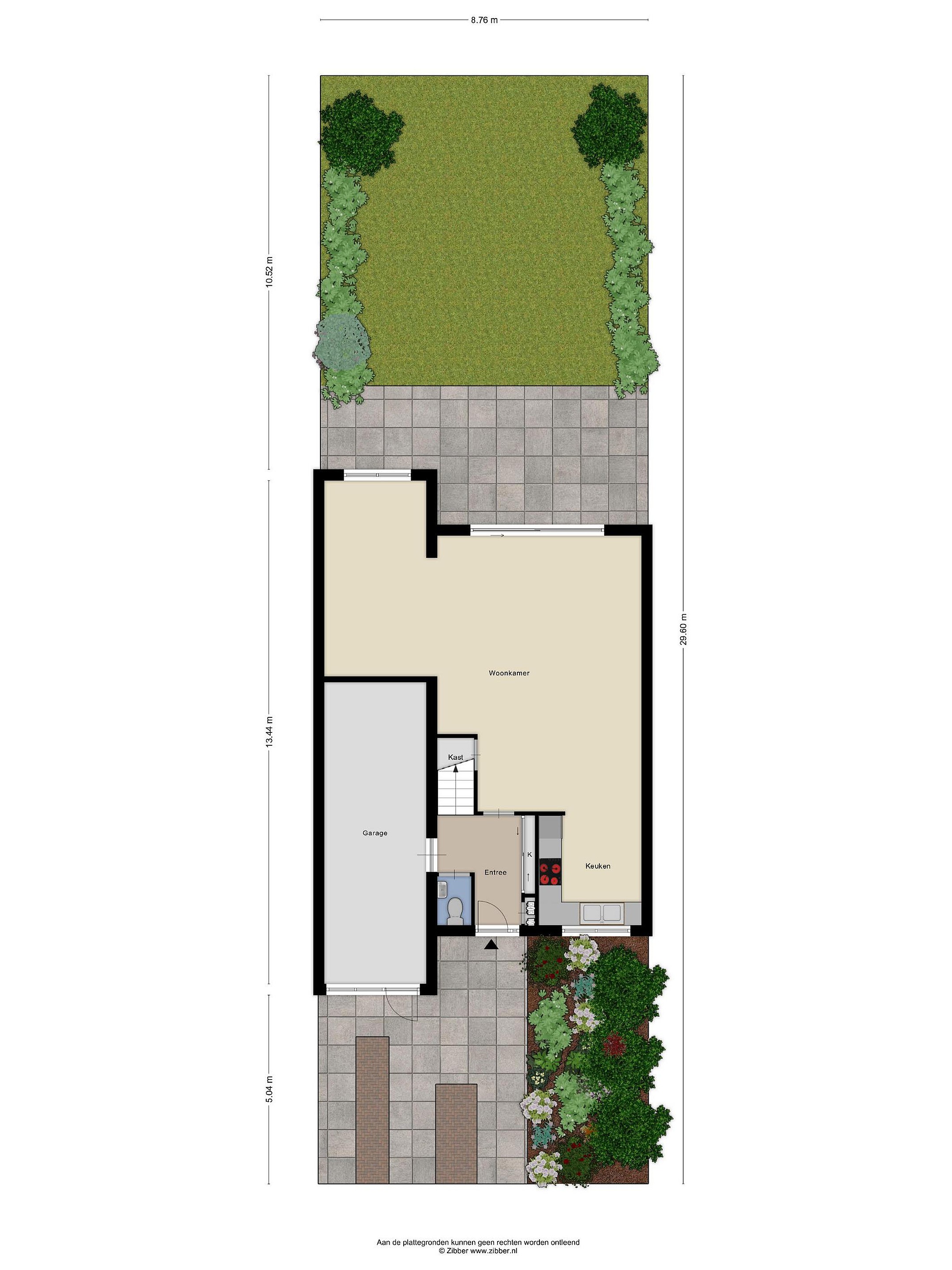 Begane grond: entree, hal met meterkast, toilet met een fonteintje, doorgang naar garage, ruime woonkamer, open keuken met enkele inbouwapparaten en een schuifpui naar de diepe achtertuin (Z/W). Bij de bouw van de woning was al rekening gehouden met mogelijkheden zoals een extra slaapkamer en badkamer op de begane grond.