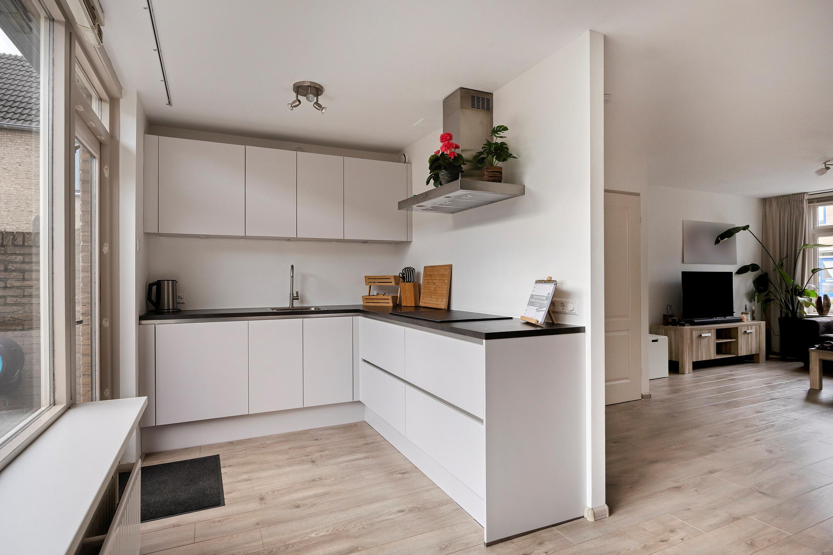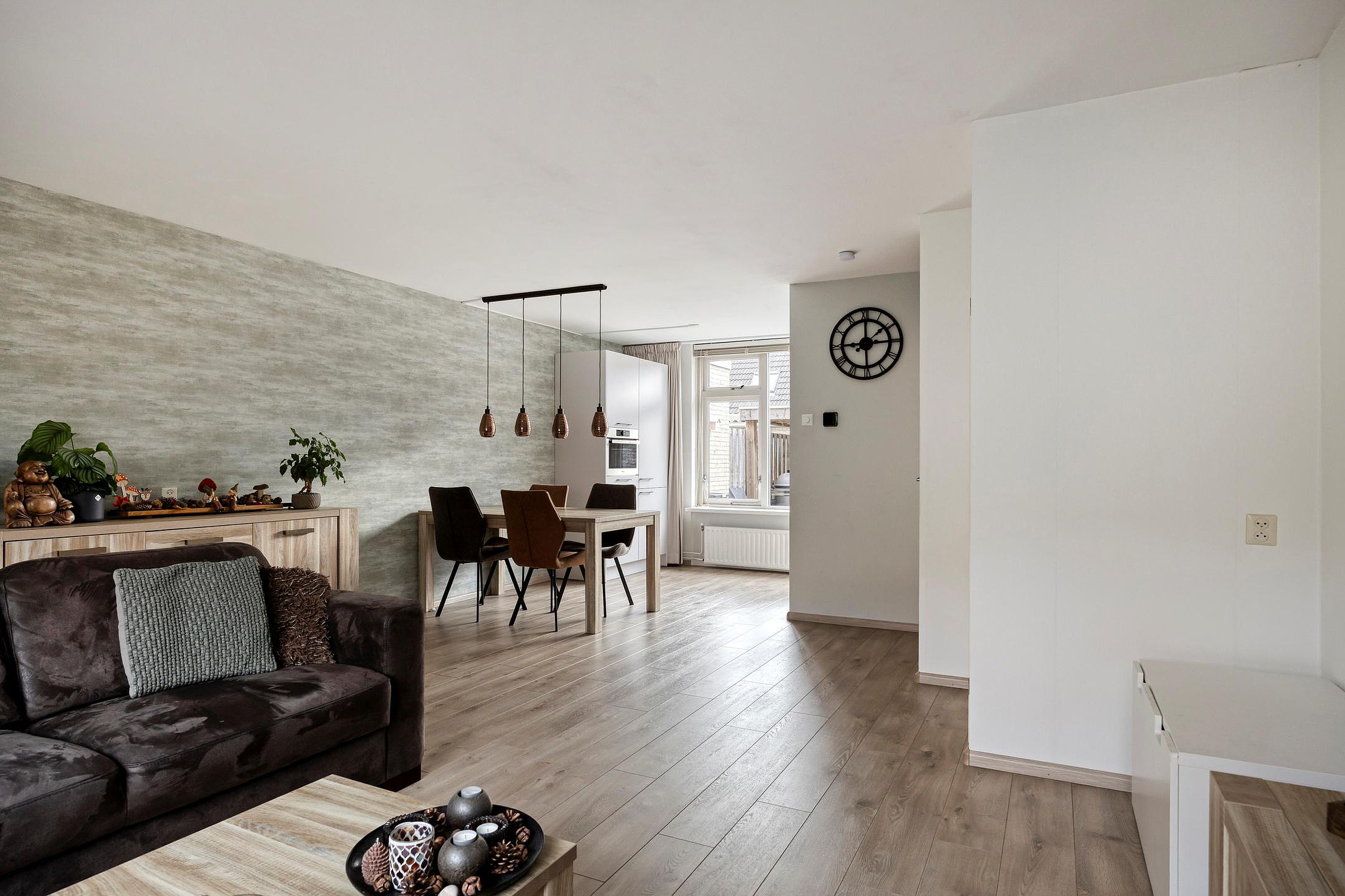 Begane grond: ruime entree, toilet met een fonteintje, gang met meterkast, trapkast, ruime woonkamer met trapopgang naar de 1e verdieping, luxe halfopen keuken met diverse inbouwapparaten en een loopdeur naar de diepe achtertuin (Z/O) met een overkapping, vrijstaande stenen berging en achterom.