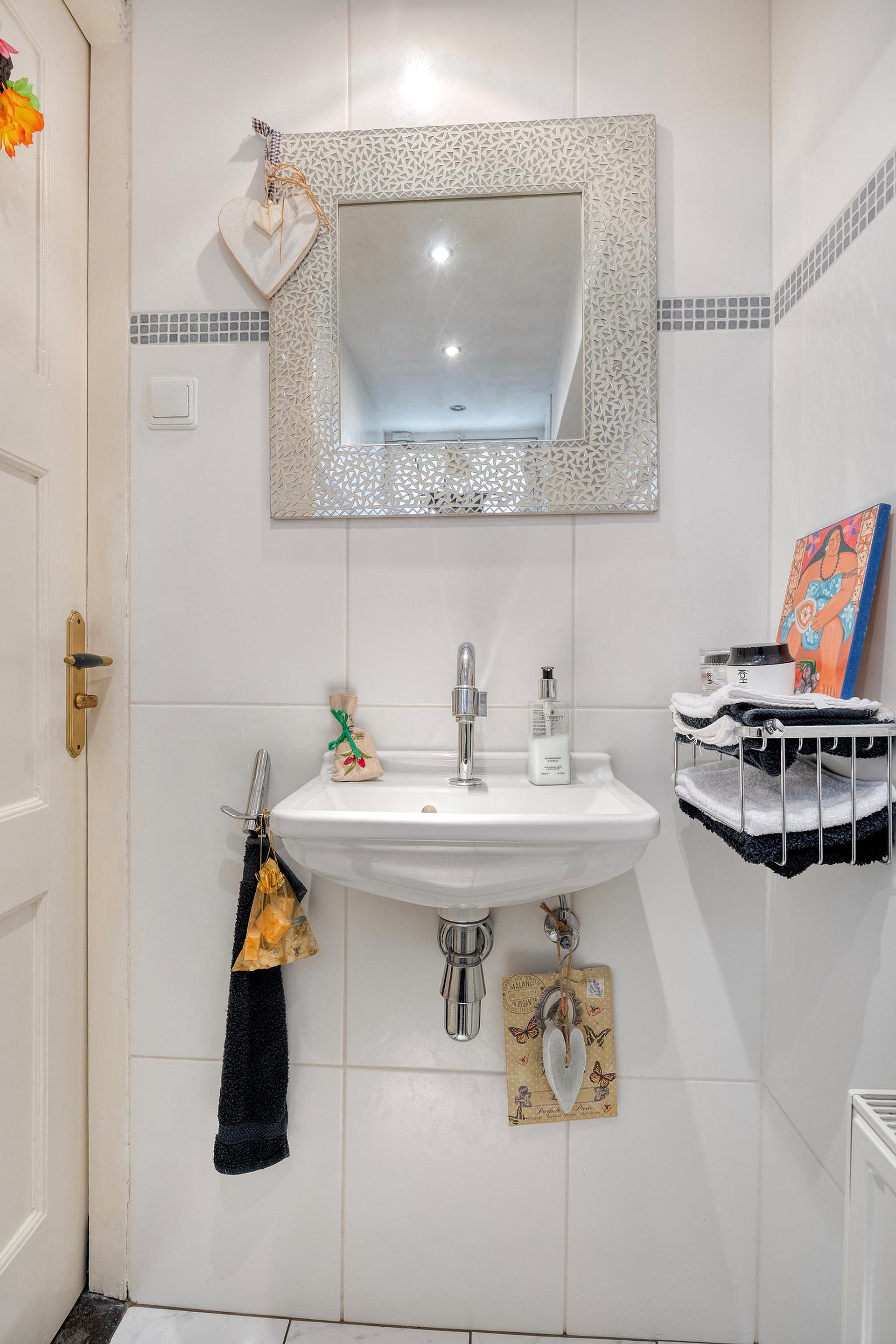 Begane grond: entree, ruime hal met meterkast en opbergkast, zwevend toilet met een fonteintje, ruime en lichte doorzonwoonkamer met hoge plafonds en deels vloerwarming, keuken met enkele inbouwapparaten, serre-aanbouw en een schuifpui naar de ruime achtertuin op het zuiden.