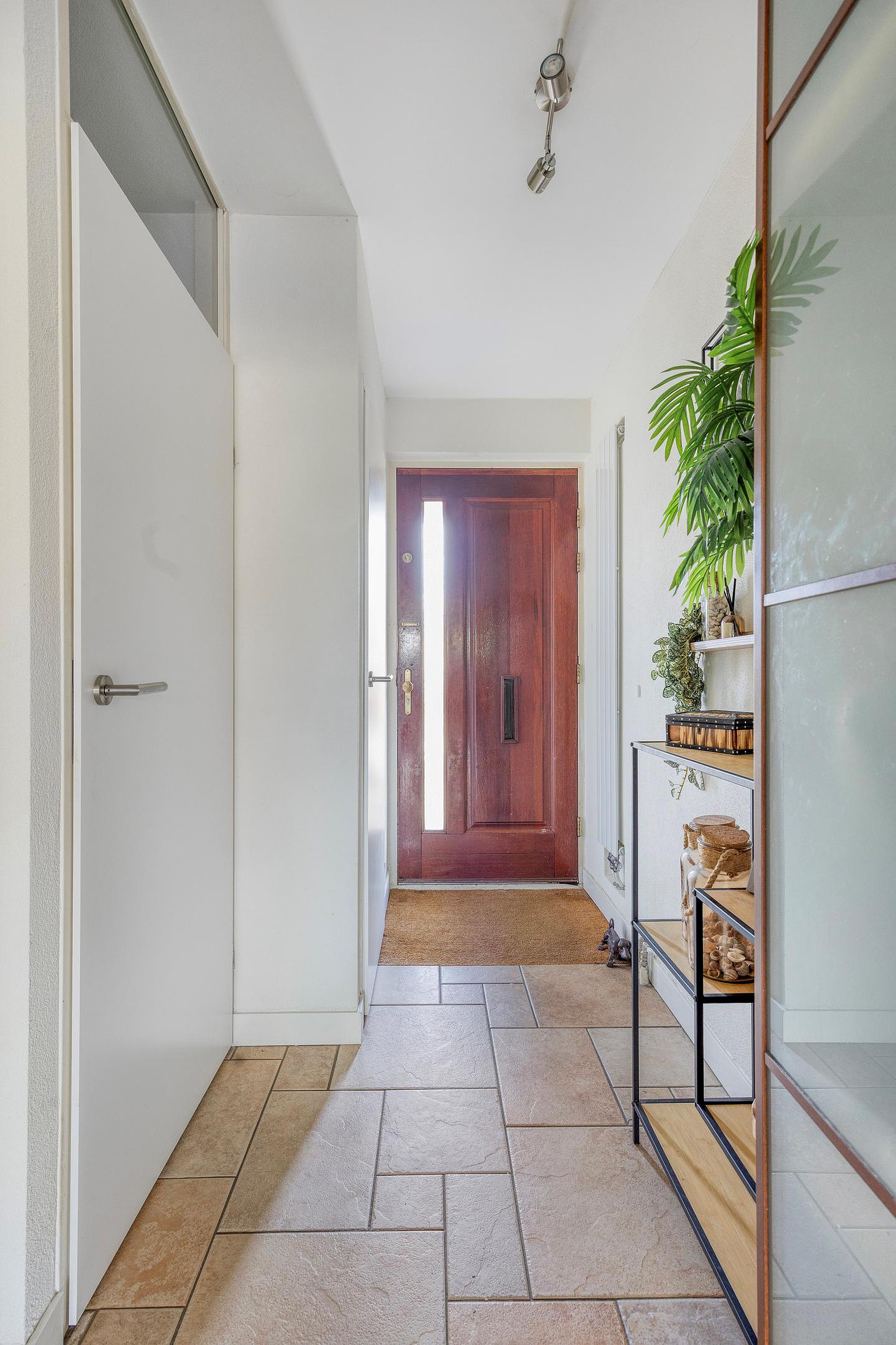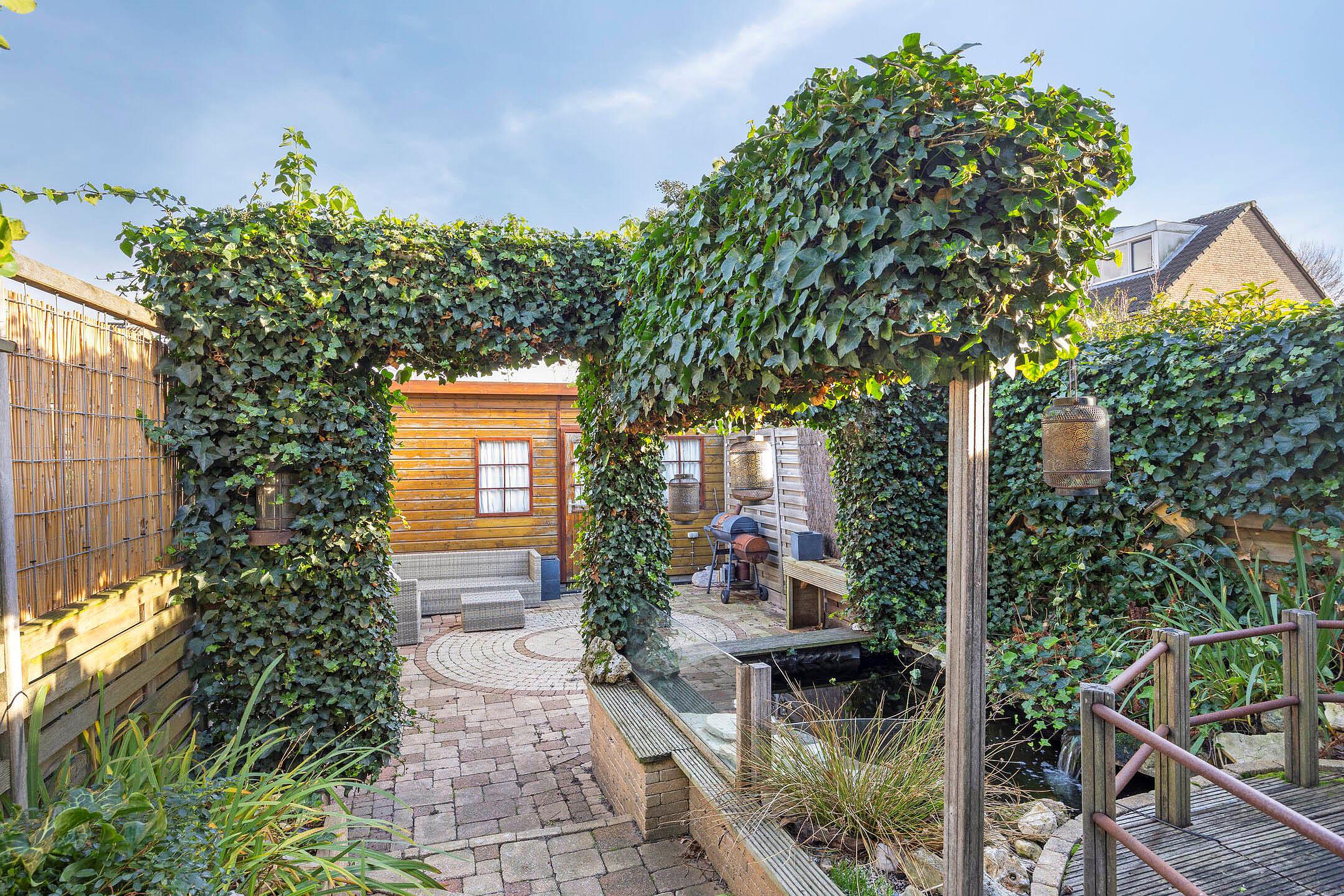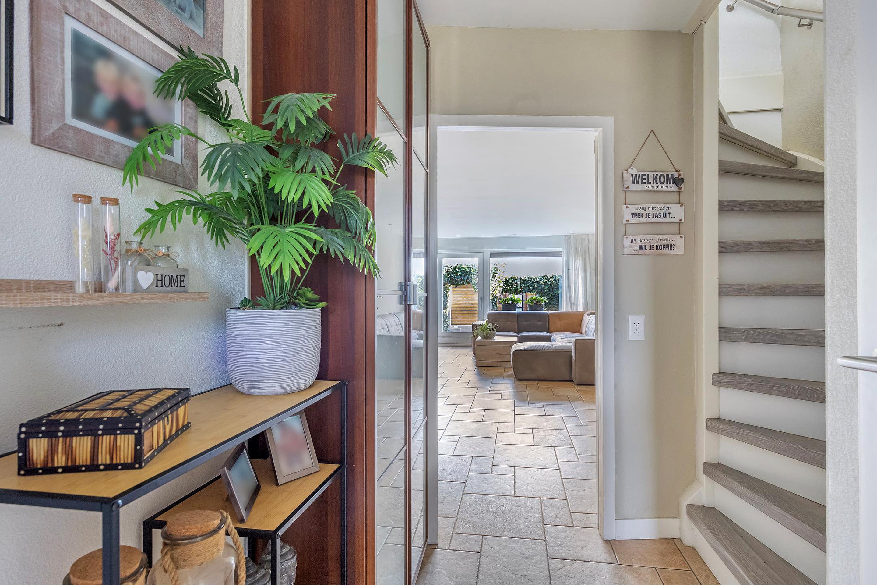 Begane grond: entree, aanpandige berging met opstelplaats wasmachine/droger, toilet met een fonteintje, trapkast, ruime woonkamer, open keuken met diverse inbouwapparaten, royale woonkamer door uitbouw en schuifpui naar de diepe achtertuin (O) met zonwering, vrijstaande houten berging en achterom.
