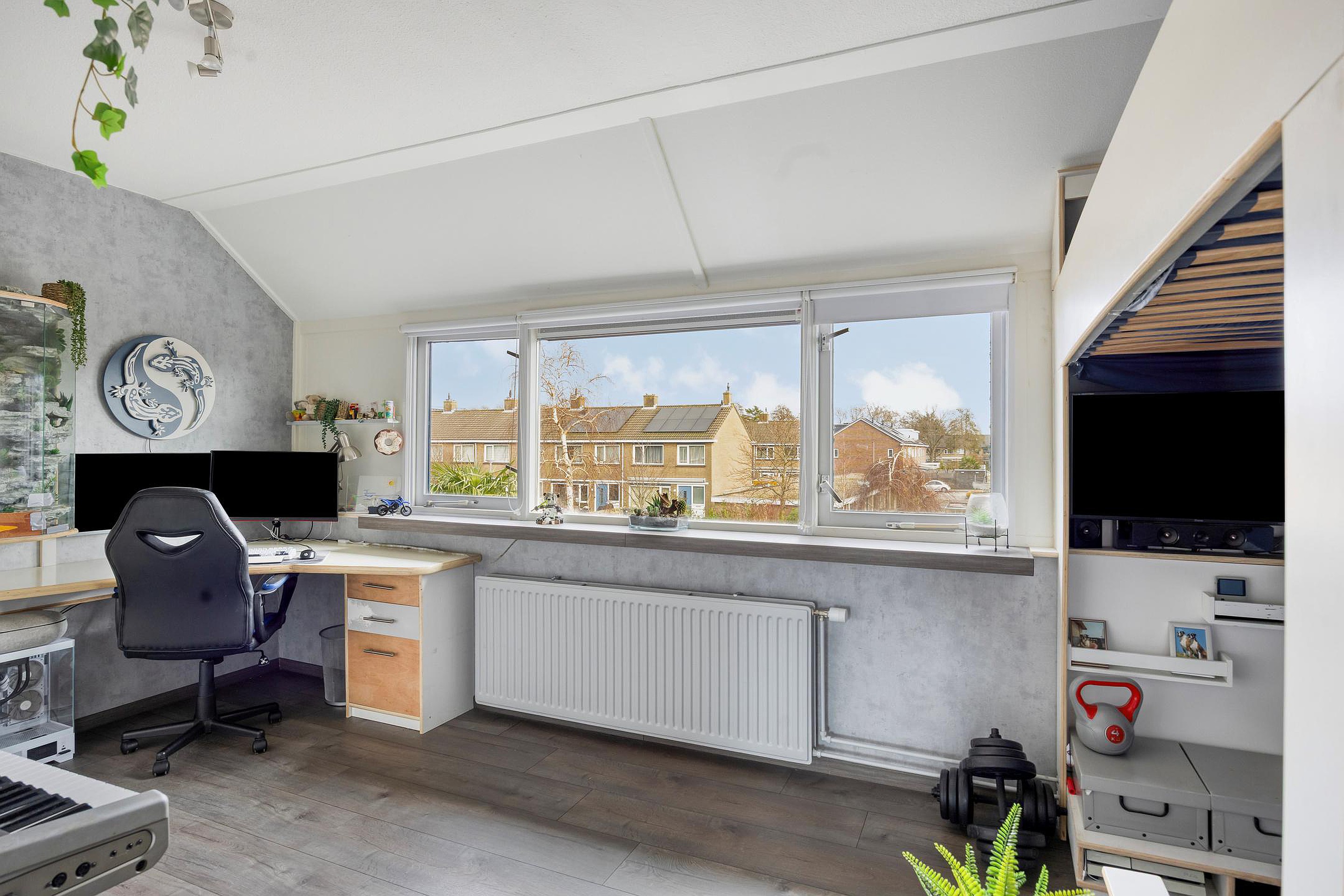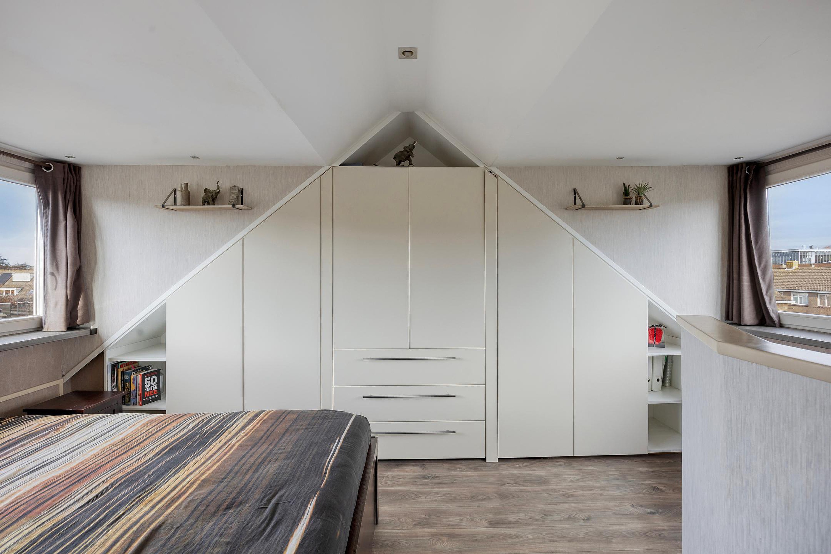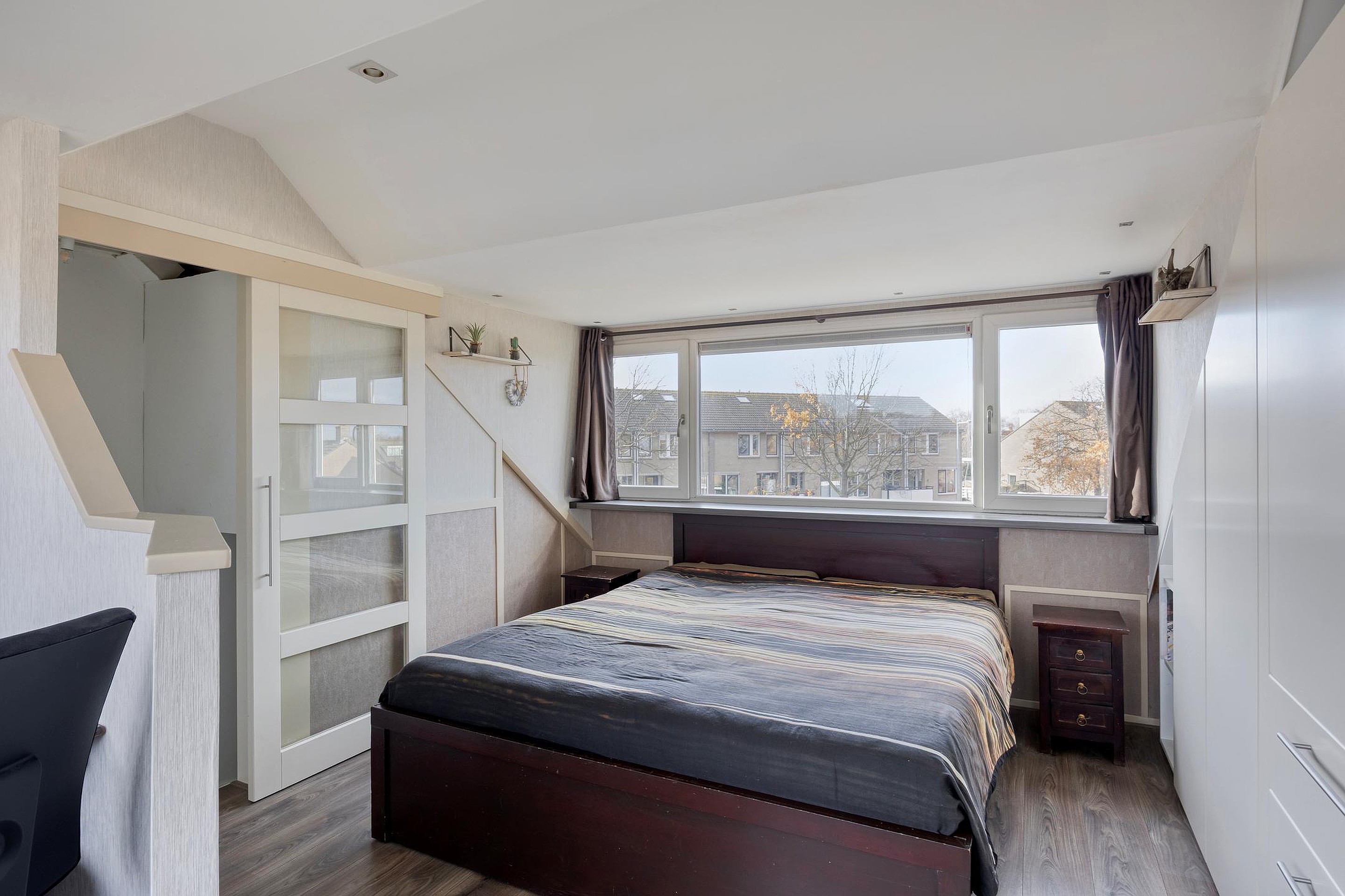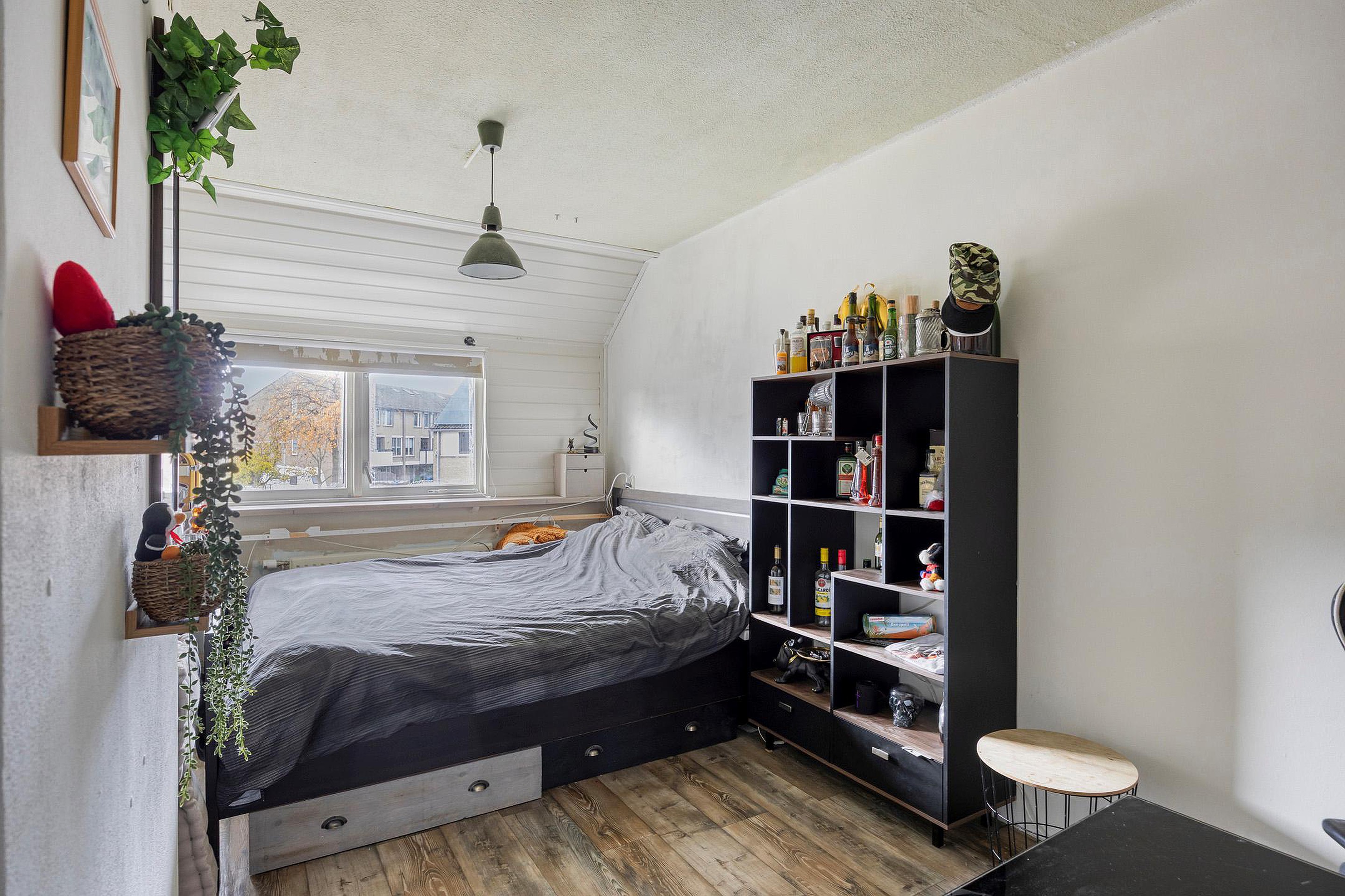 2e verdieping: opstelplaats CV-ketel, 3e slaapkamer met een schuifdeur en veel lichtinval door de dakkapellen aan beide zijden, inbouwkasten en bergruimte achter de knieschot.