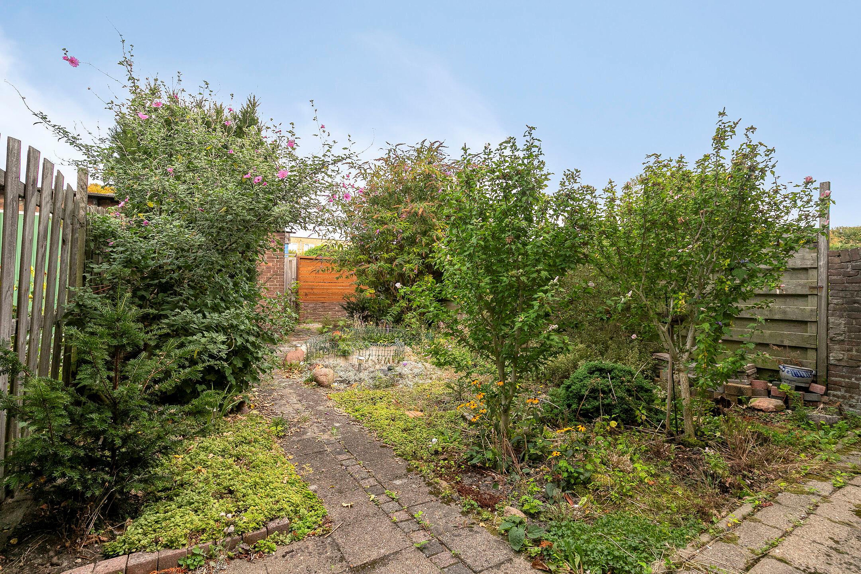 Begane grond: entree, hal met meterkast en trapkast/kelder, toilet, ruime woonkamer, gesloten keuken met een loopdeur naar de diepe achtertuin (N/O) met vrijstaande stenen berging en achterom.