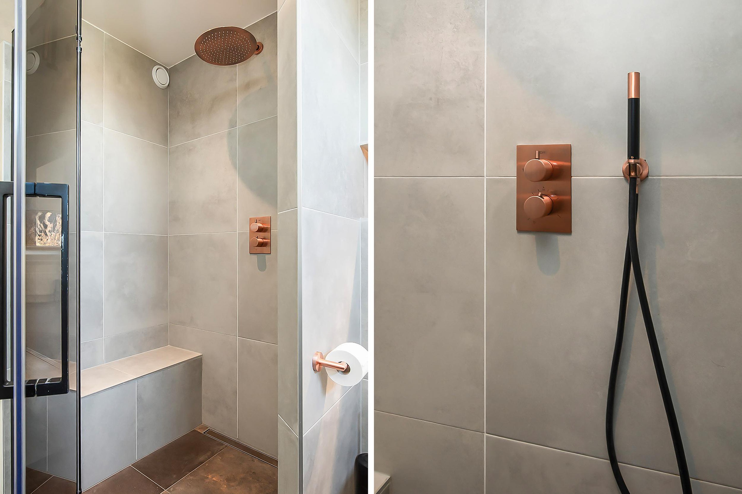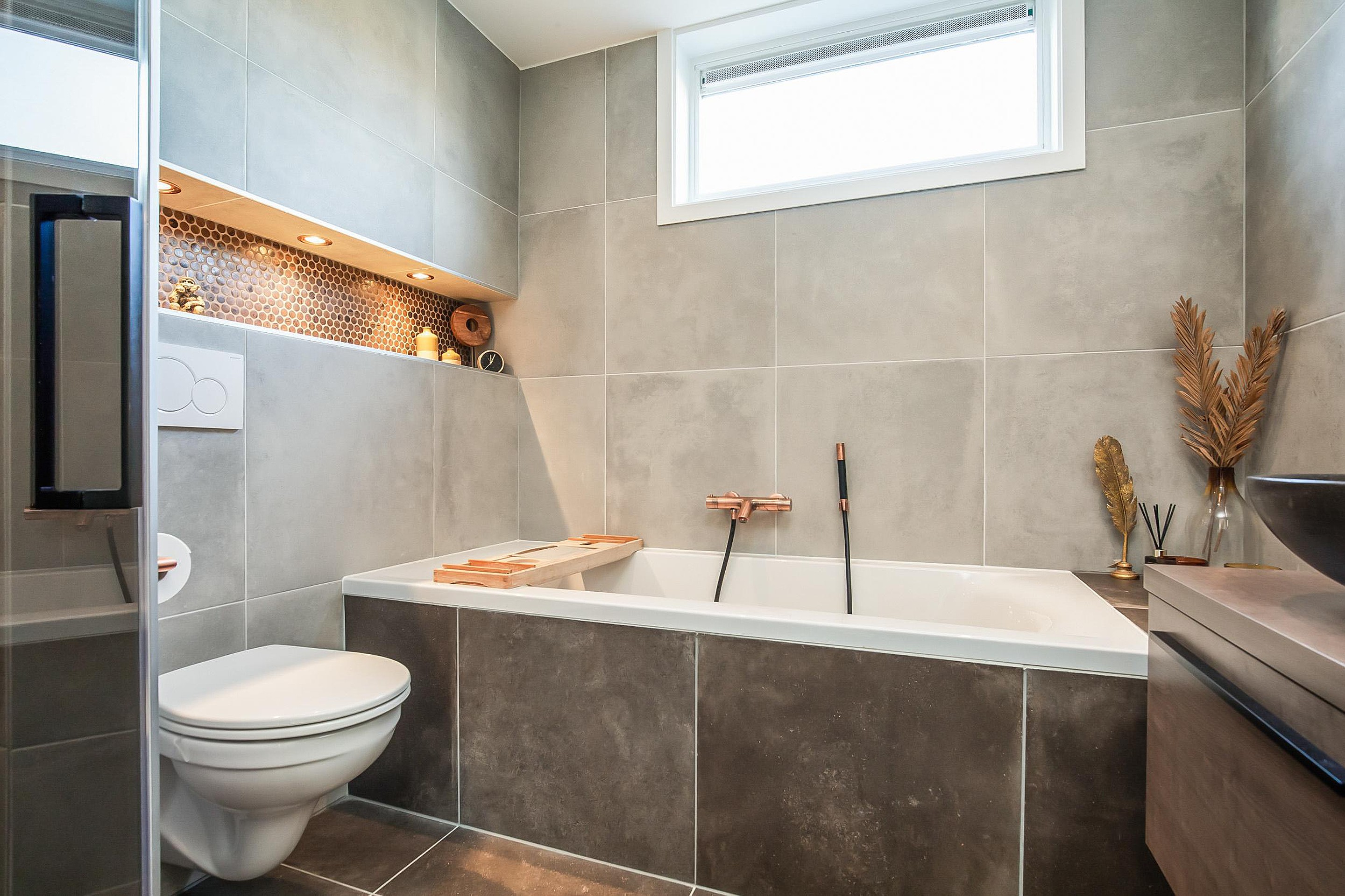 -Luxe badkamer met ligbad, ruime inloopdouche met een zitje, vloerverwarming, tweede toilet en gunmetal sanitair;