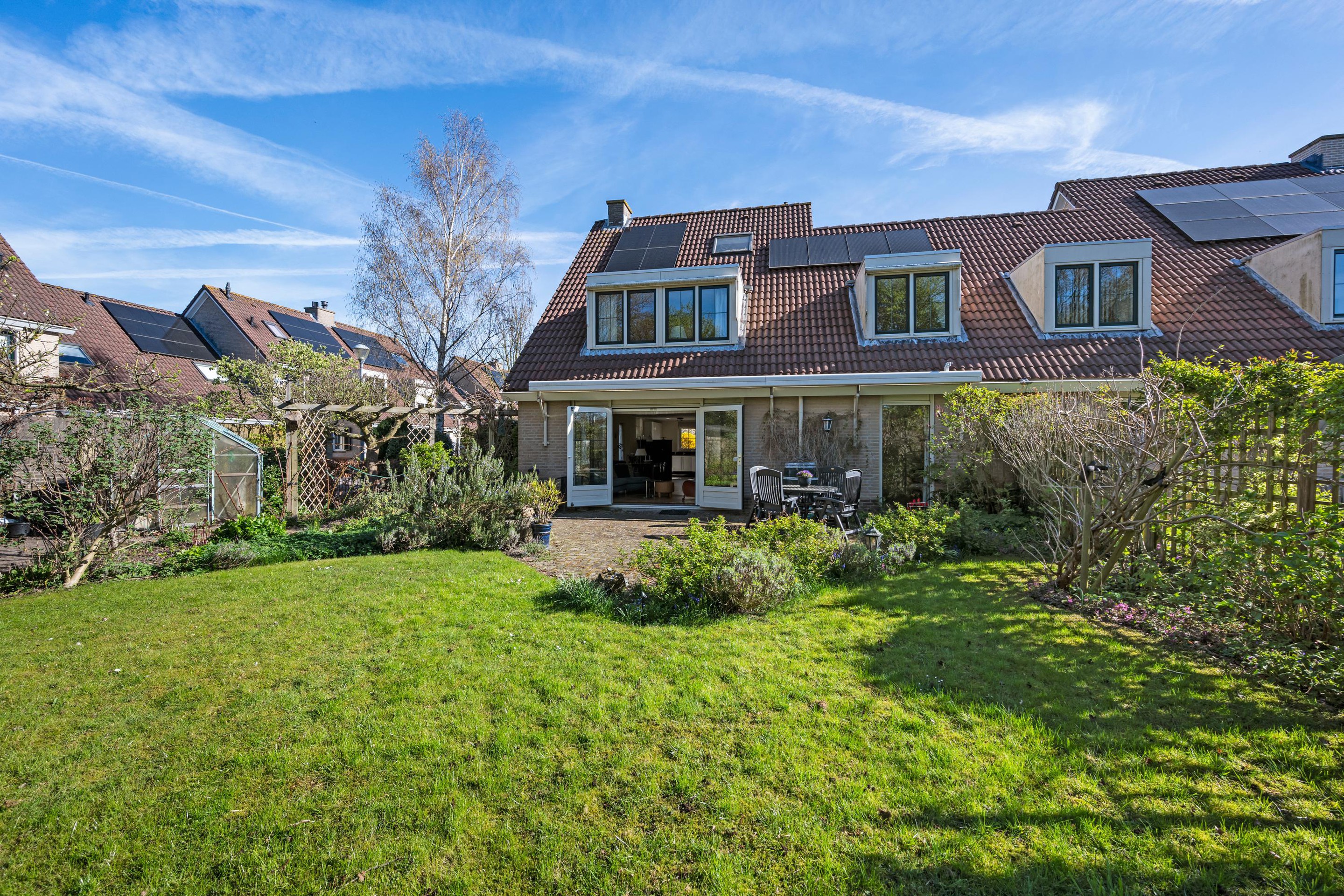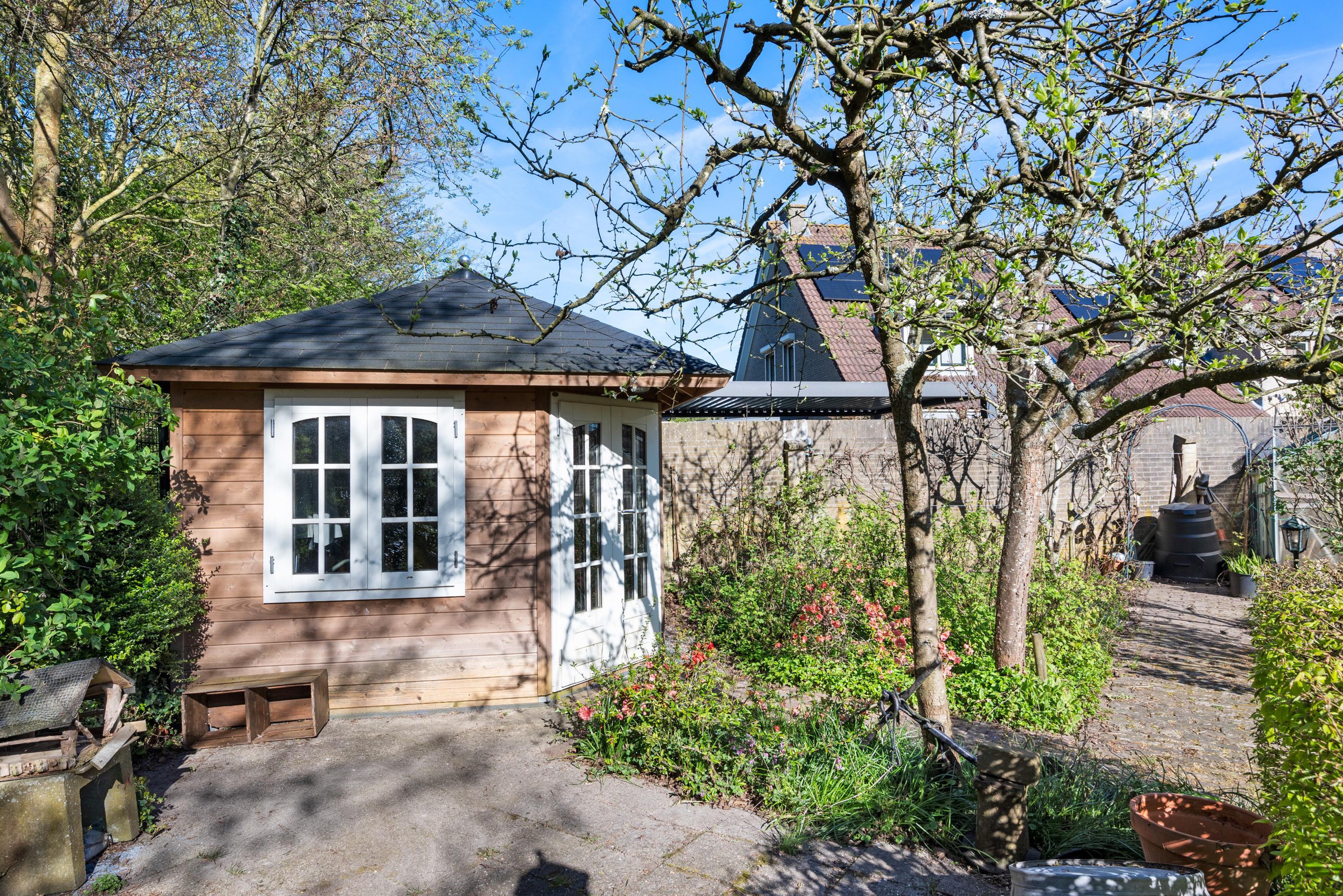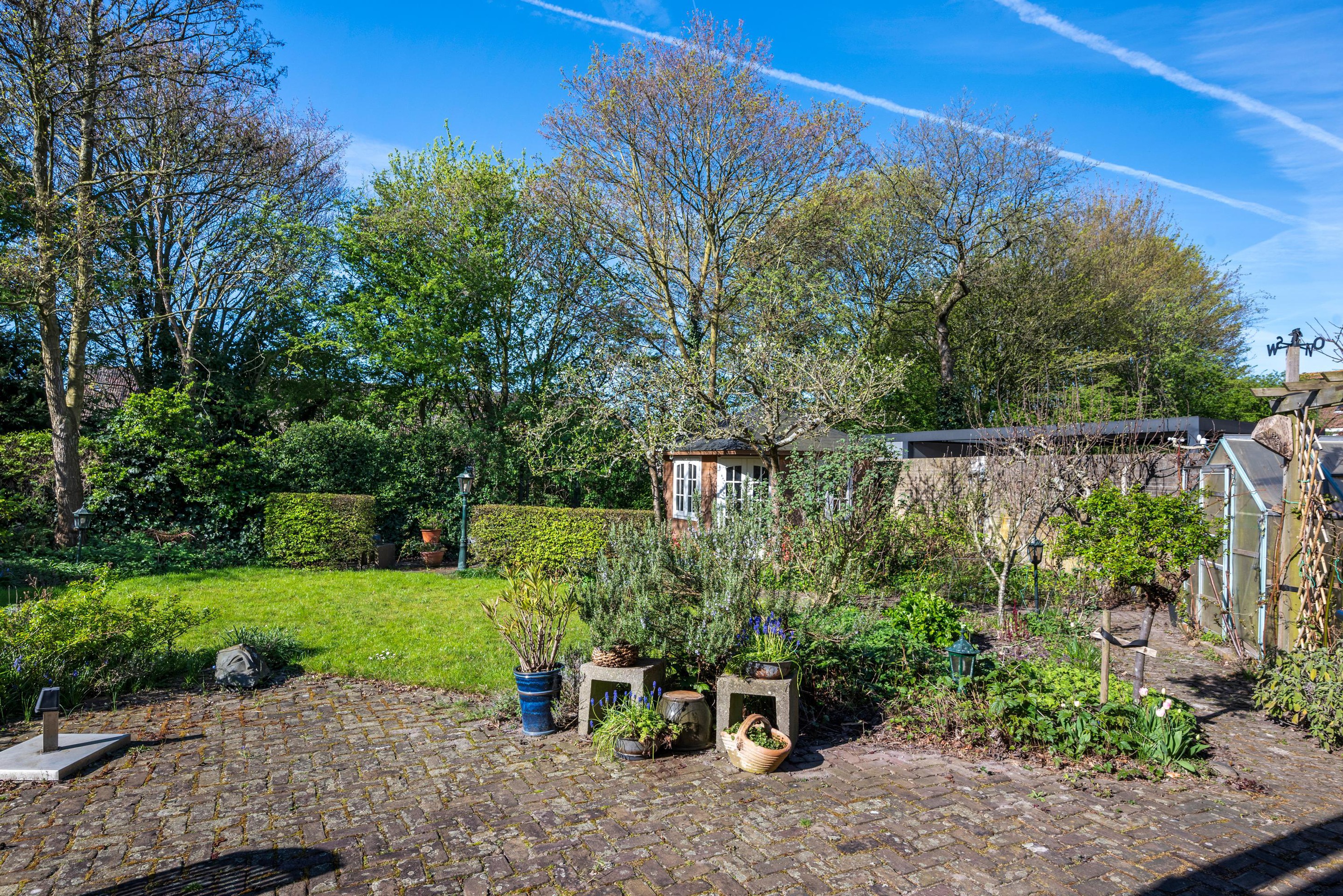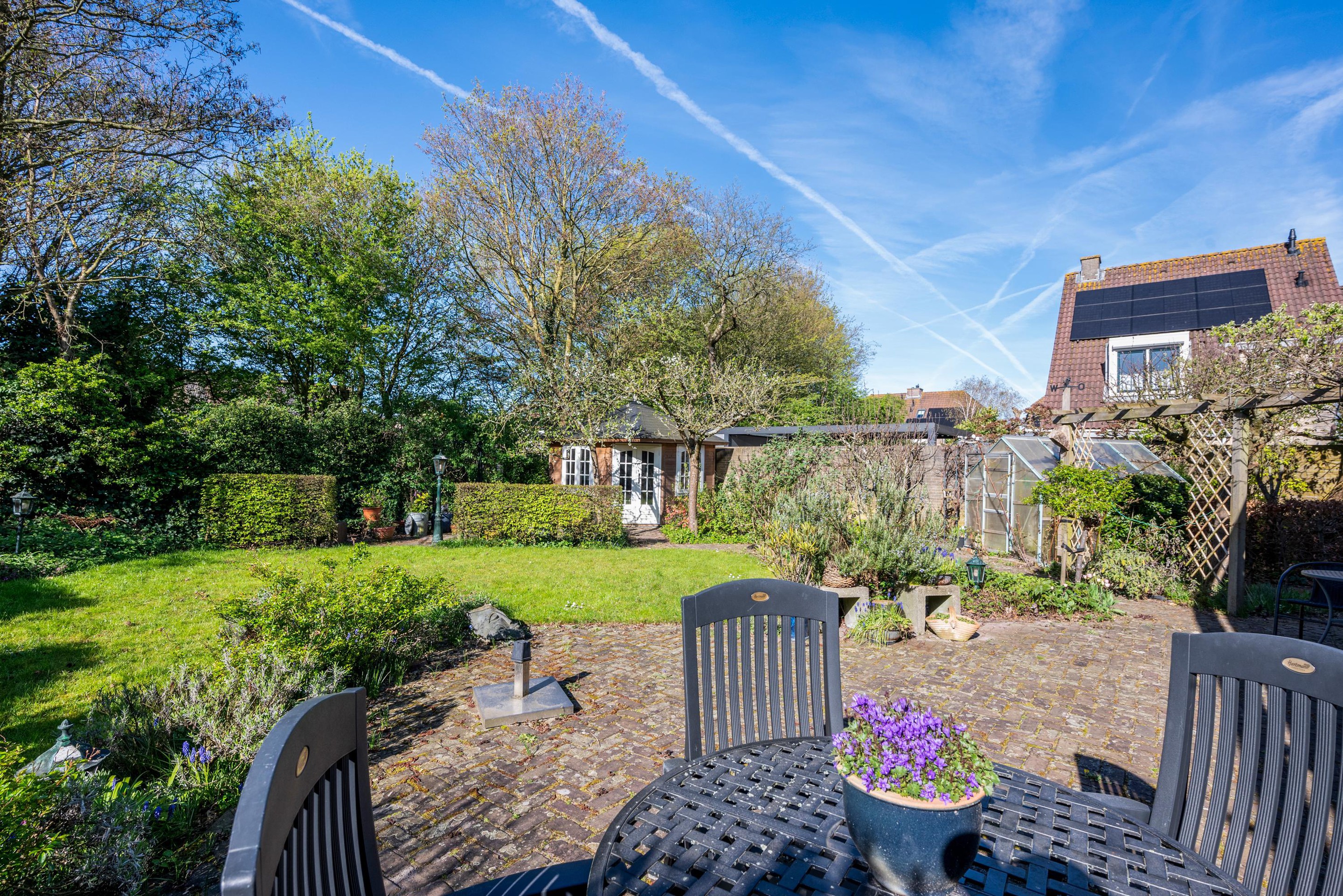 - Zonnige achtertuin (zuidwest) grenzend aan groen.