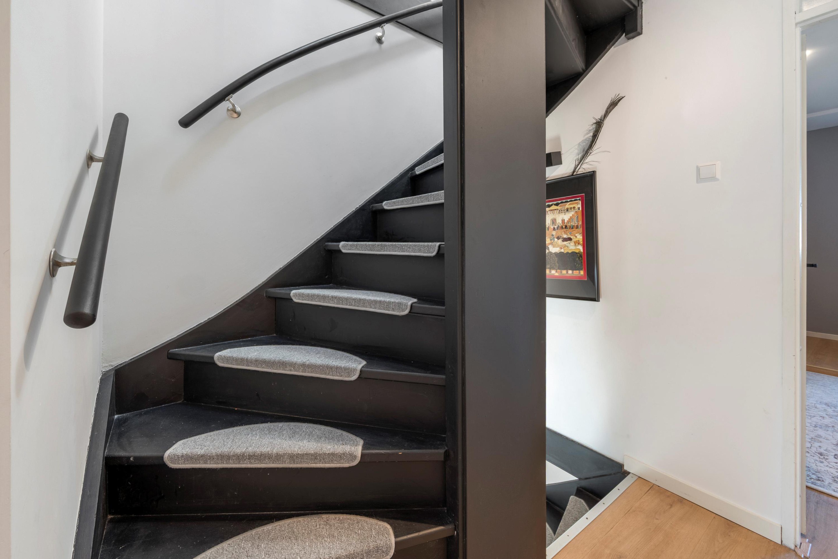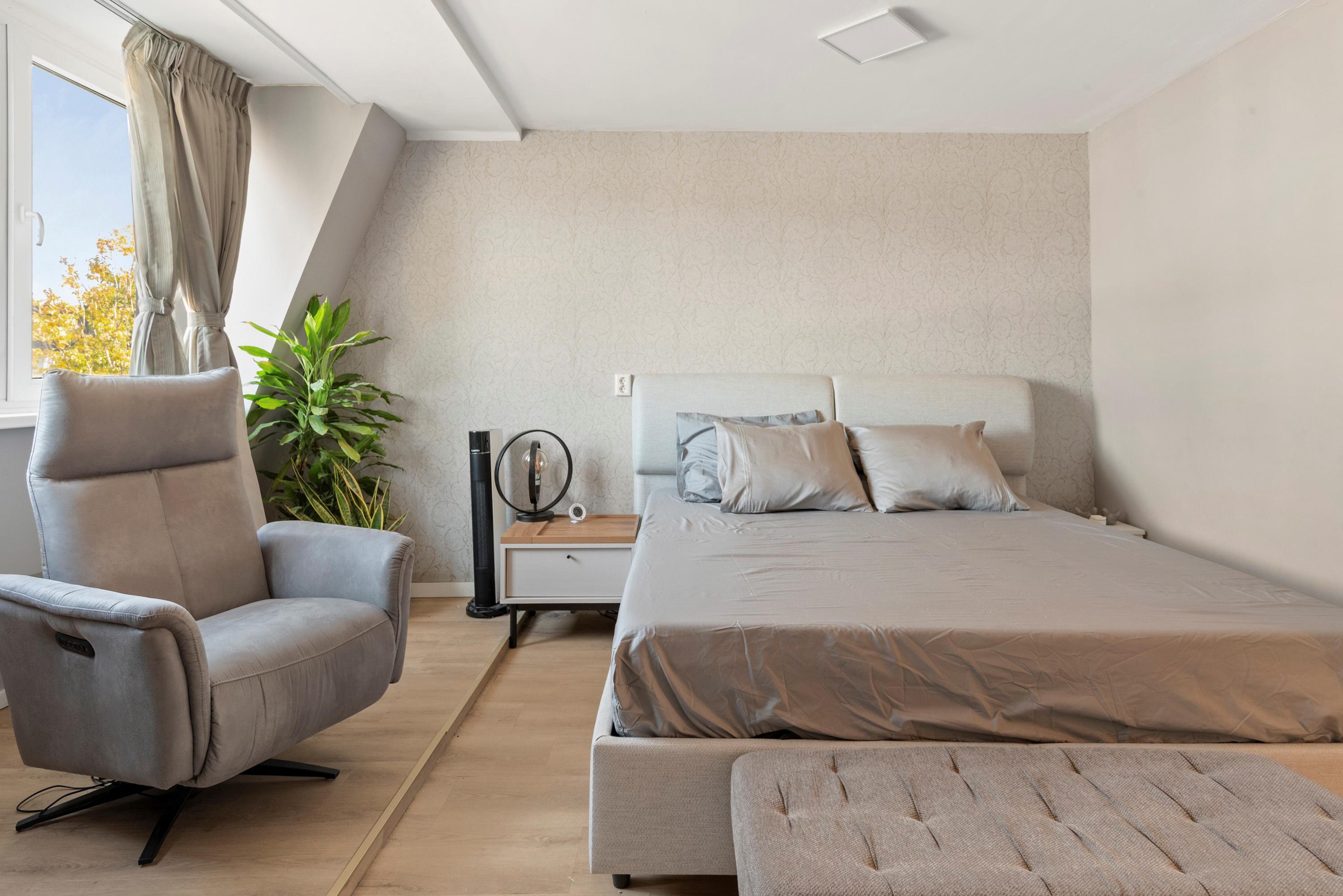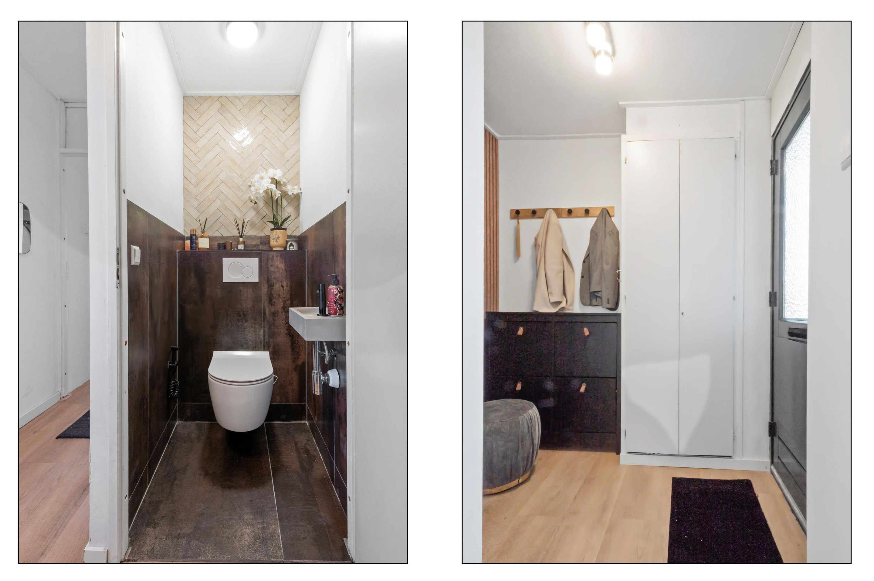 Via de verzorgde voortuin met oprit en laadpunt bereik je de entree. De hal met garderobe en modern separaat toilet leidt naar de ruime en lichte woonkamer, afgewerkt met een stijlvolle pvc-houten vloer en vloerverwarming.