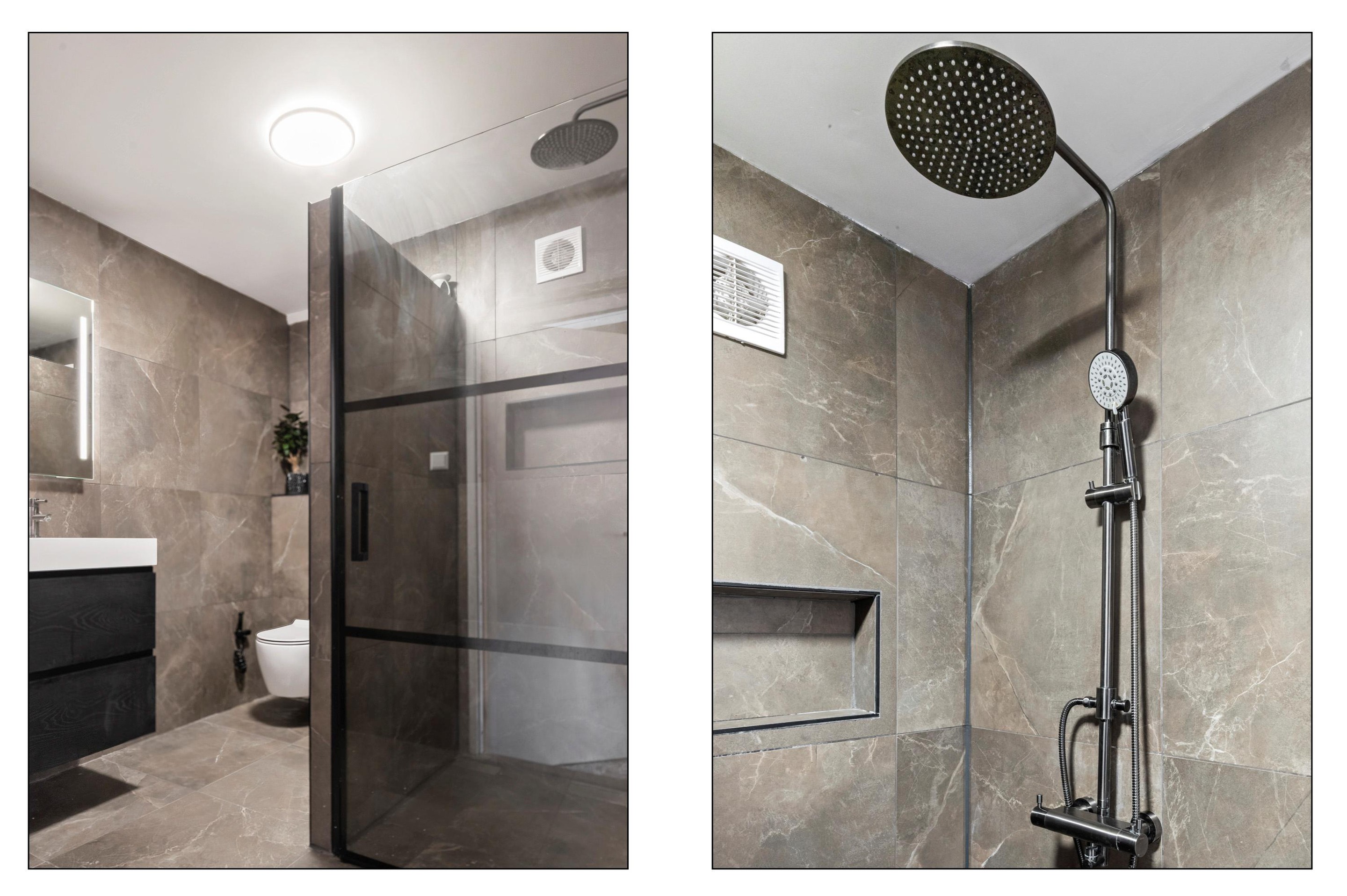 De overloop biedt toegang tot drie ruime slaapkamers en een moderne badkamer in het midden van de verdieping. De badkamer is stijlvol afgewerkt met een inloopdouche, hangend toilet en een wastafelmeubel met dubbele kraan.
