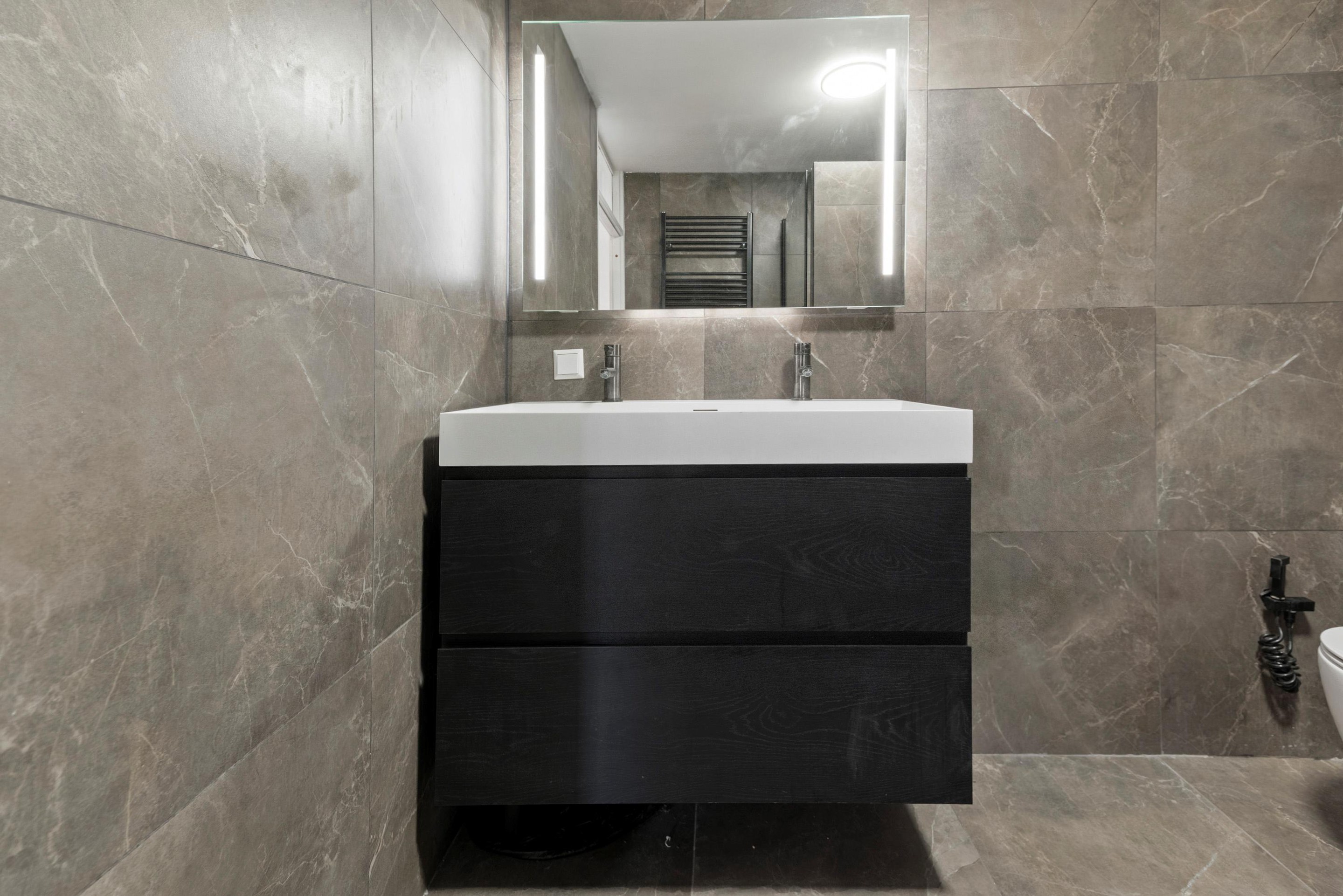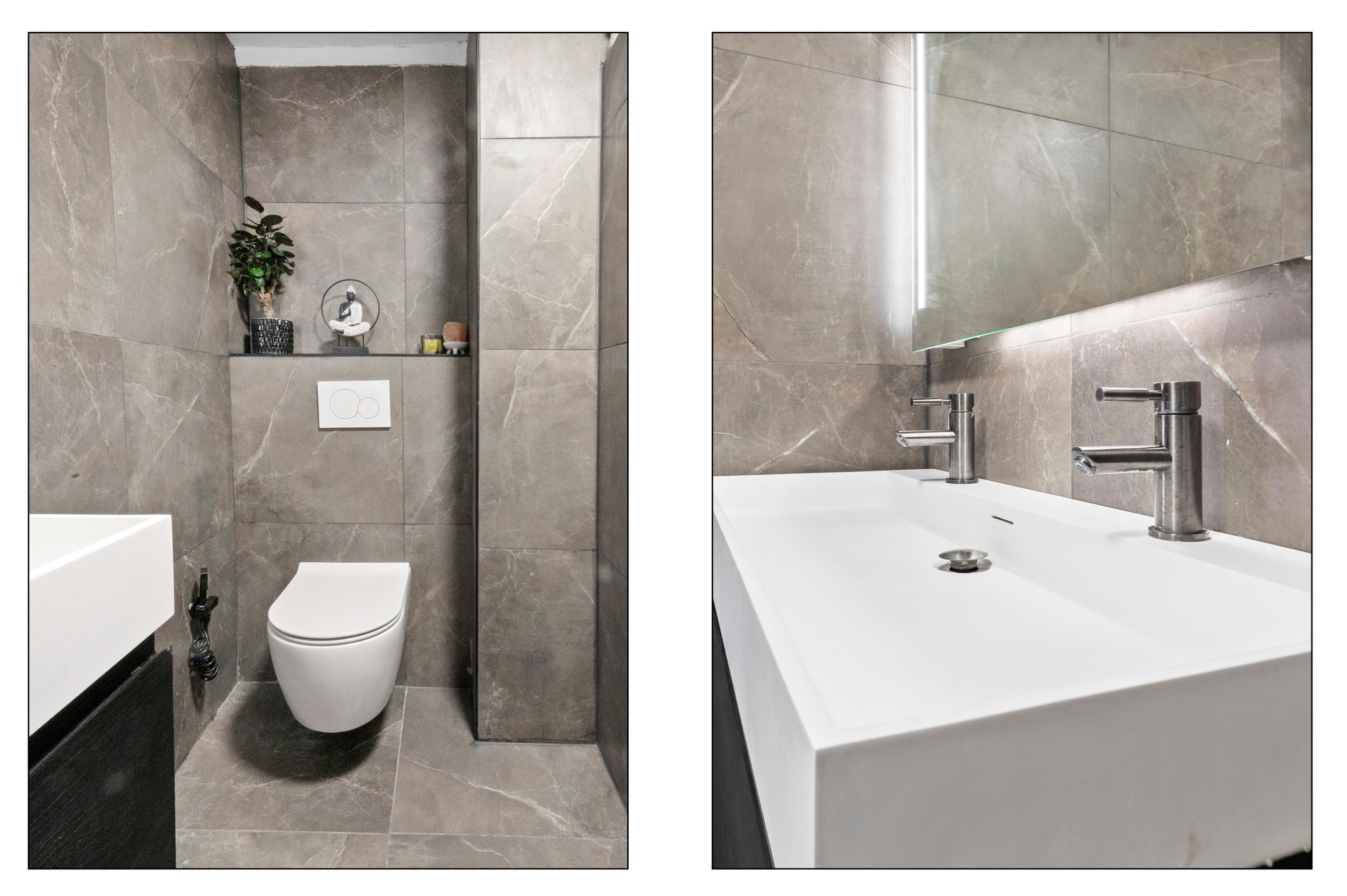 Moderne badkamer met inloopdouche, dubbele wastafel en hangend toilet