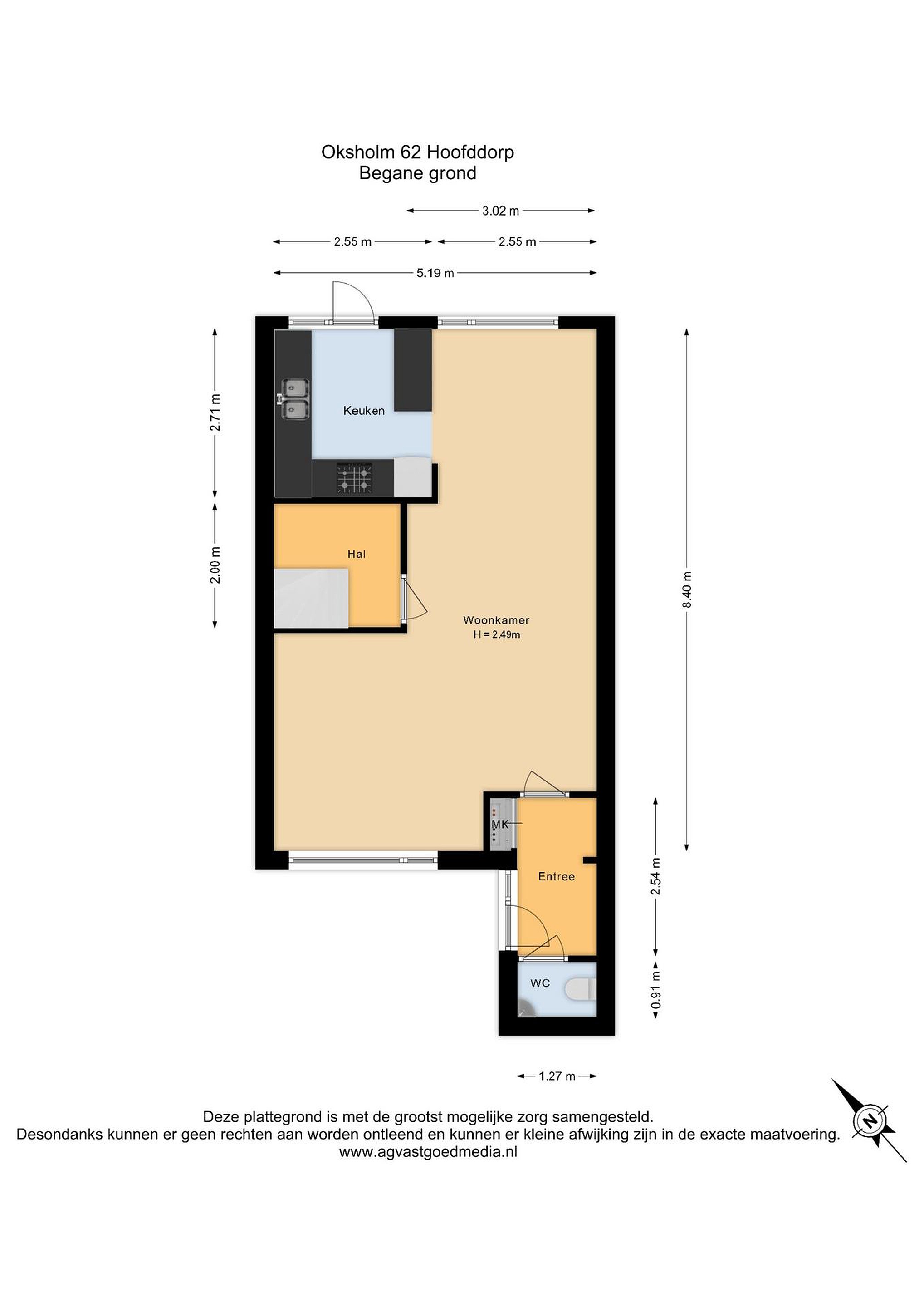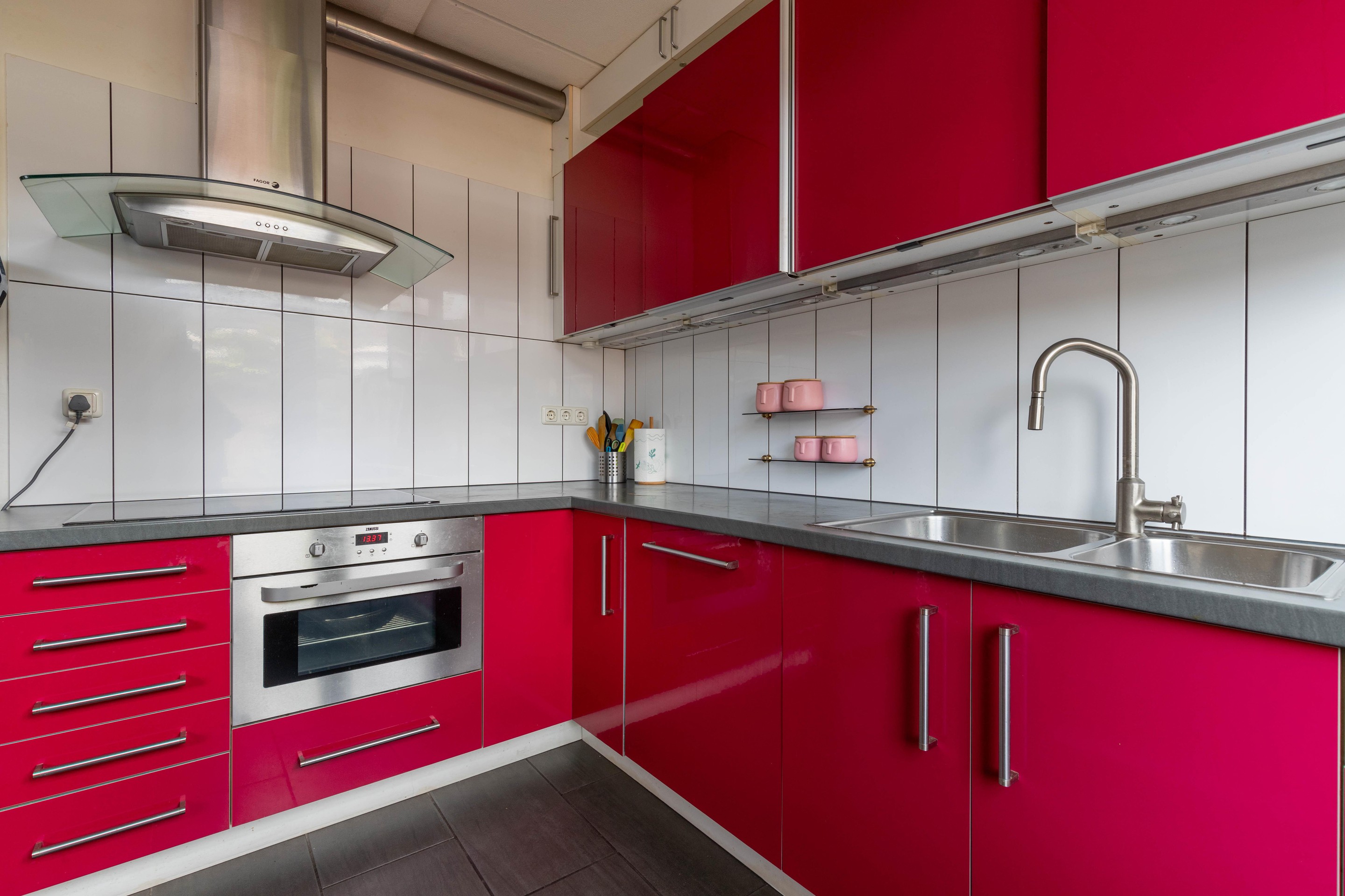 Begane grond entree met ruime hal, meterkast, volledig betegeld toilet en toegang tot de woonkamer aan de voorzijde. Aan de achterzijde bevindt zich het eetgedeelte met een moderne hoogglans rode keuken, voorzien van diverse inbouwapparatuur zoals een oven, vaatwasser, inductiekookplaat en afzuigkap. De begane grond is grotendeels afgewerkt met een hardhouten vloer en deels met keramisch parket. De wanden zijn voorzien van behang.