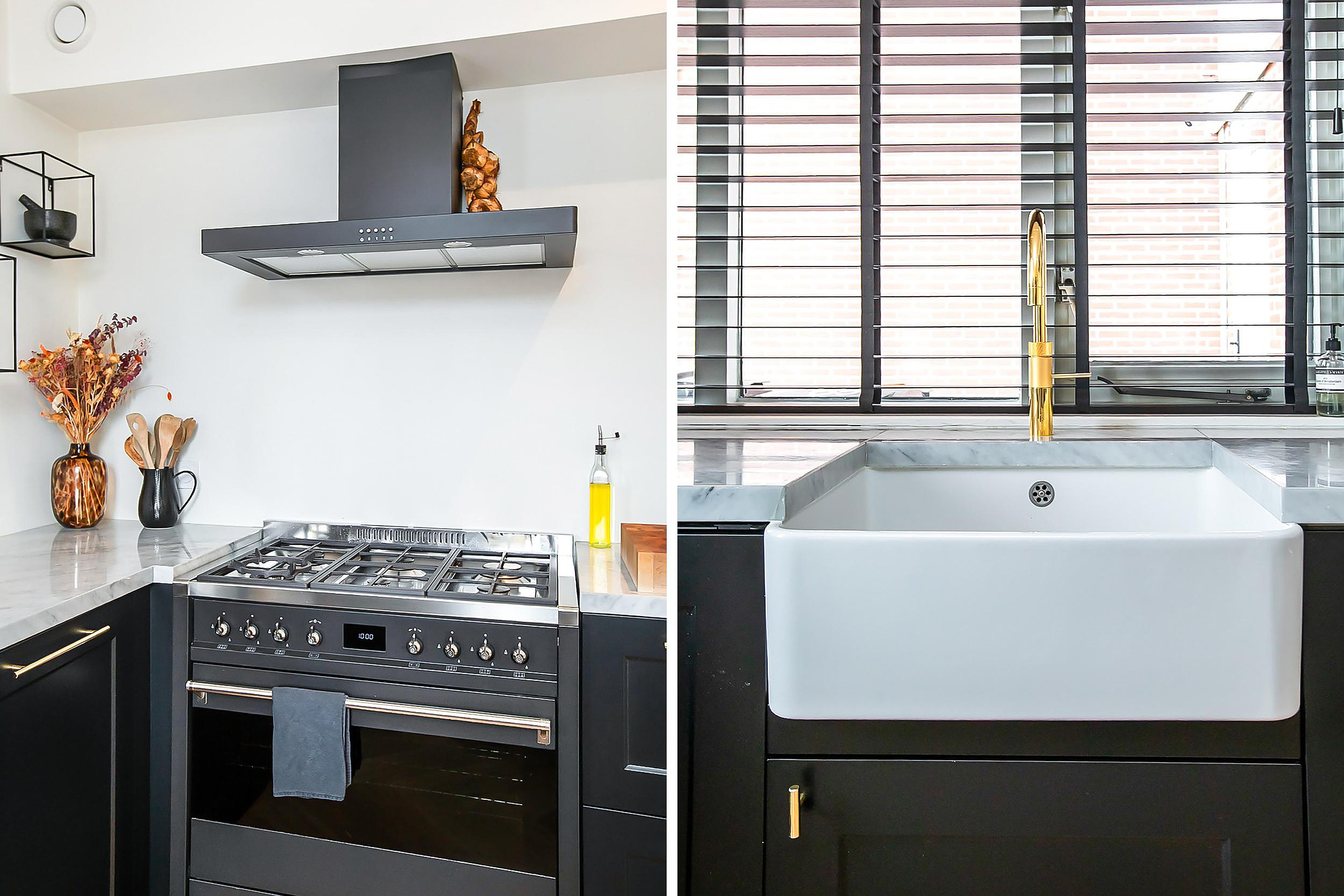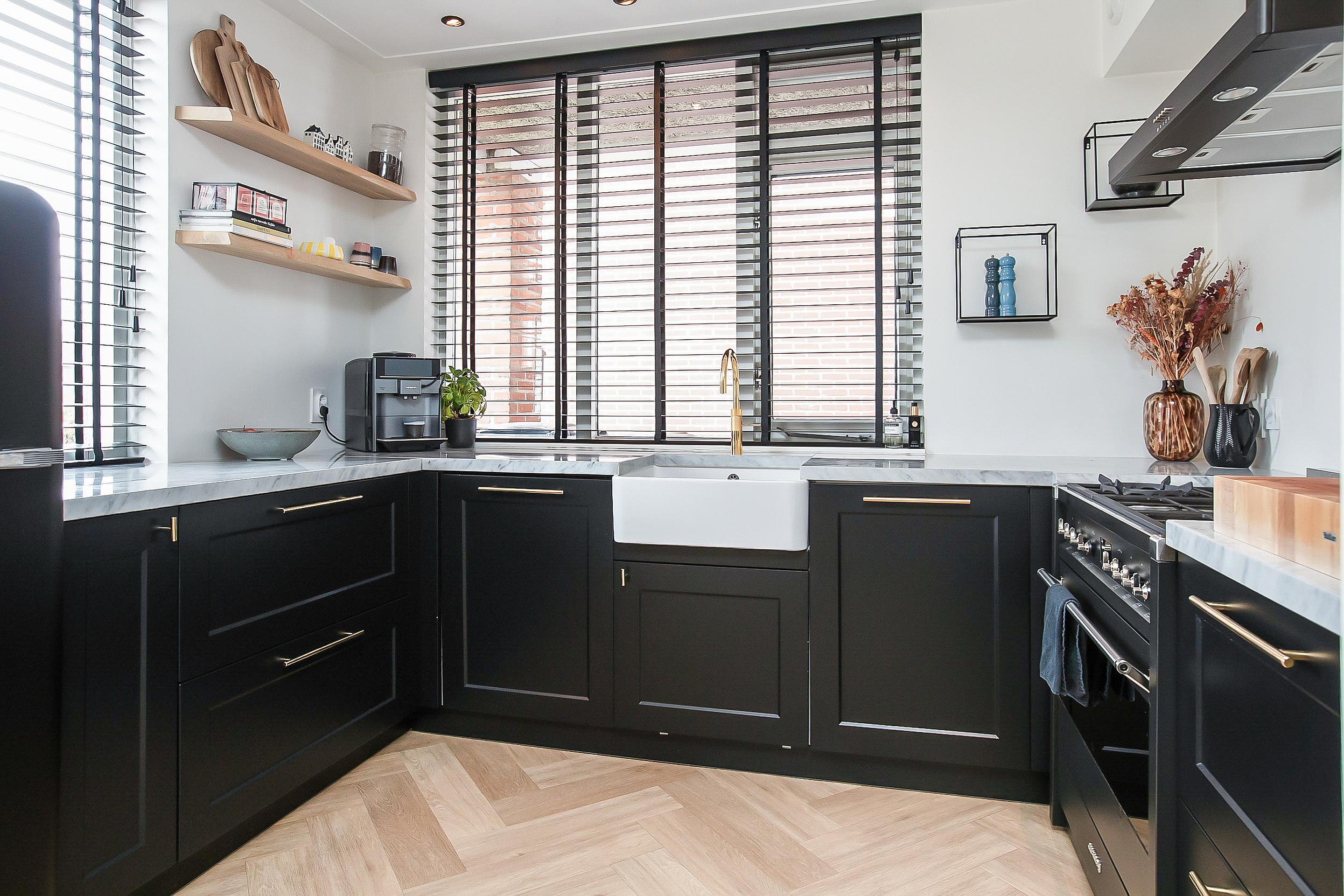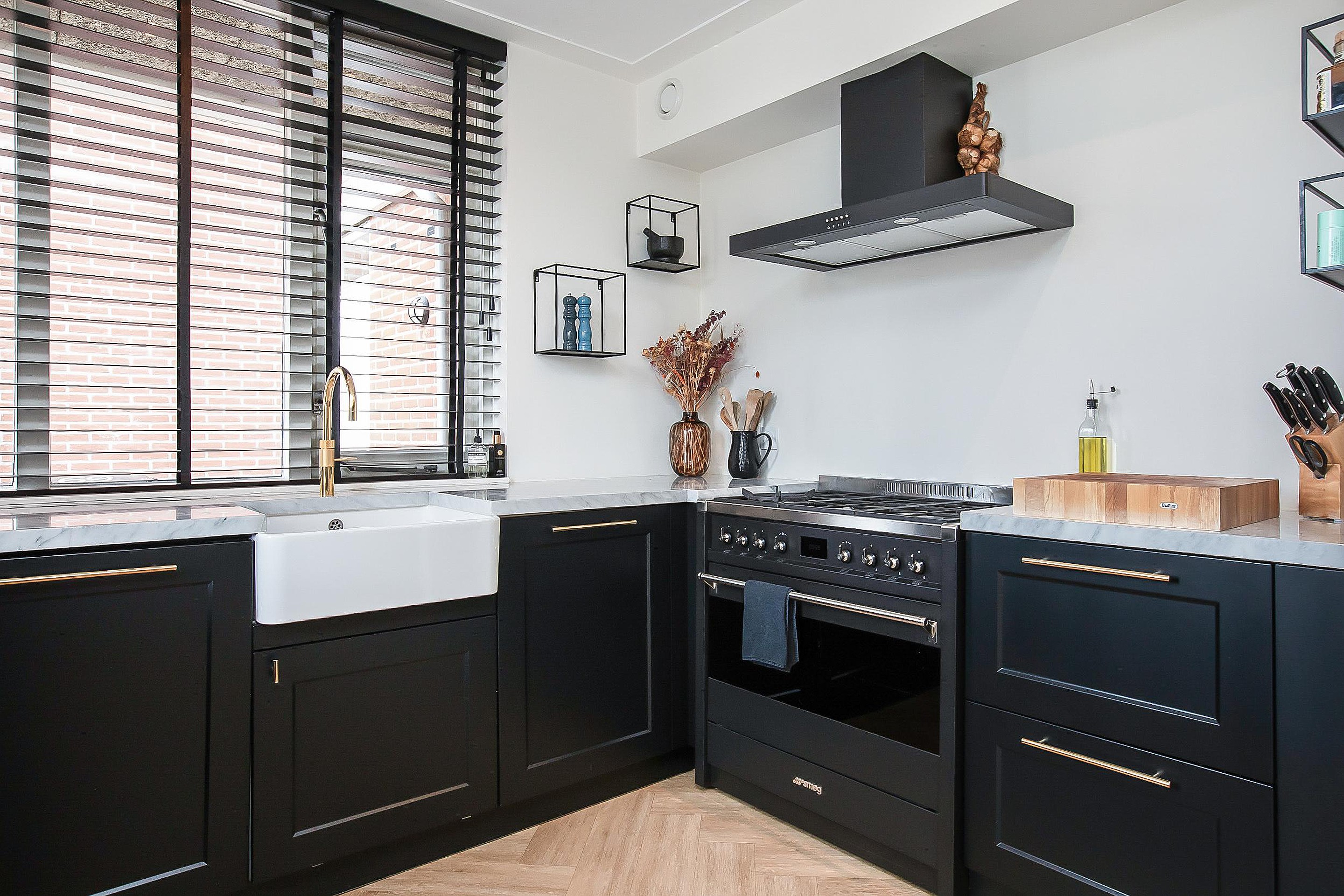 De uitgebouwde living is ruim van opzet en ingericht met een open keuken, een luxe pvc vloer met vloerverwarming en openslaande deuren die direct toegang geven tot de voortuin. Een indeling waarin licht, ruimte en dagelijks gebruik vanzelf samenkomen. De open keuken is modern uitgevoerd en vormt een duidelijk onderdeel van het woonniveau. Voorzien van inbouwspots en ingericht met een Smeg 6-pits gasfornuis met geïntegreerde oven, afzuigunit, vaatwasser en een marmeren werkblad. Een combinatie van functionaliteit en afwerking die aansluit bij het niveau van de woning.