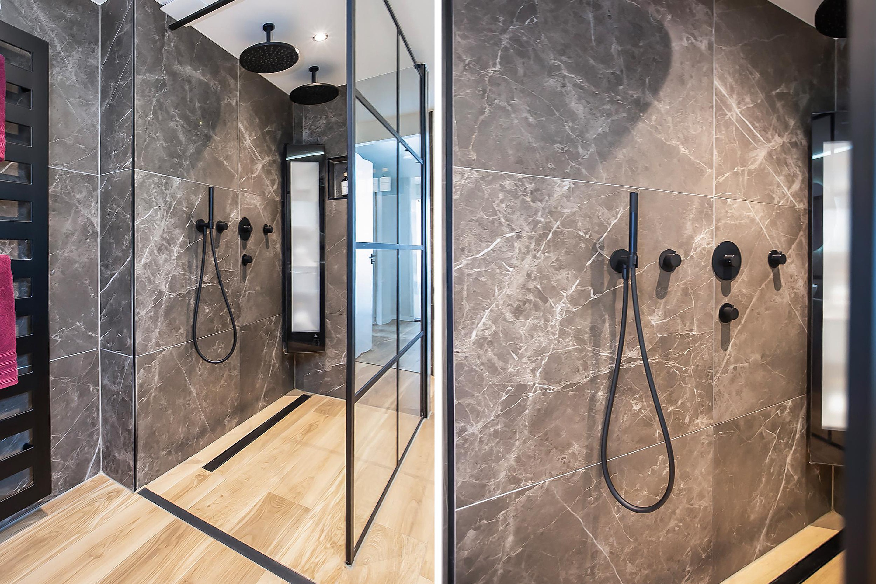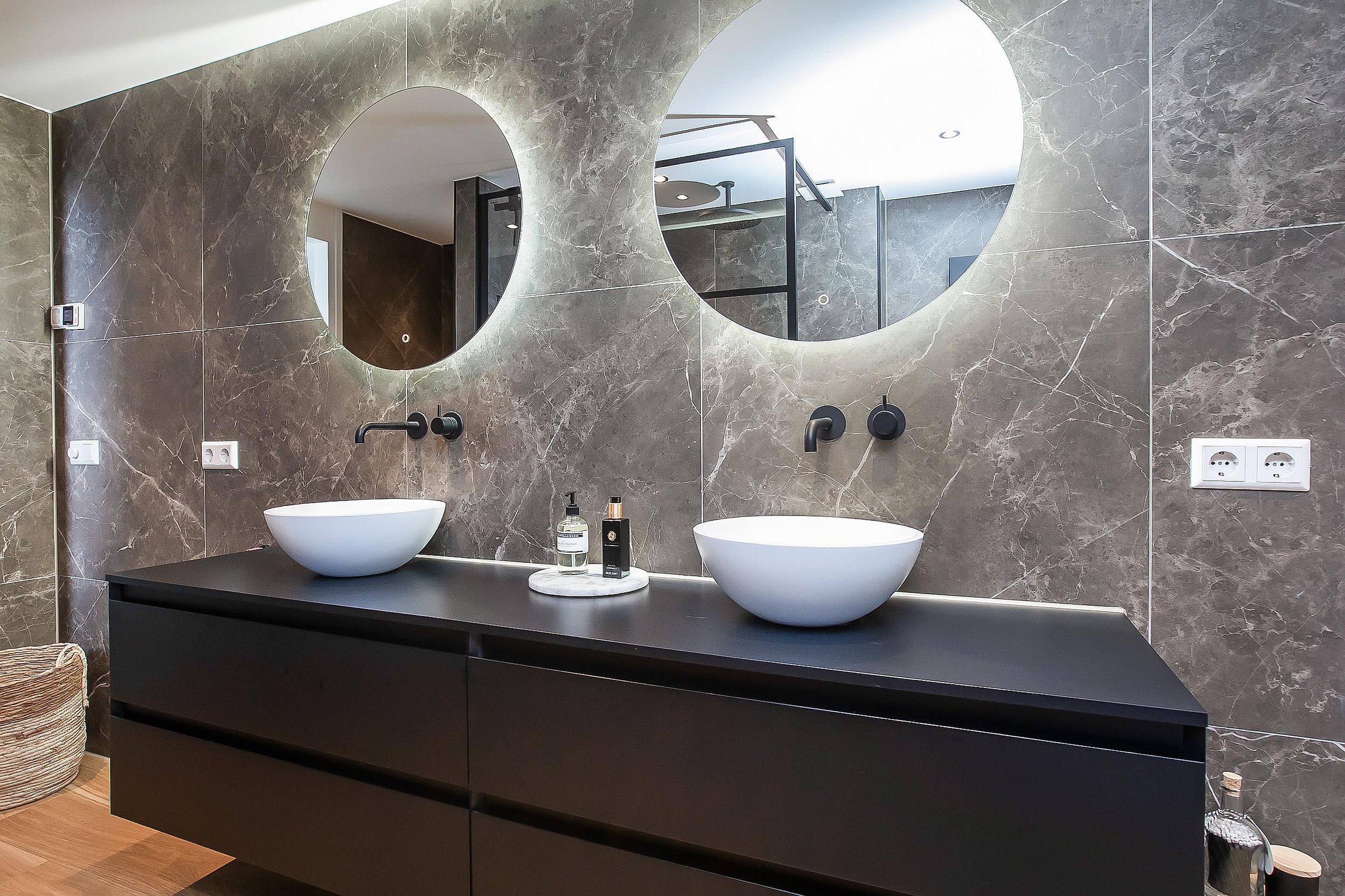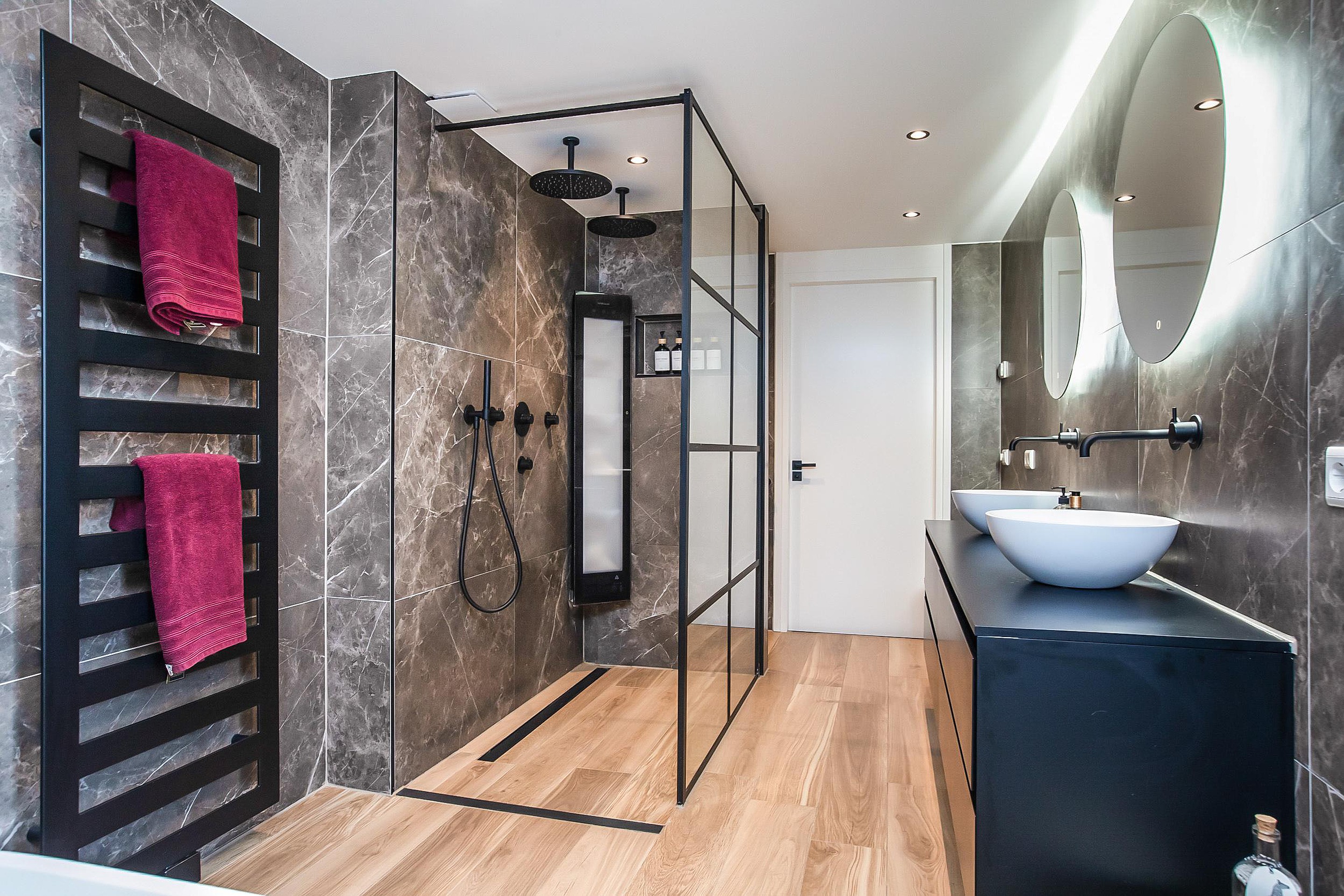 De badkamer is in lijn met de renovatie hoogwaardig uitgevoerd en ingericht met oog voor comfort en gebruik. Voorzien van een ligbad van Solid Surface, een inloopdouche met dubbele douche en geïntegreerde sunshower, een op maat gemaakt wastafelmeubel met twee waskommen en Hotbath kranen. Vloerverwarming en automatische mechanische ventilatie zorgen voor een aangenaam en goed gereguleerd binnenklimaat.