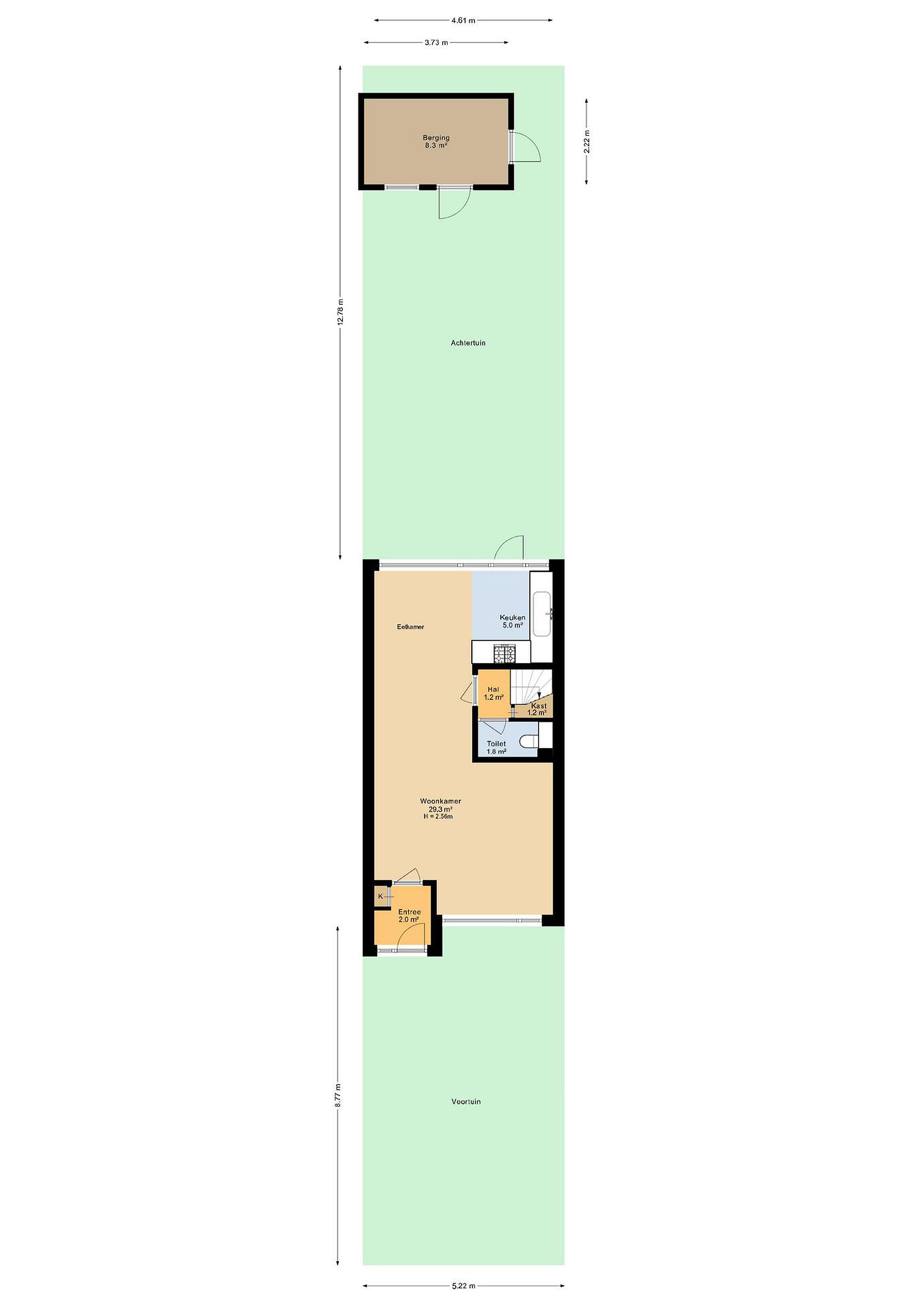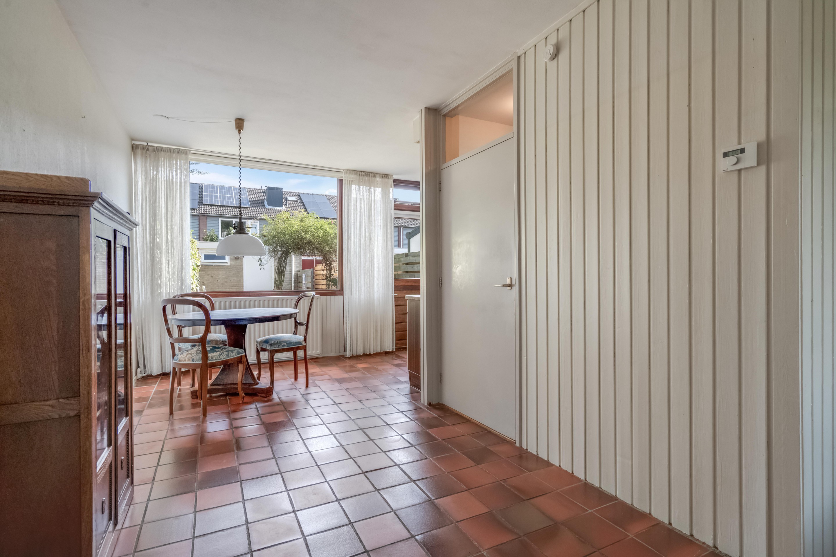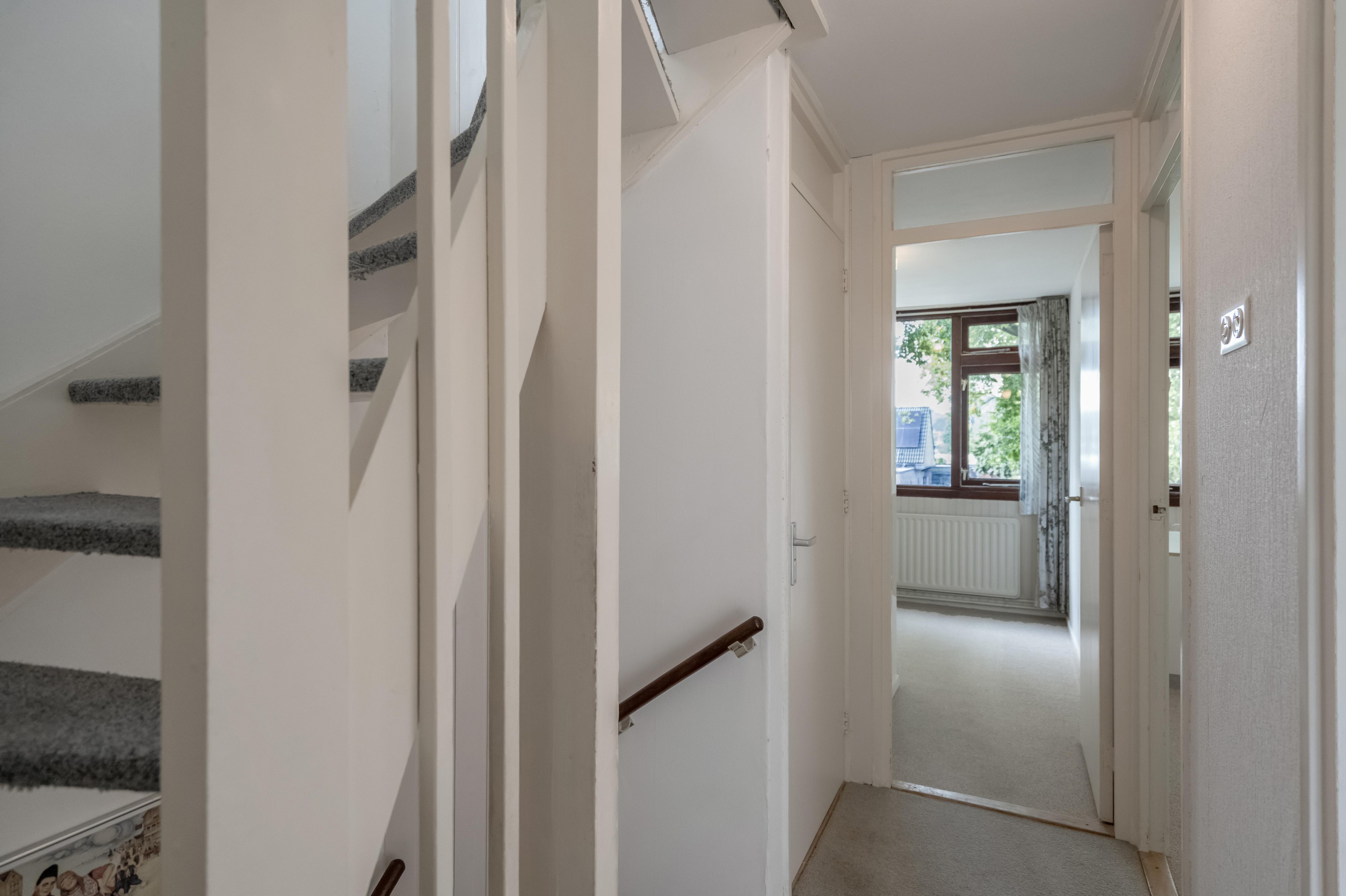 Entree/hal met meterkast en garderoberuimte. Doorloop naar de lichte woonkamer. Aan de tuinzijde de keuken met deur naar de achtertuin. Vanuit de tussenhal zijn zowel de trapopgang als het toilet bereikbaar.
