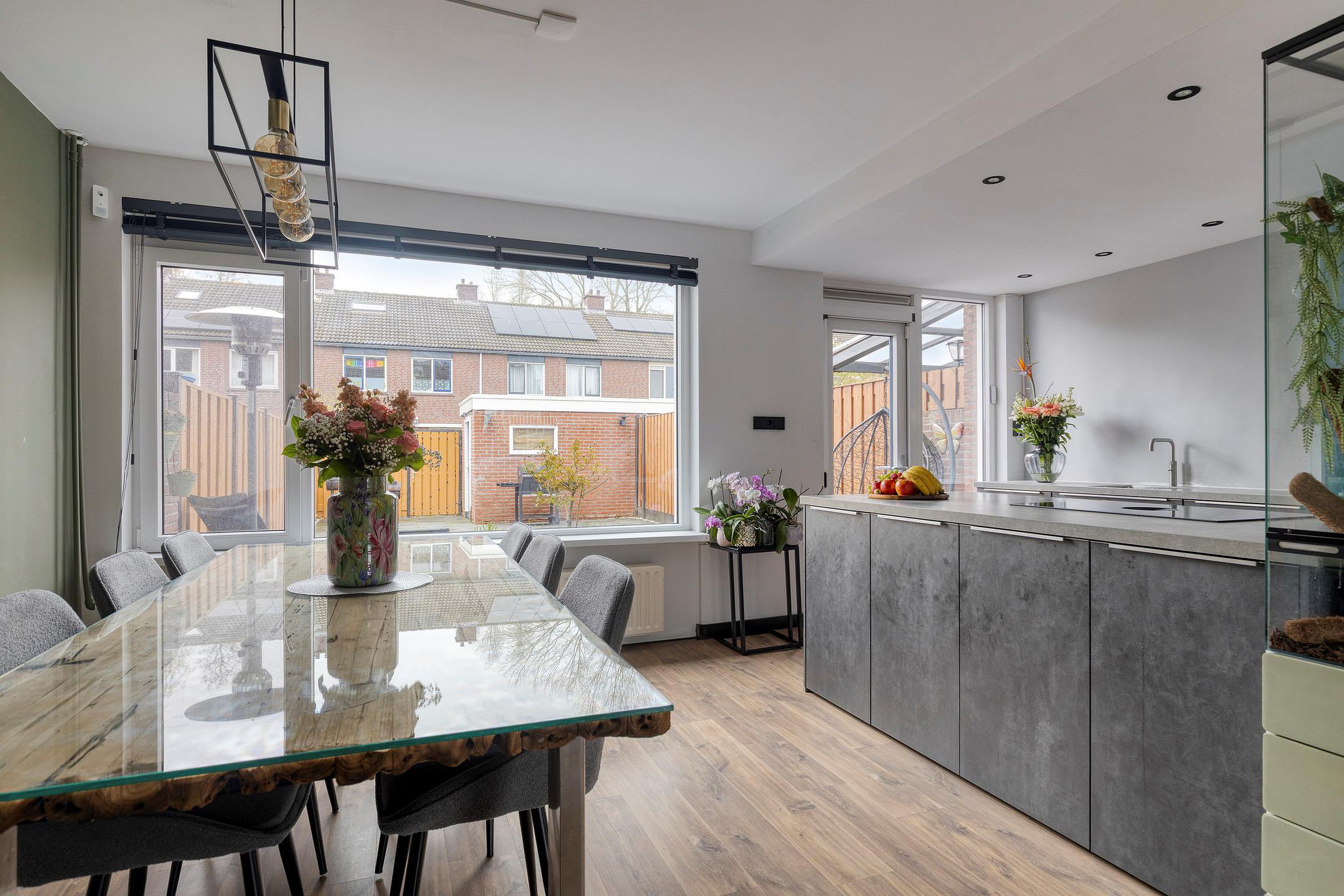 Bij binnenkomst valt direct de verzorgde afwerking en prettige lichtinval op. De ruime woonkamer staat in open verbinding met de moderne woonkeuken, die is uitgevoerd met een kookeiland en diverse hoogwaardige inbouwapparatuur – een perfecte plek voor zowel dagelijks gebruik als het ontvangen van gasten. De in 2021 vernieuwde badkamer en het separate toilet zijn stijlvol en tijdloos afgewerkt.