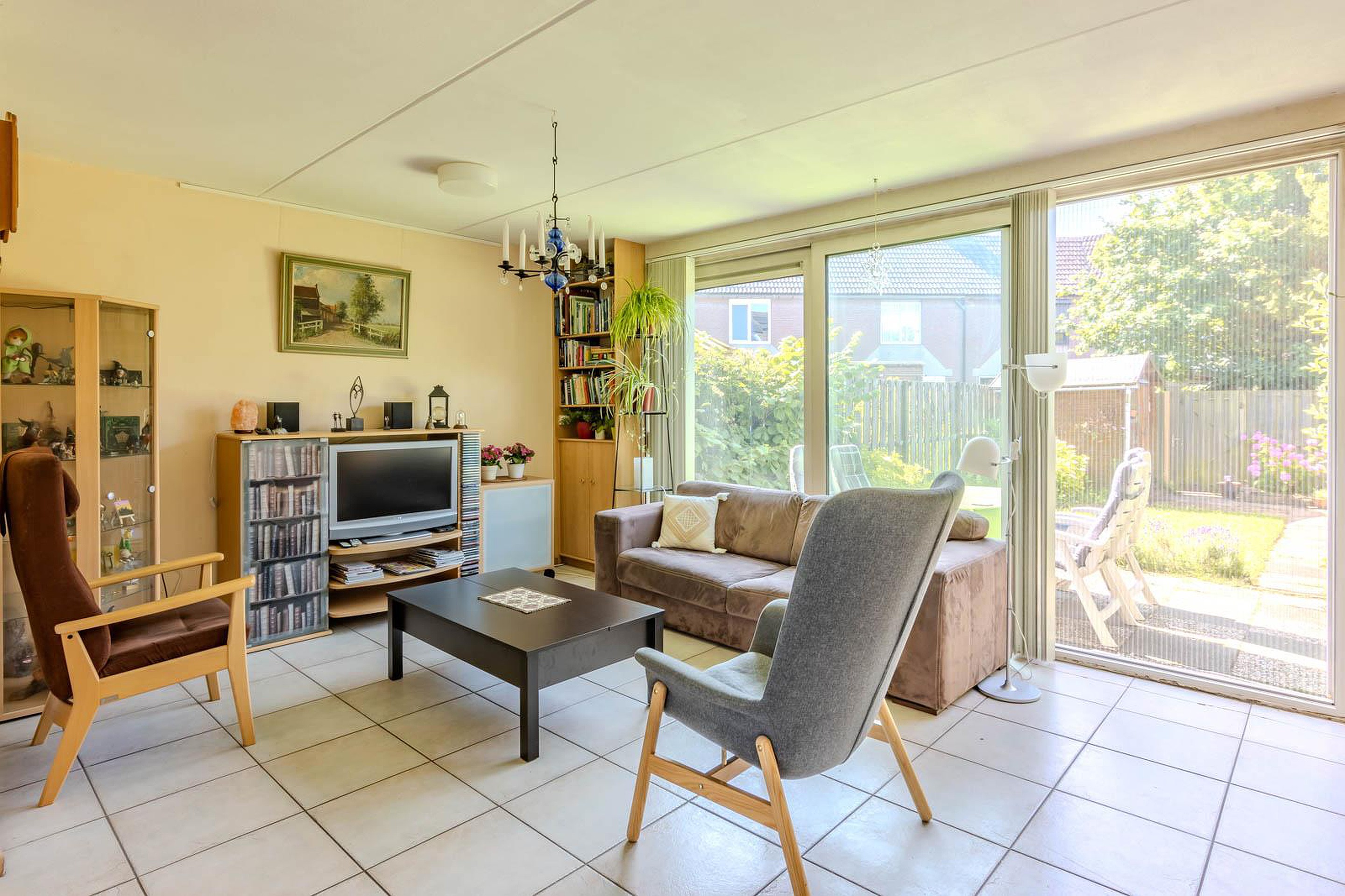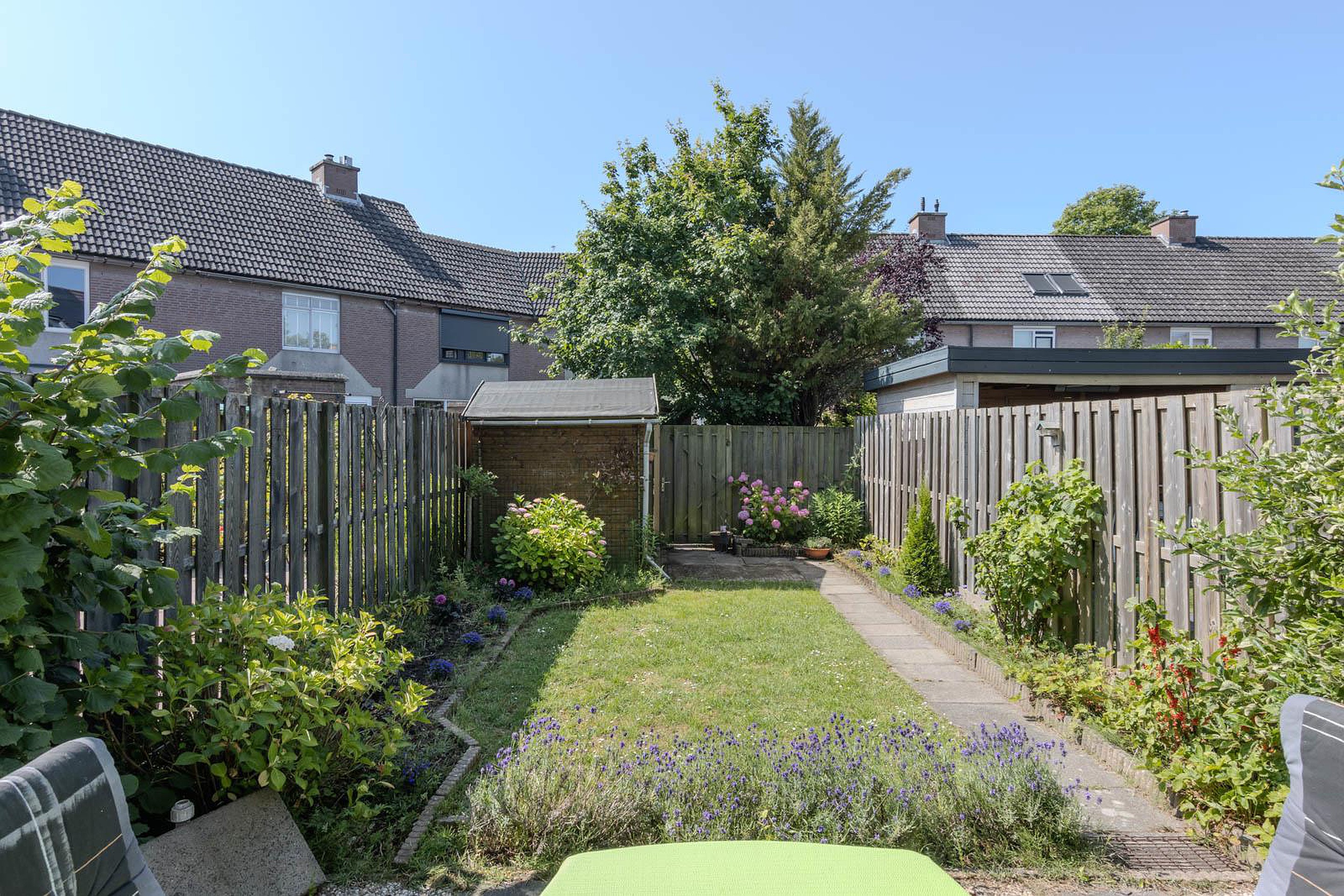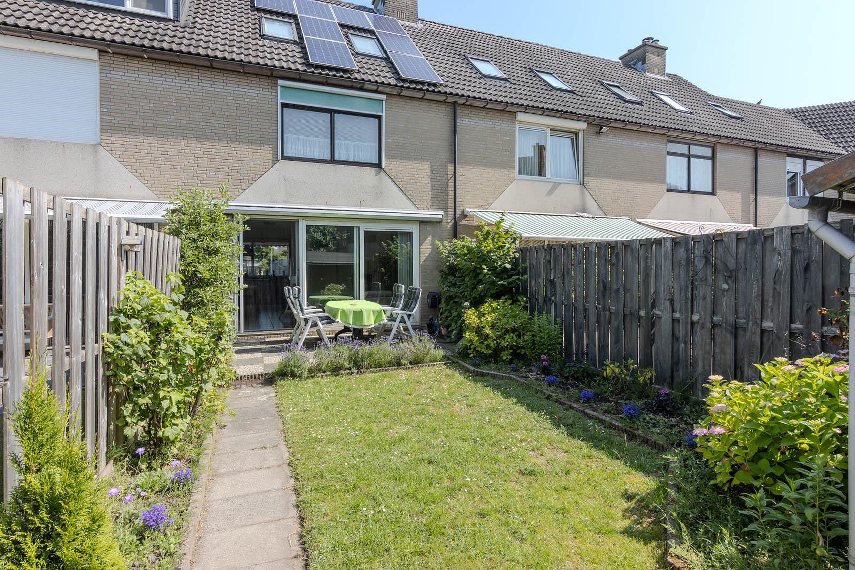 Via de schuifpui in de woonkamer bereik je de zonnige achtertuin. Hier kun je in alle rust genieten van het buitenleven. In de tuin heb je toegang tot een praktische houten berging.