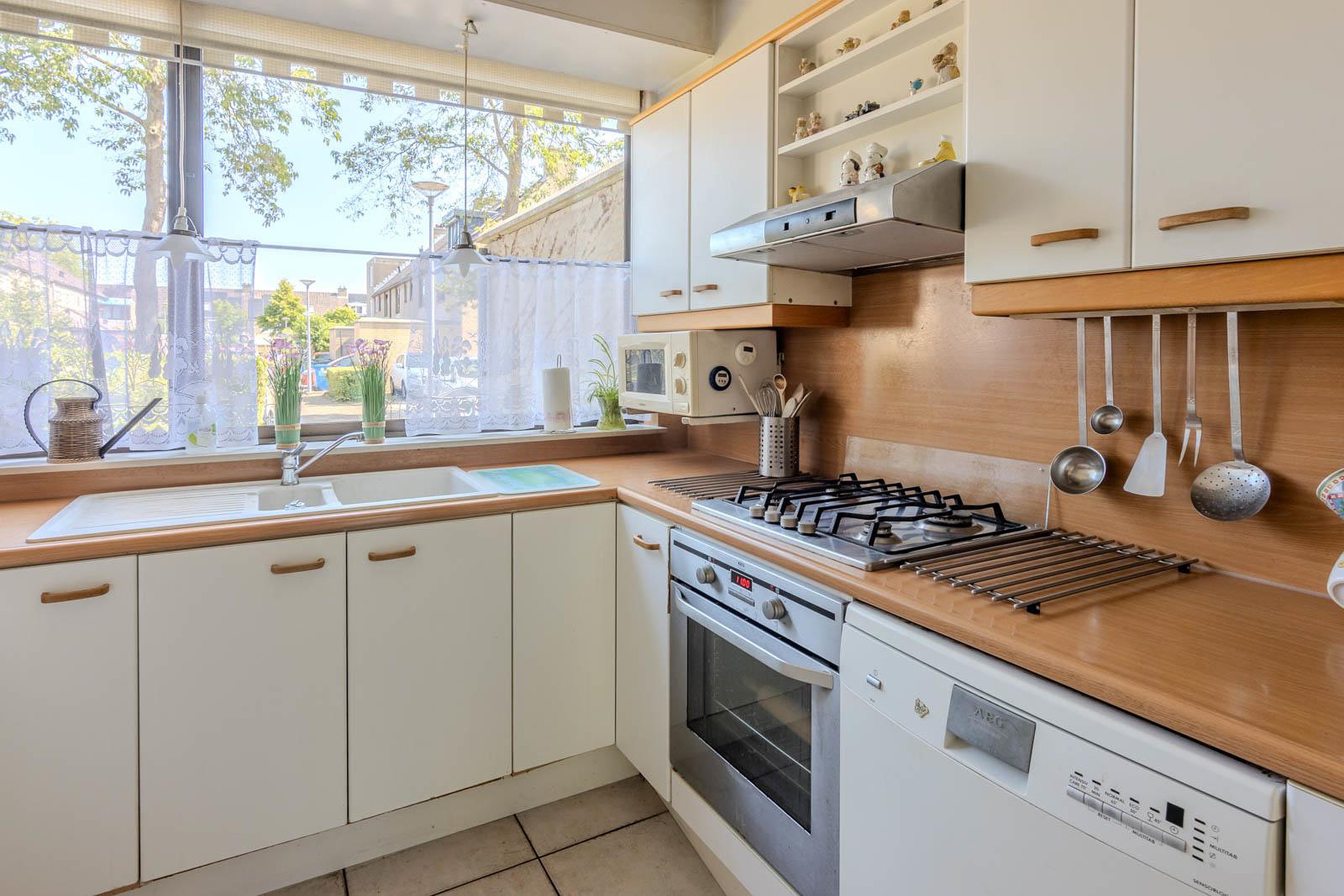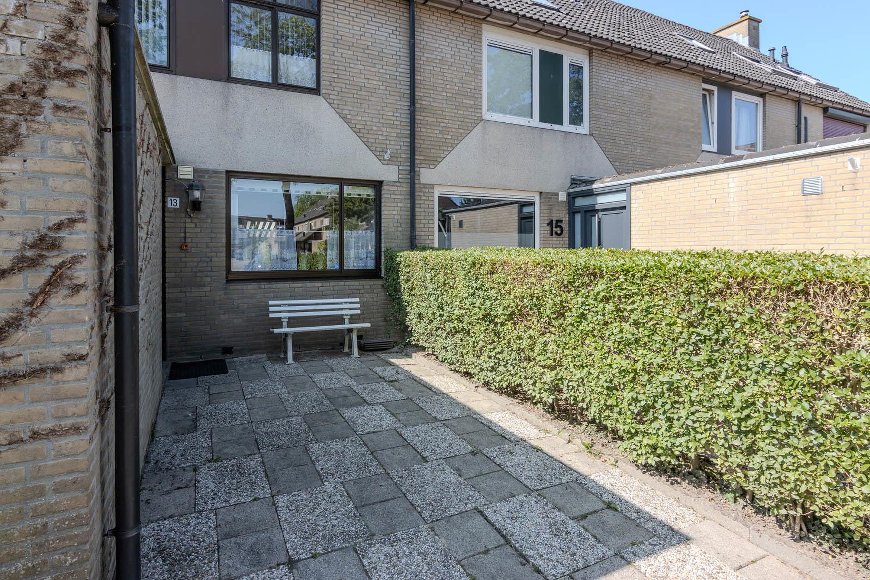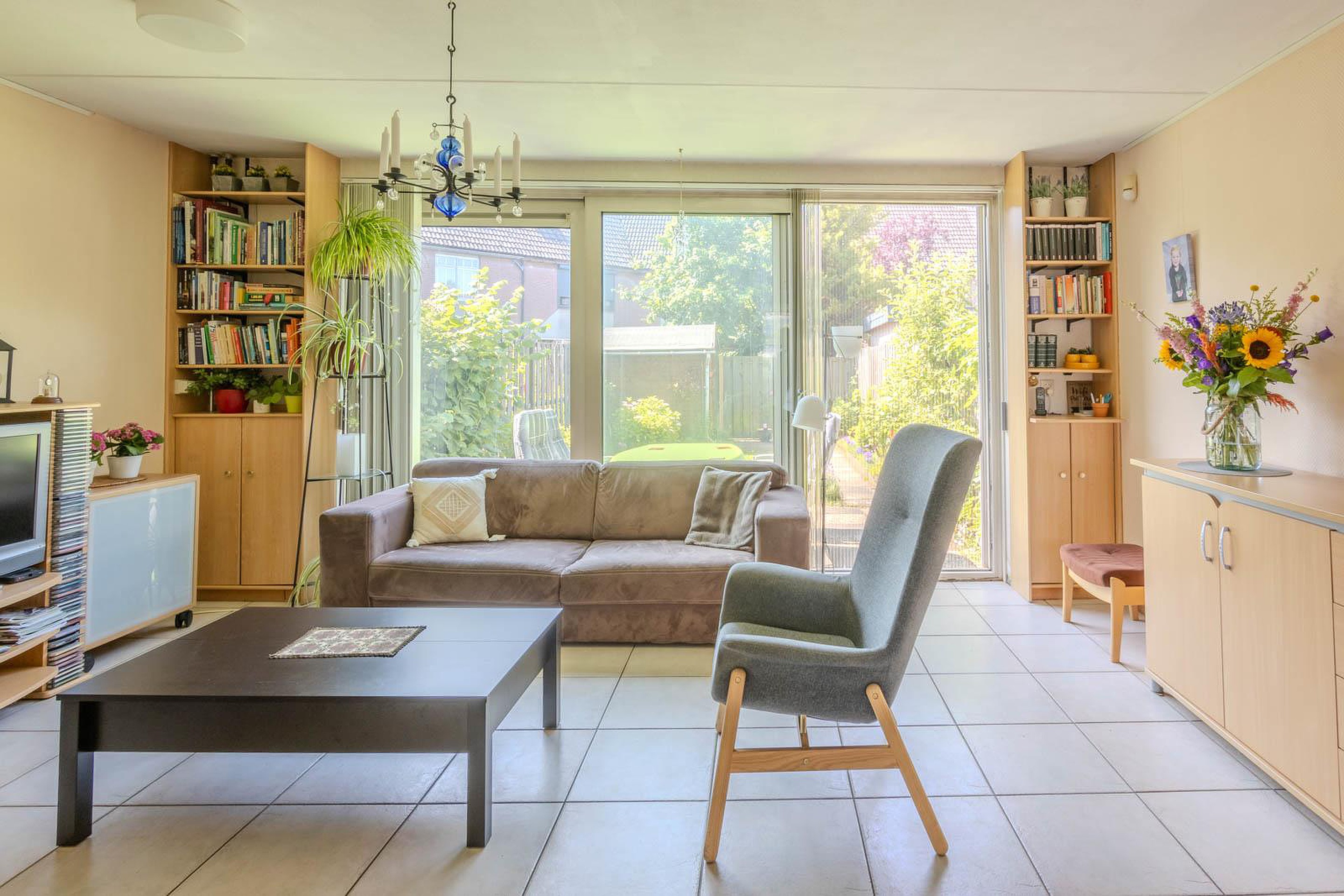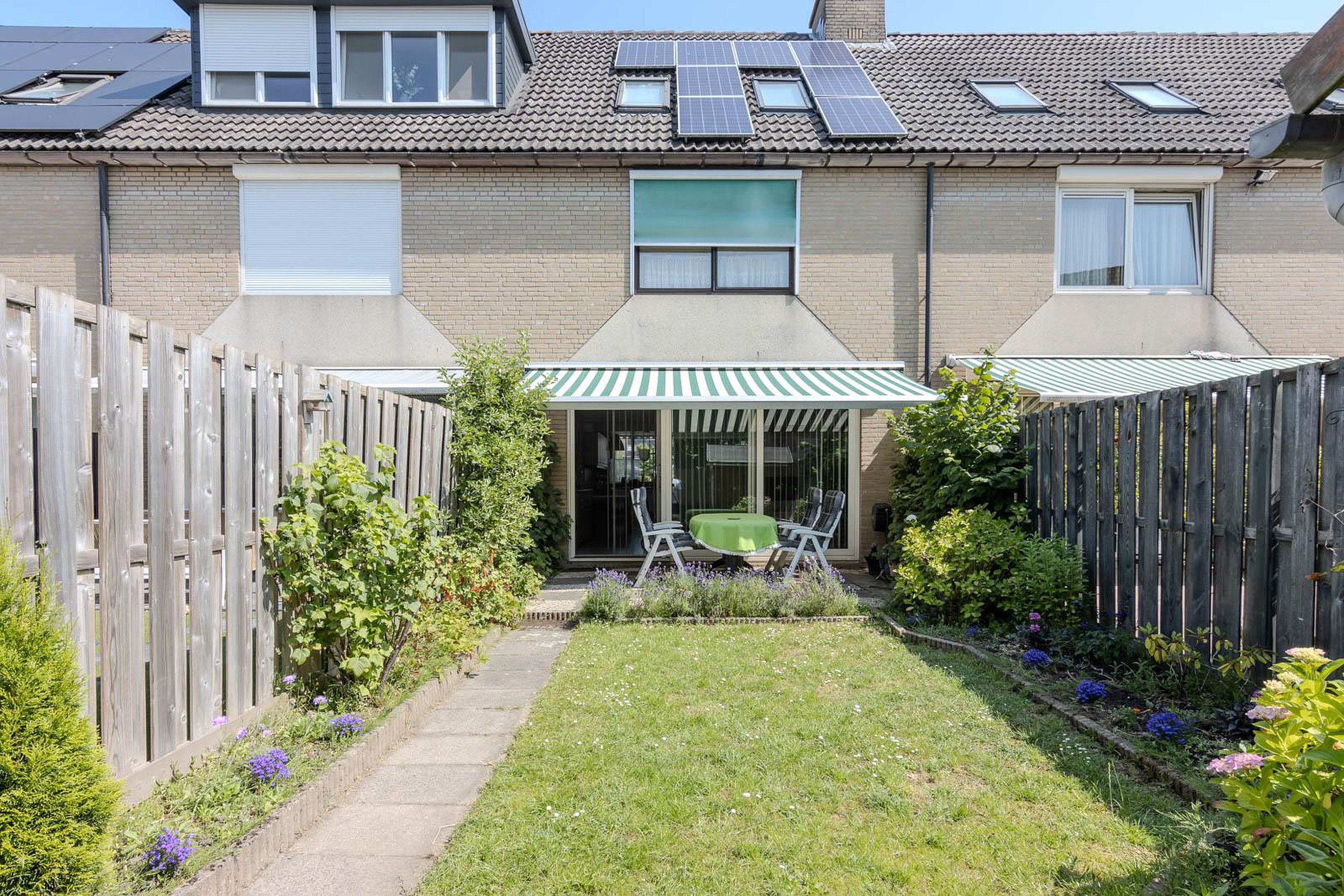 Via de schuifpui in de woonkamer bereik je de zonnige achtertuin. Hier kun je in alle rust genieten van het buitenleven. In de tuin heb je toegang tot een praktische houten berging.
