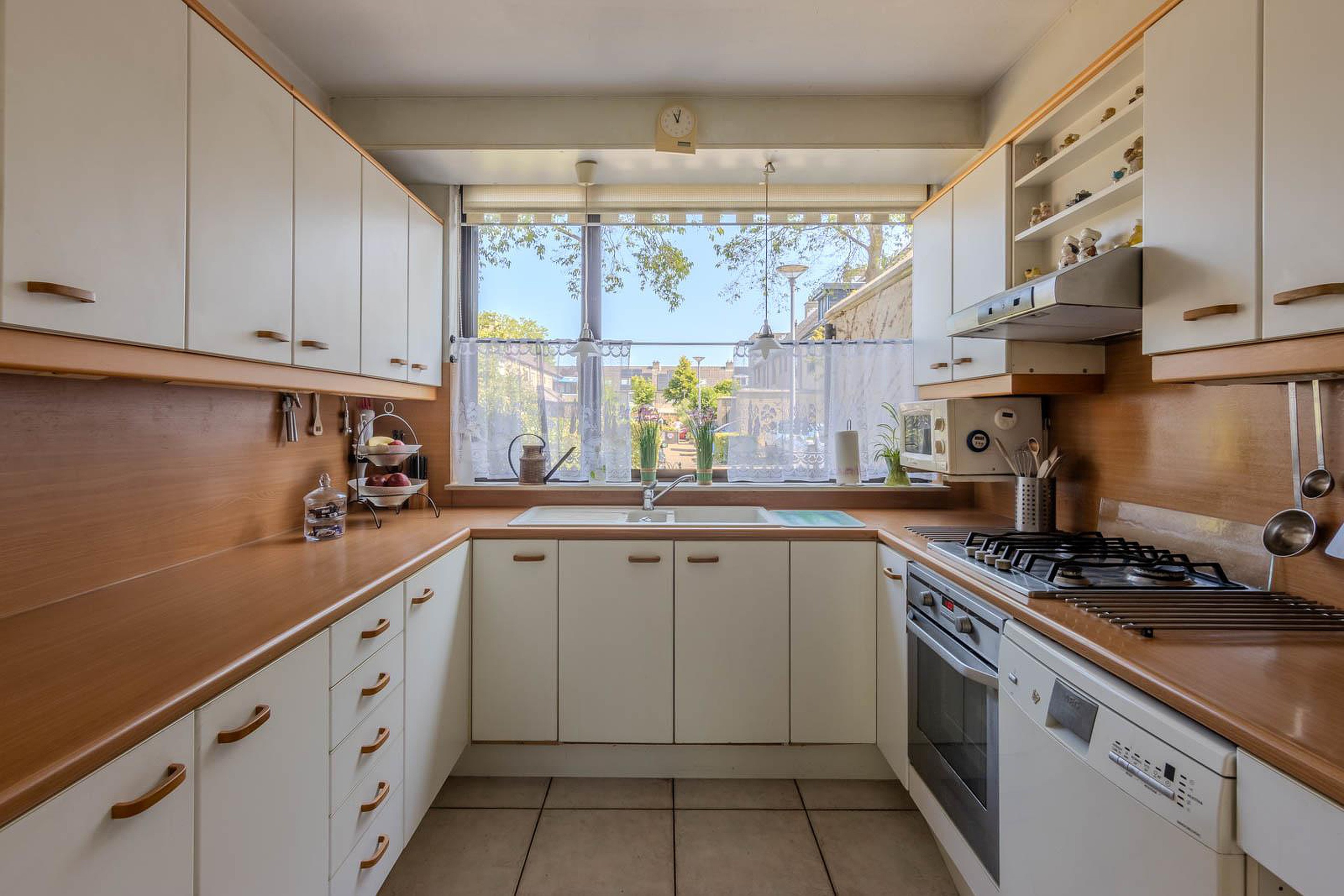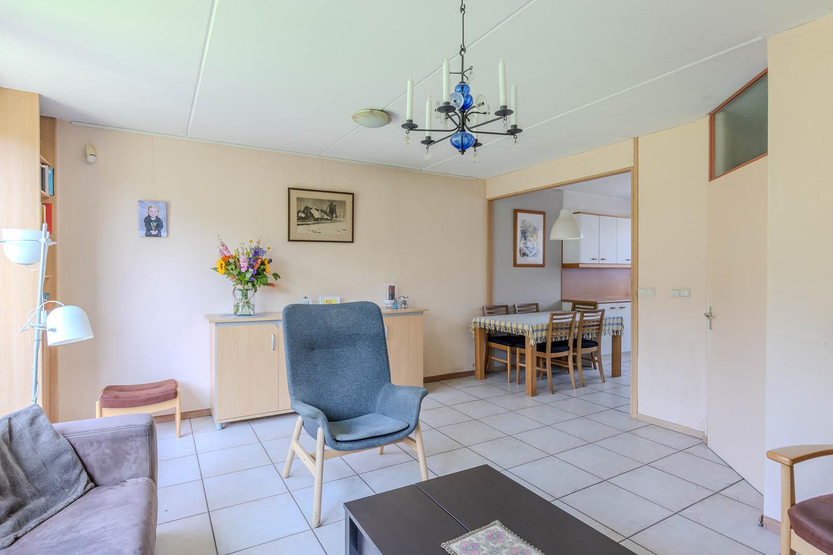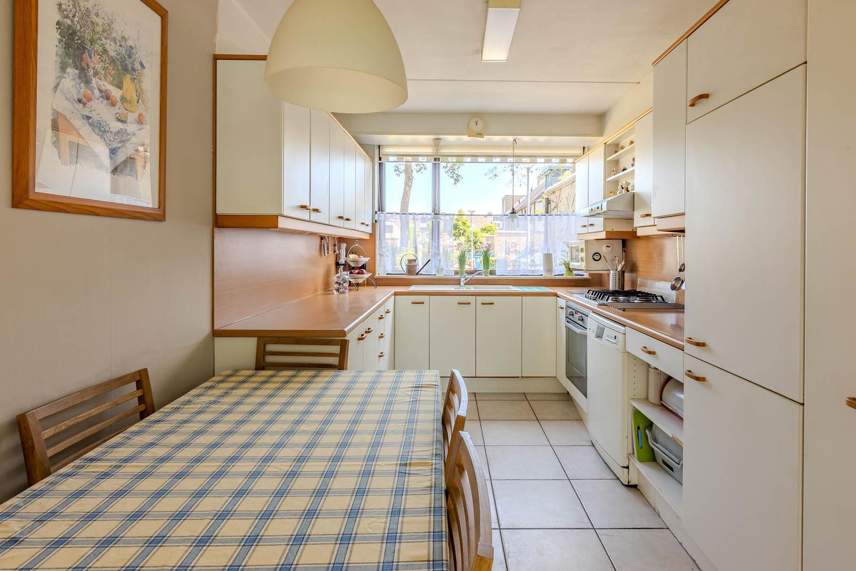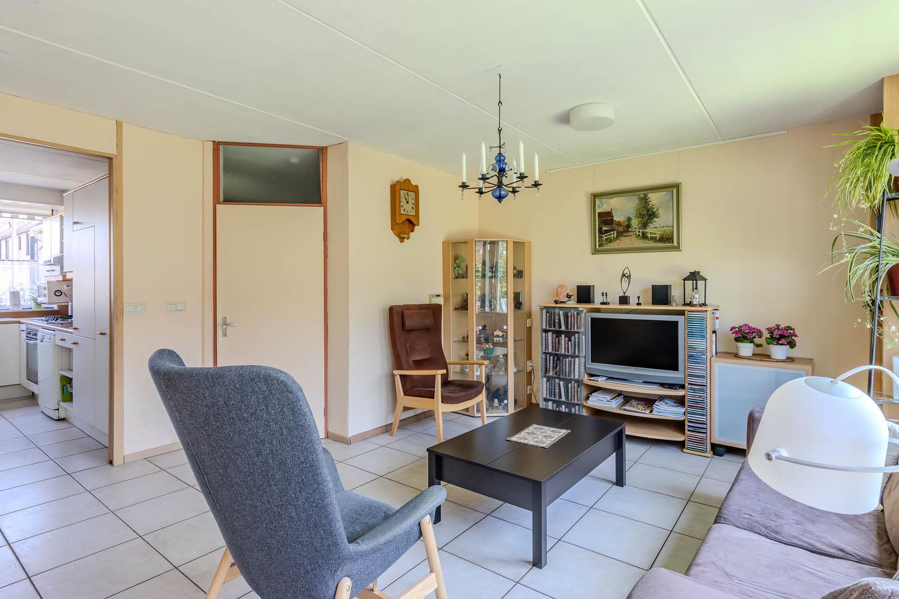De woonkamer is afgewerkt met een lichte plavuizen vloer met comfortabele vloerverwarming. Aan de voorzijde van de woning is de halfopen keuken. Deze is heerlijk ruim en heeft een fijne connectie met de woonkamer.