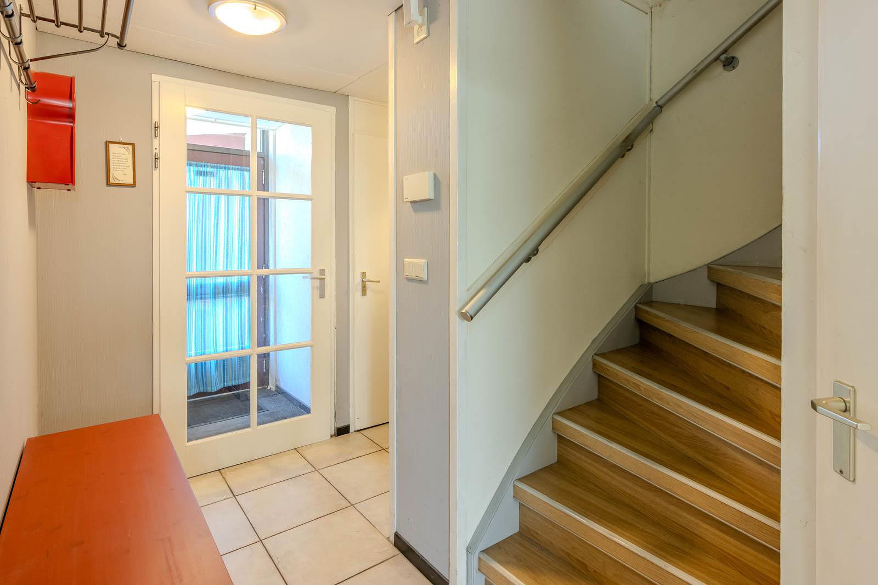 Via de voortuin, waar zich ook de stenen berging bevindt, kom je binnen in de woning. In de hal bevinden zich de meterkast, het toilet en de trapopgang. Vanuit hier stap je de ruime, lichte woonkamer binnen.