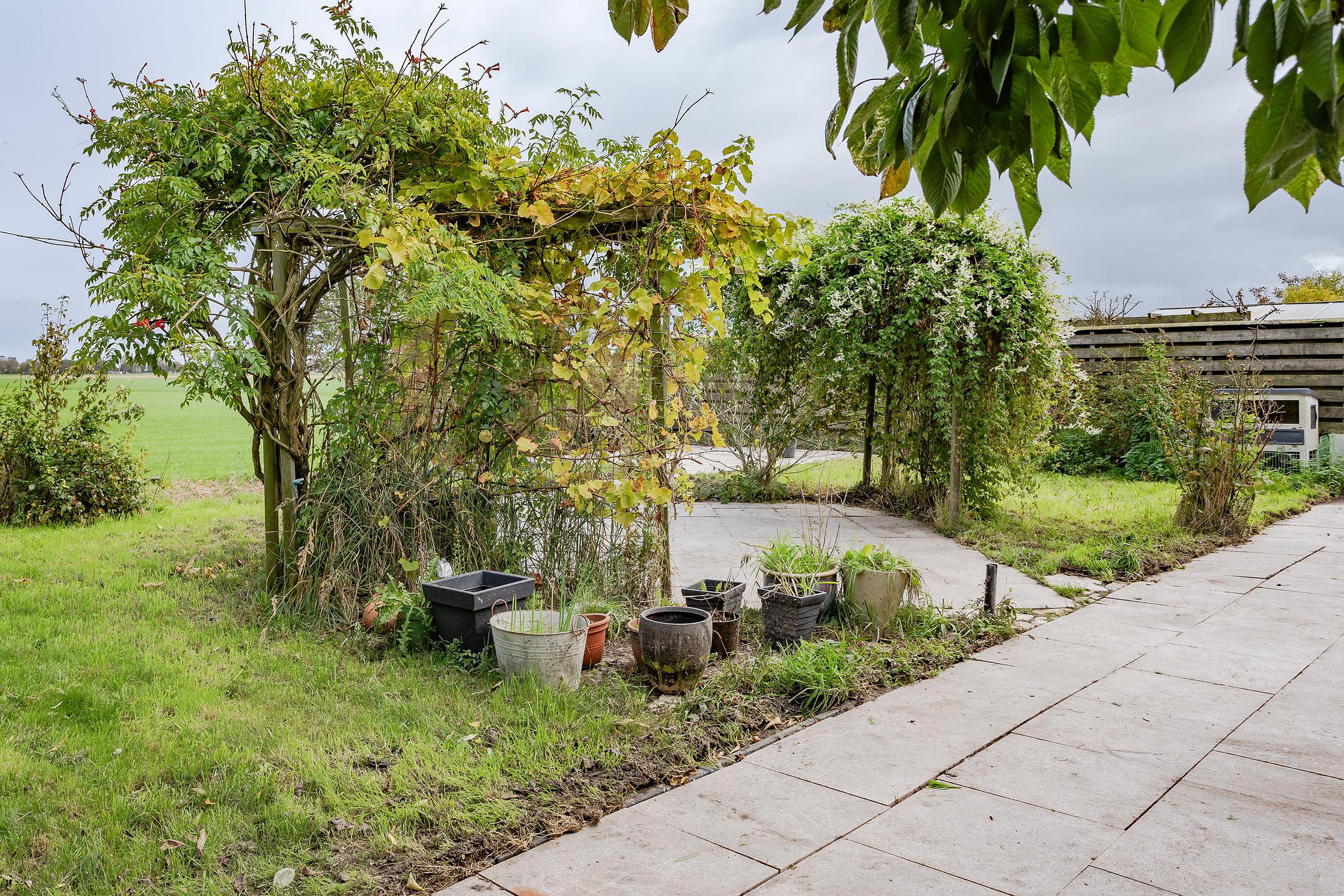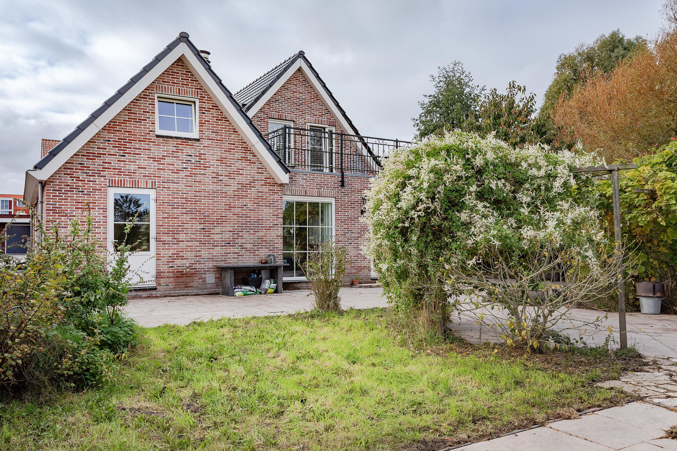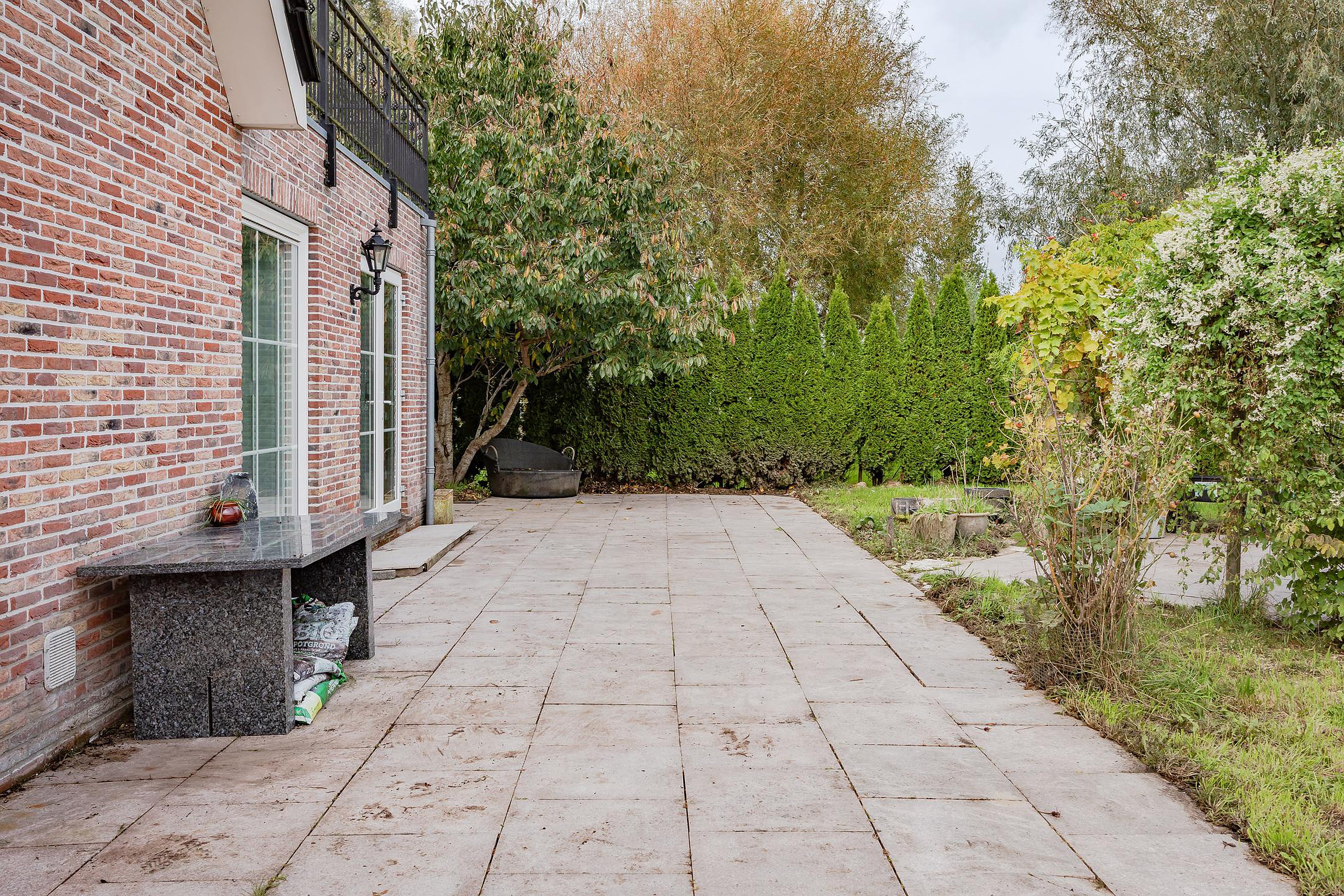 Een voortuin met elektrisch te bedienen hek voor het parkeren van de auto op eigen terrein, ommuurde schutting met sier hekwerk en grotendeels bestraat. Naast de woning staat een halfopen berging voor fietsen en tuinspullen. Rondom de woning is alles bestraat en er zijn nog extra tegels die achterblijven. In de achtertuin is een groot terras met niet alleen een schitterend uitzicht over de weilanden maar ook enorm veel privacy. Er zijn overigens meerdere terrassen, een pergola en een groot waterterras grenzend aan een sloot.
