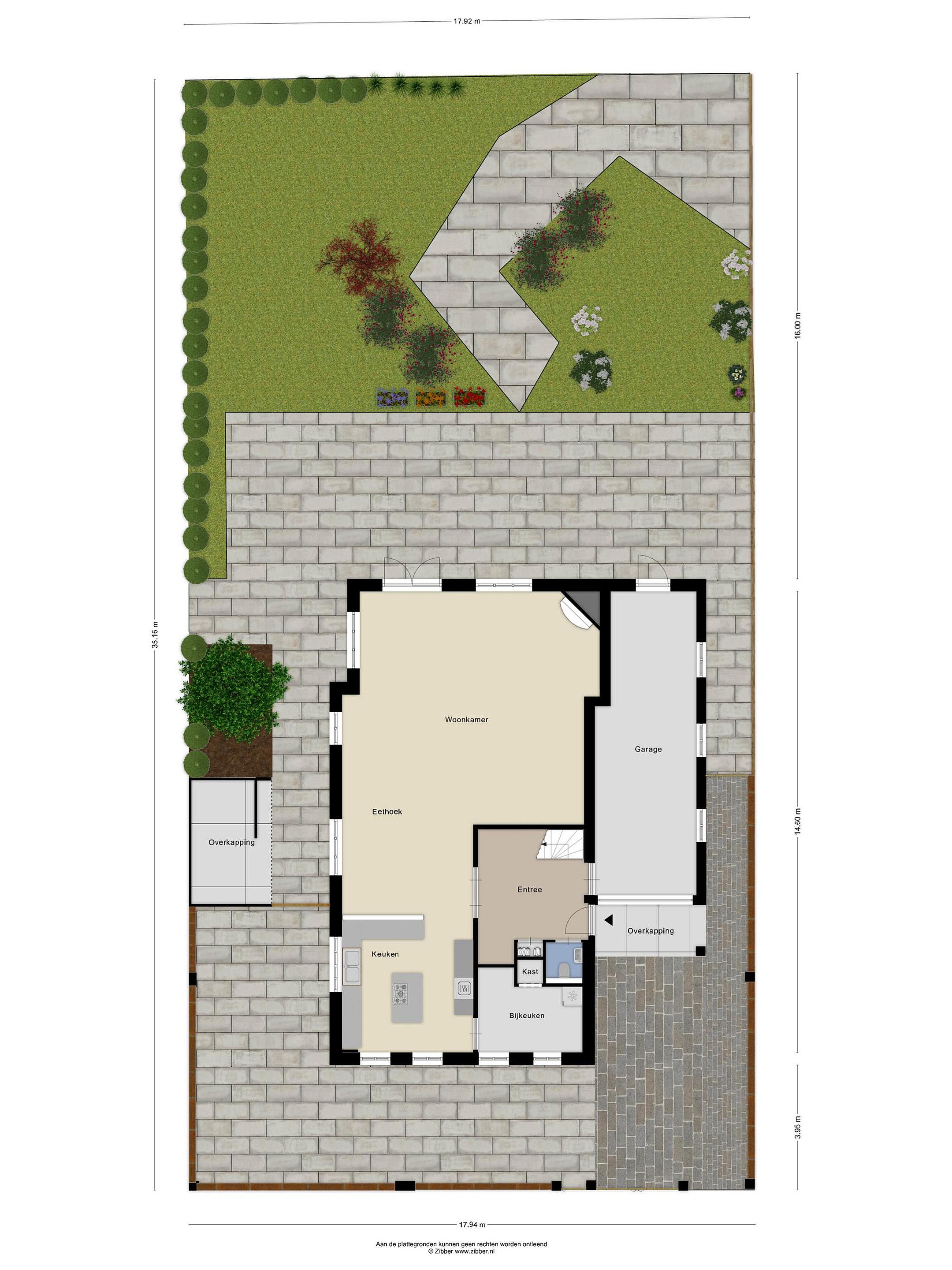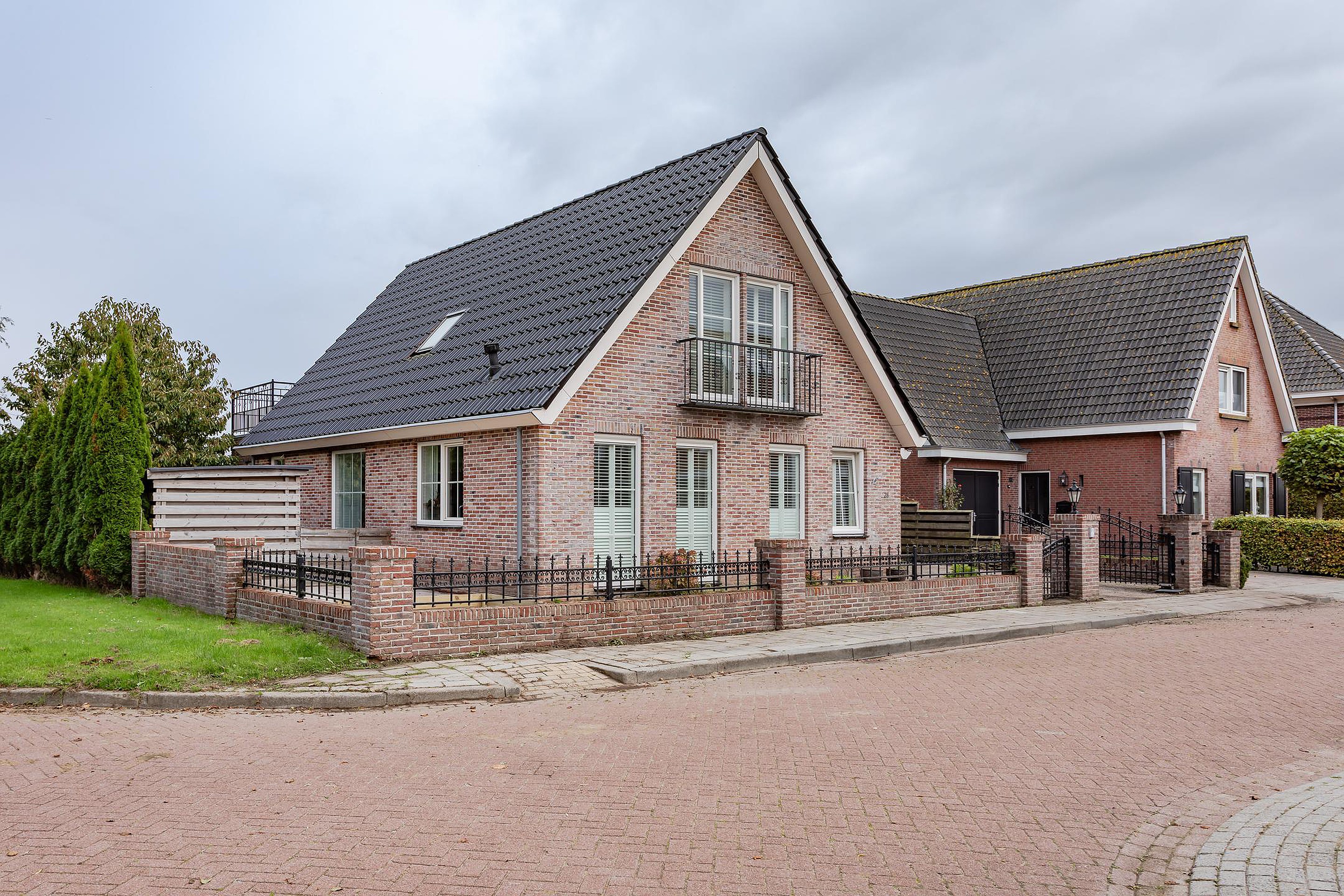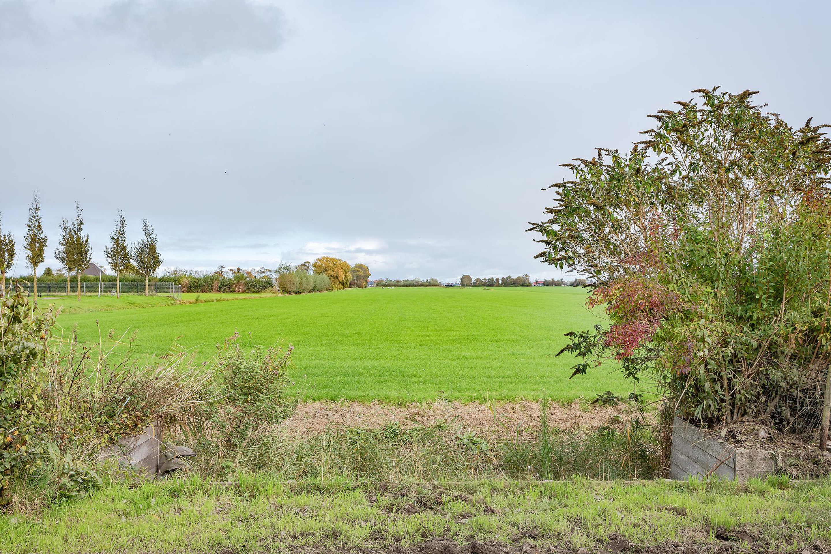 Een voortuin met elektrisch te bedienen hek voor het parkeren van de auto op eigen terrein, ommuurde schutting met sier hekwerk en grotendeels bestraat. Naast de woning staat een halfopen berging voor fietsen en tuinspullen. Rondom de woning is alles bestraat en er zijn nog extra tegels die achterblijven. In de achtertuin is een groot terras met niet alleen een schitterend uitzicht over de weilanden maar ook enorm veel privacy. Er zijn overigens meerdere terrassen, een pergola en een groot waterterras grenzend aan een sloot.