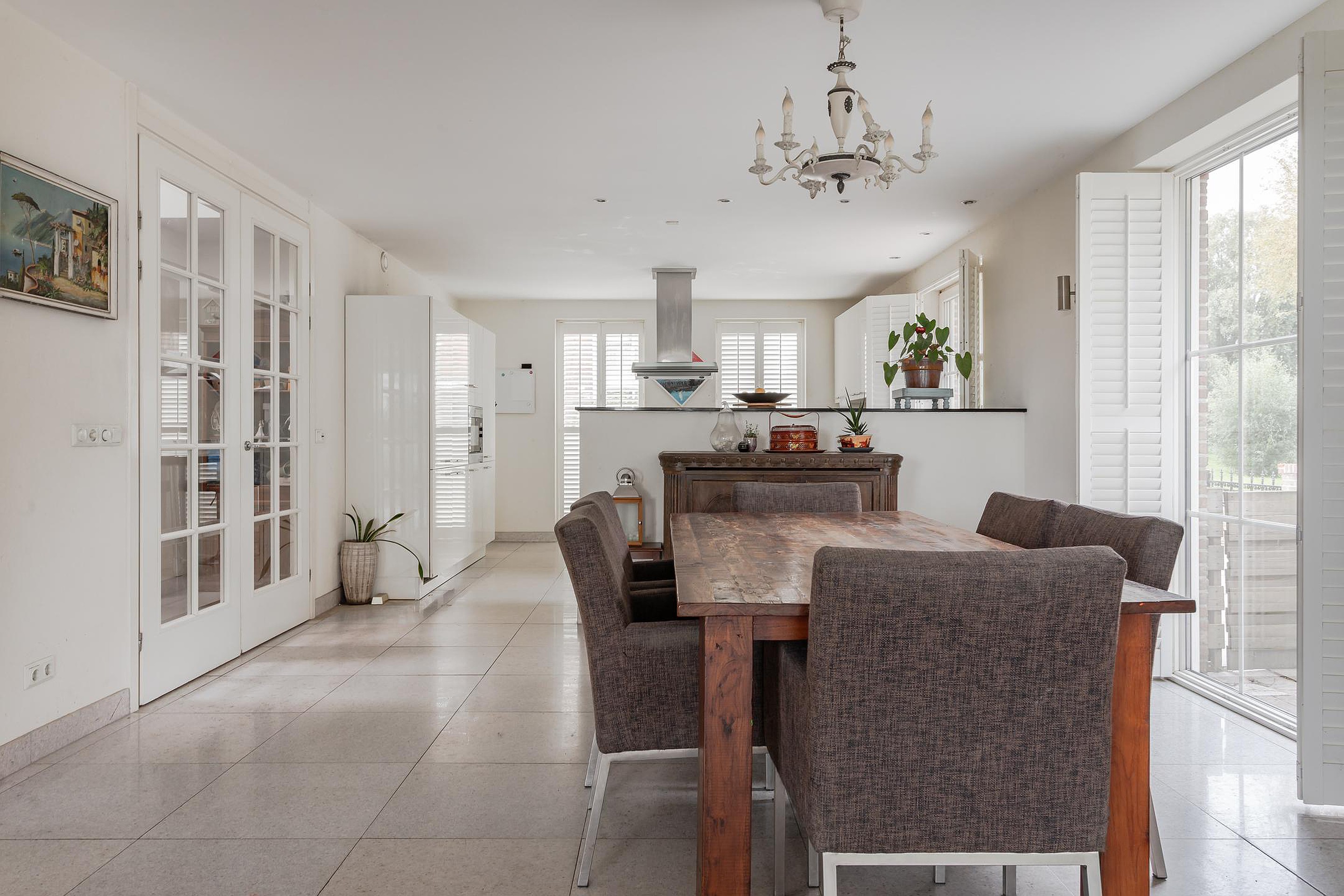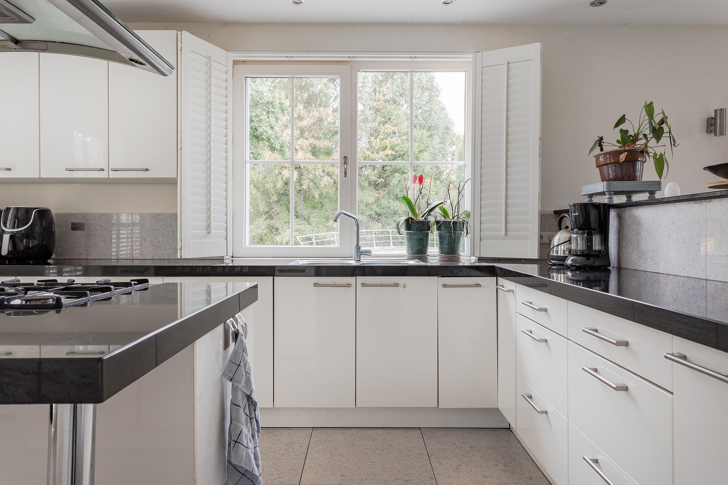 Een halve wand vormt de afscheiding tussen de living en de keuken zodat er direct contact is en natuurlijk het uitzicht over de weilanden! De keuken is in een hoekopstelling geplaatst met een natuurstenen werkblad met dito spatrand, veel laden, kastruimte, carrouselkast, dubbele spoelbak, close-in boiler en de vaatwasser en boven het werkblad een draai/kiepraam. De keuken heeft een kookeiland met 6 pits fornuis en brede oven, afzuigkap met de afvoer naar buiten, kastruimte en een eetbar. Er staat een wandkast met een groot formaat koelkast en dito separate vriezer, de combi-oven/magnetron en ook hier veel kastruimte. Ook bij de keuken zijn de ramen tot aan de vloer met shutters en een paneeldeur geeft toegang tot de bijkeuken.
