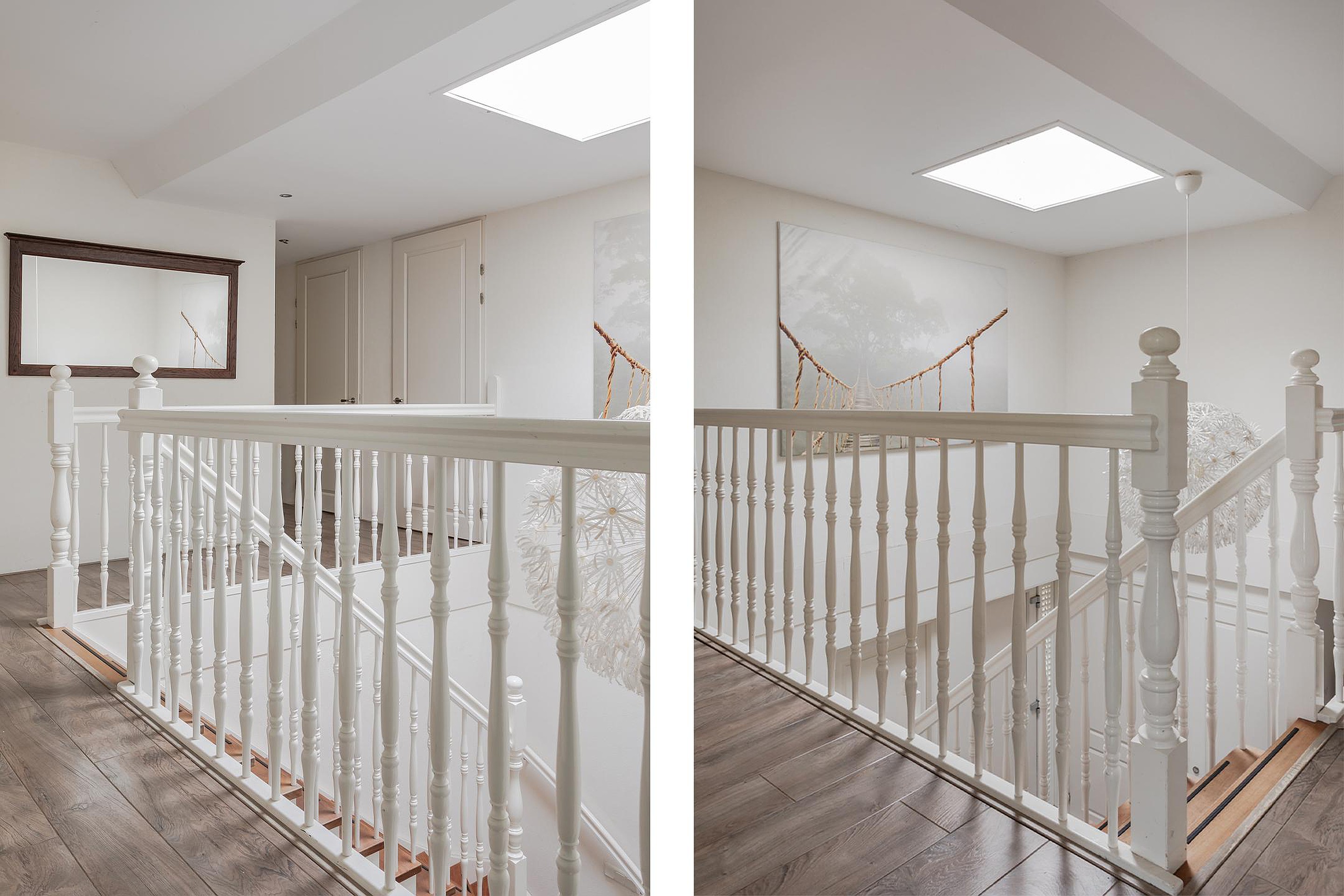 Vanuit de hal heeft de houten trapopgang toegang tot de ruime en speelse vide met veel lichtinval vanwege het daglicht. Op de hele verdieping zijn de wanden spachtelputz gestuukt en de plafonds strak gestuukt met inbouwspots. Op de betonnen verdiepingsvloer ligt laminaat wat in alle slaapkamers is doorgelegd. Alle vertrekken hebben massief houten paneeldeuren en houten deurposten. Tegenover de waskamer zijn op de overloop 3 vaste kasten dus alle schone lakens, handdoeken en overig wasgoed kan direct worden opgeruimd.