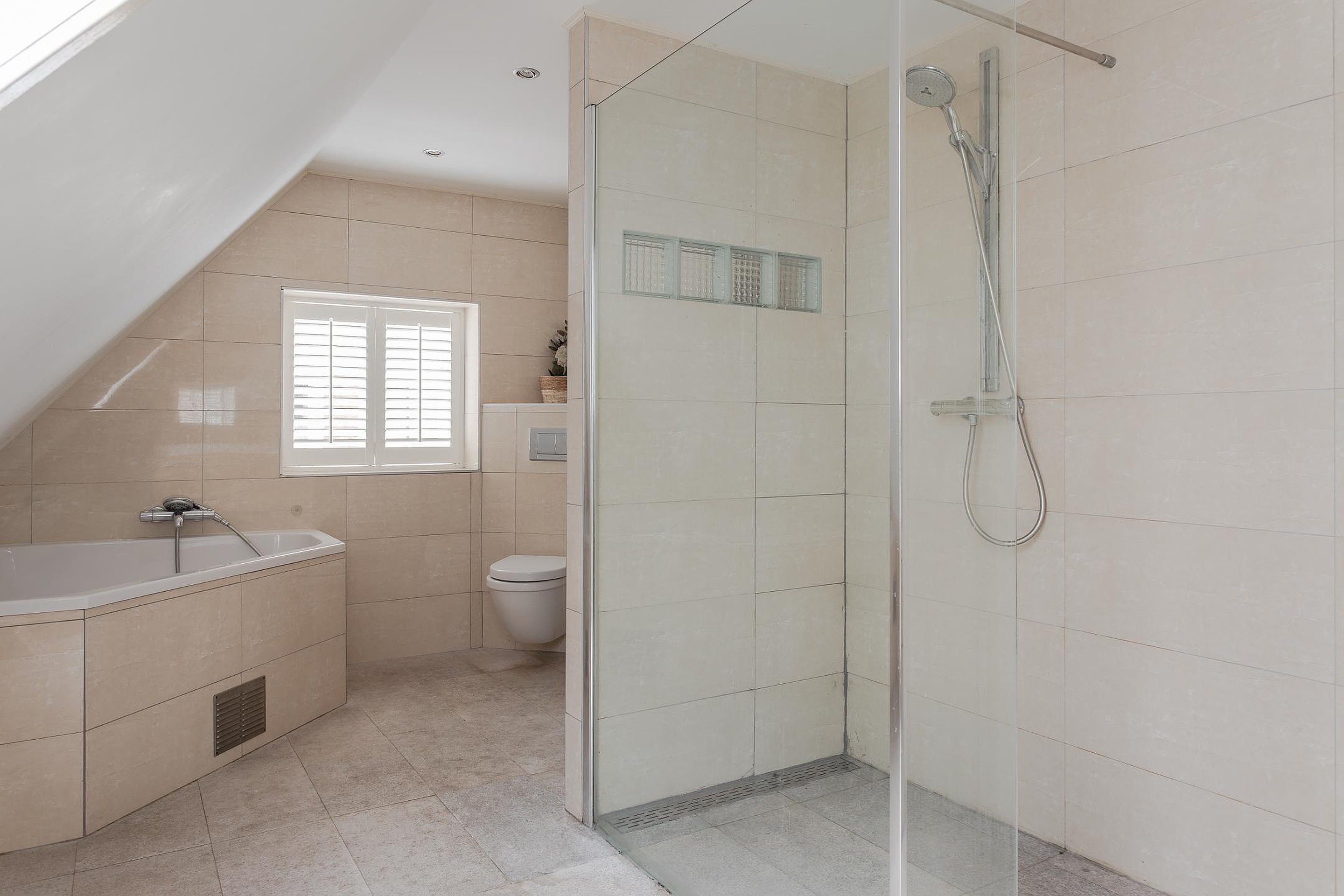 Royale badkamer met lichte vloertegels voorzien van vloerverwarming en de wanden zijn ook licht betegeld. In het gestuukte plafond zijn inbouwspots voor de verlichting. Deze speels ingerichte badkamer voorziet in een wastafelmeubel met 2 wastafels en 4 laden, een hoekbad met thermostaatkraan, handdouche en jacuzzi, 2e wandcloset, designradiator en een inloopdouche met glazen wanden, thermostaatkraan en drainafvoer. Er is een centraal afzuigsysteem en een Velux dakraam kan open voor de natuurlijke ventilatie. Aan de straatzijde is ook nog een vast raam met shutters.