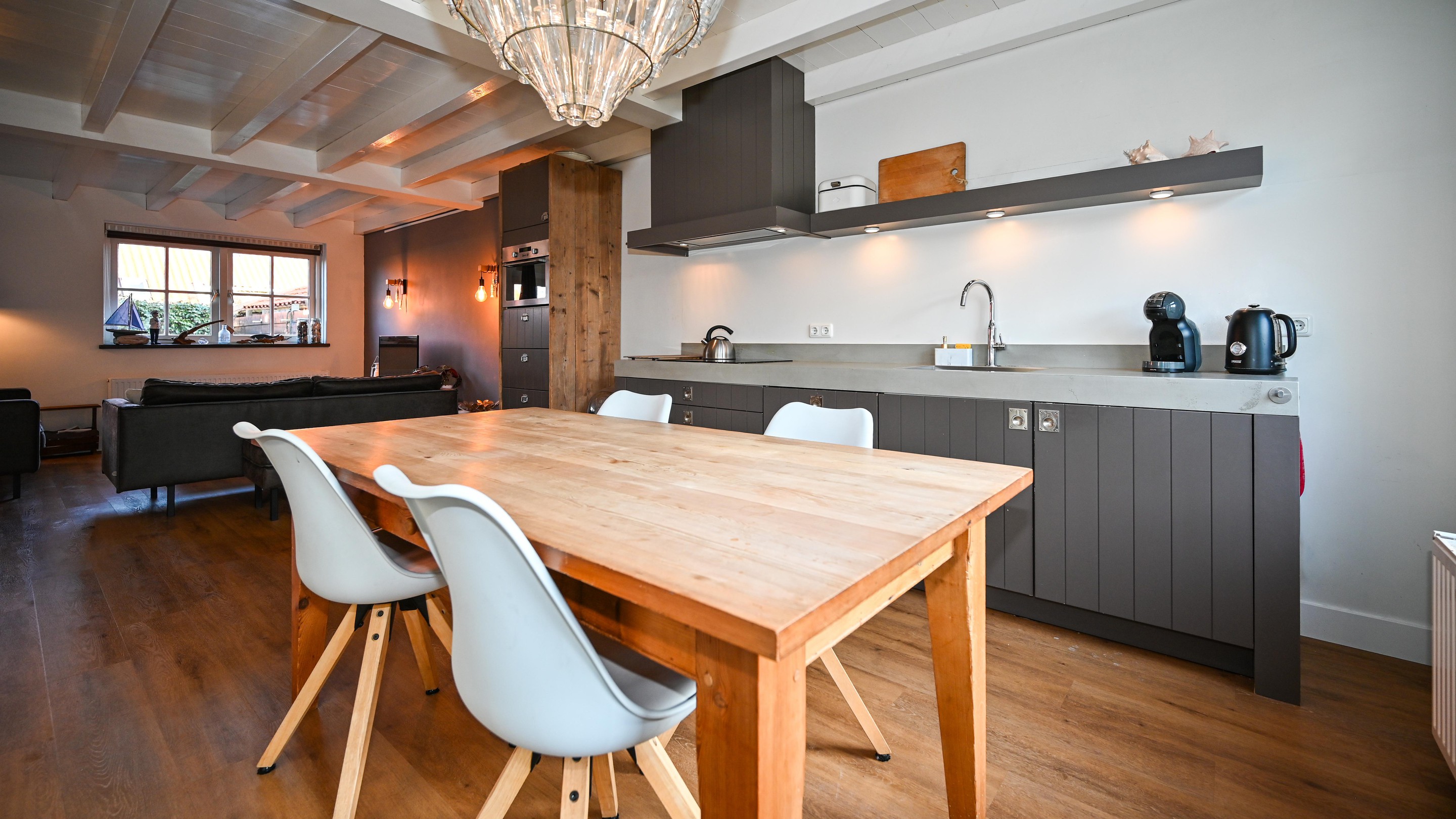 De begane grond is ingericht als een prettige en open leefruimte waar woonkamer en keuken vloeiend in elkaar overlopen. De keuken, compleet met moderne inbouwapparatuur, vormt samen met de eettafel het warme middelpunt van de woning, een plek die uitnodigt tot lange avonden tafelen en samenzijn. Aansluitend bevindt zich de comfortabele zithoek met openslaande deuren naar het besloten terras aan de achterzijde. Ook is er een praktische trapkast met was-/droogcombinatie aanwezig. Dit terras is ruim opgezet, biedt volop privacy en is een heerlijke plek om beschut te genieten van het buitenleven. Bij de entree bevindt zich een separaat toilet, uitgevoerd in dezelfde verzorgde stijl als de rest van Wad&zee. De verdieping beschikt over drie slaapkamers. De hoofdslaapkamer is ingericht met een tweepersoonsbed, terwijl één van de andere kamers is voorzien van een stapelbed, ideaal voor (jonge) gasten. De derde slaapkamer biedt eveneens ruimte voor comfortabel verblijf. De badkamer is modern en fris uitgevoerd en beschikt over een douche, wastafel en tweede toilet. Middels een vlizotrap op de overloop is een praktische, afsluitbare bergzolder bereikbaar.