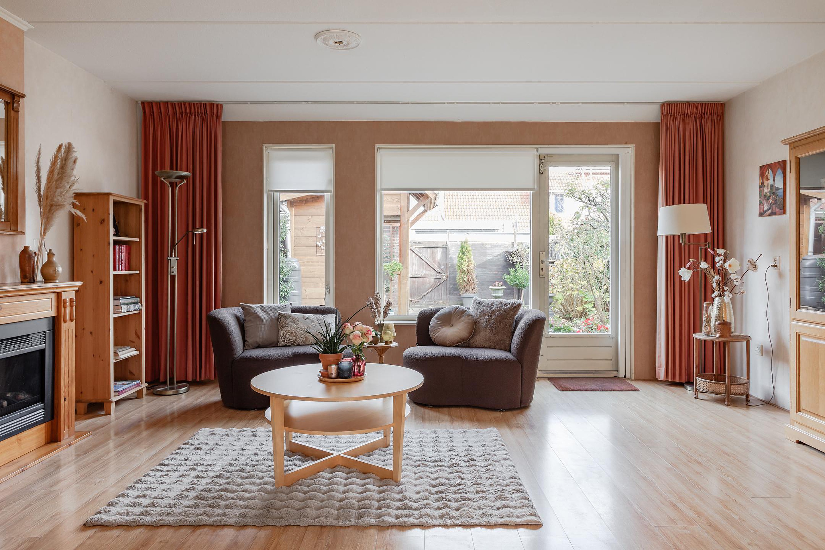 Ruime en brede tuingerichte living waar de lichte Lamett vloer vanuit de hal is doorgelegd. De wanden zijn behangen, er is een praktische trapkast. In een houten ombouw zit een elektrisch sierkacheltje en de living wordt verwarmd door heteluchtverwarming dus geen stoffige radiatoren! Het zijraam kan open voor de natuurlijke ventilatie en dat kan natuurlijk ook door de tuindeur met hor op een kiertje te zetten.