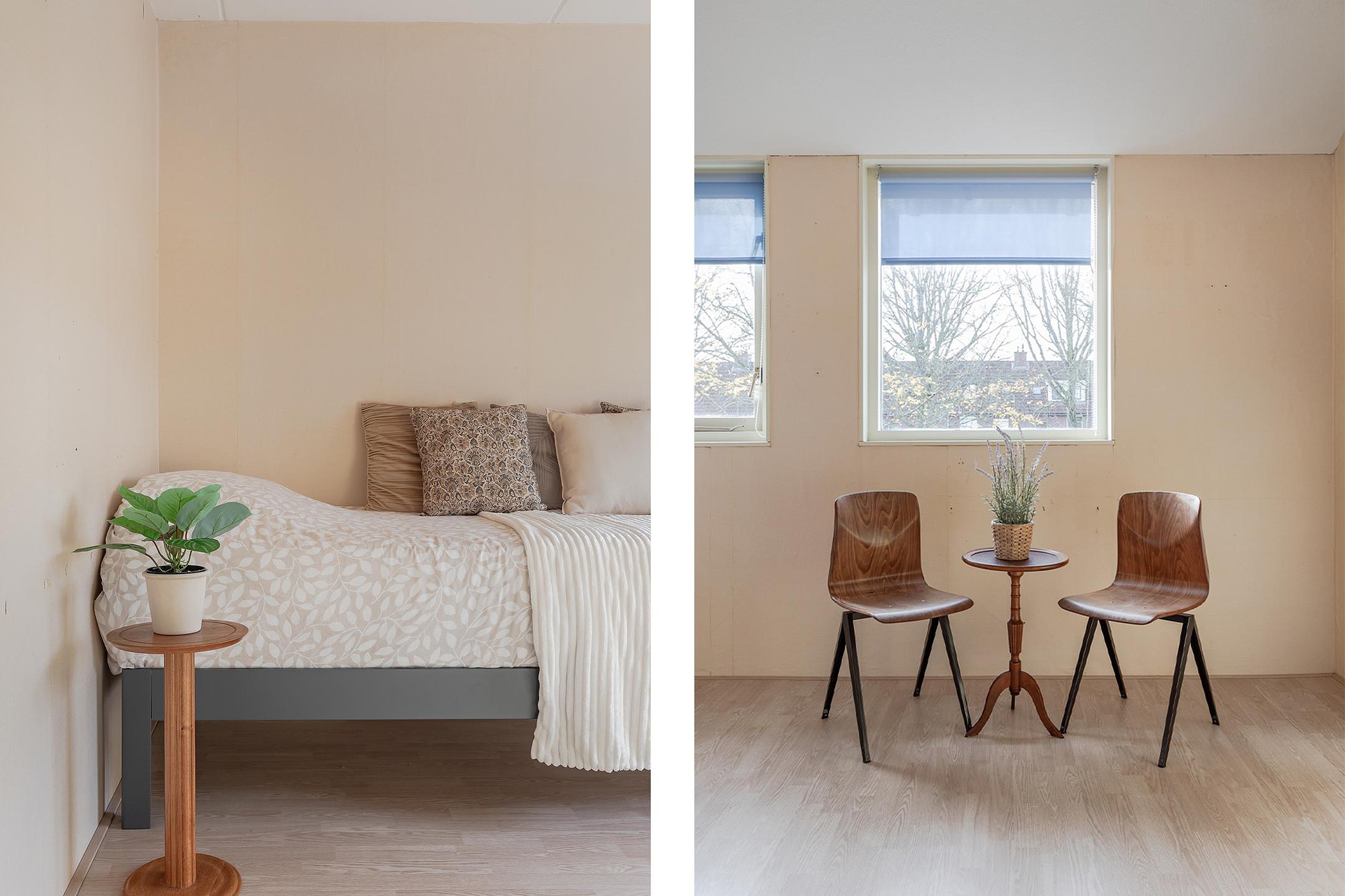 2e Slaapkamer achterzijde – ruime kamer met recht opgetrokken wanden, een groot raam en zijraam met hor. Voor de warme zomernachten is er een airco geplaatst en op de vloer ligt zeil.