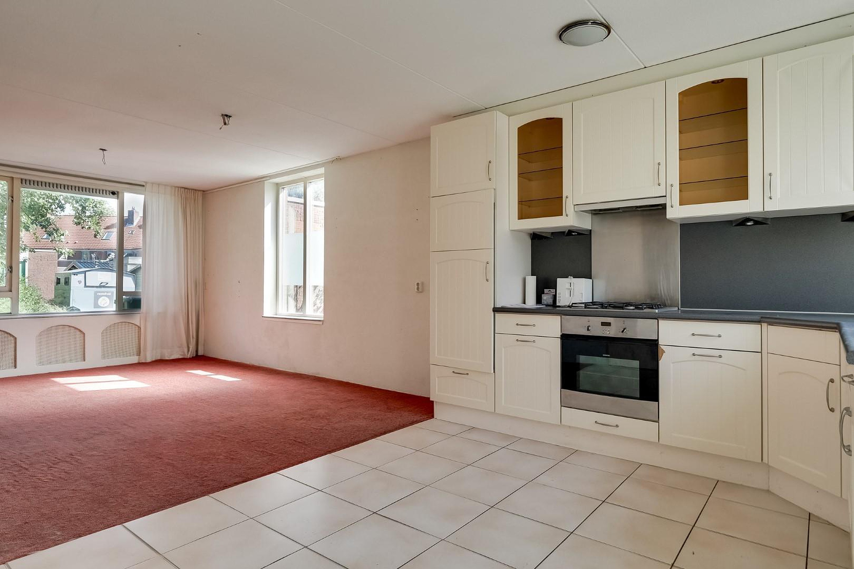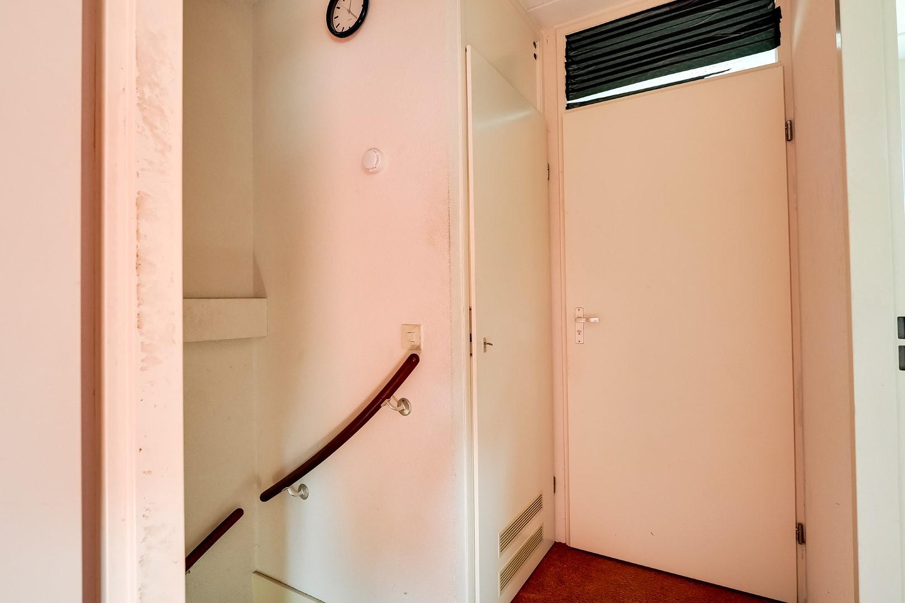 Entree/hal met meterkast, woonkamer met bergkast, open keuken met inbouwapparatuur zoals oven, gaskookplaat, koelkast en afzuigkap, tussenhal met toilet en trapopgang.