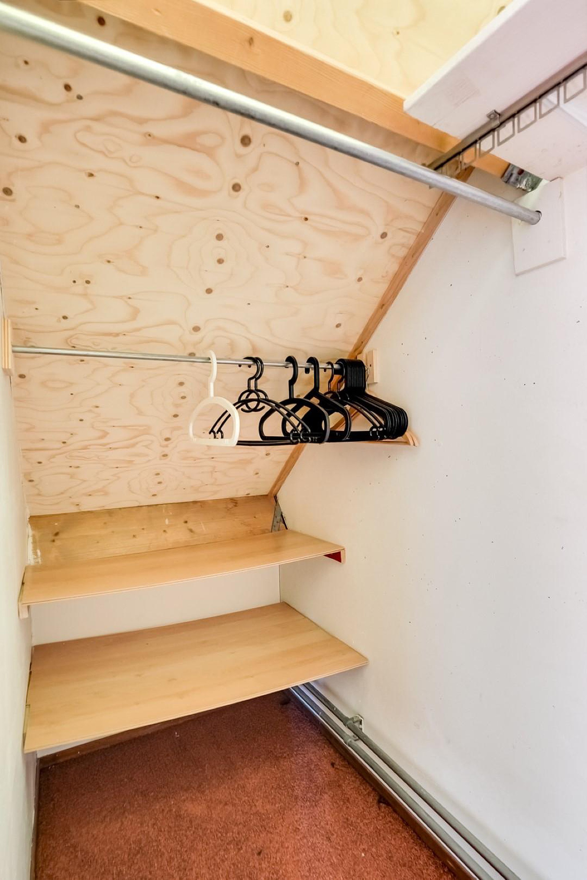 Overloop met wasmachinekast, badkamer met douche en wastafel, 2 slaapkamers waarvan 1 met vaste kast.