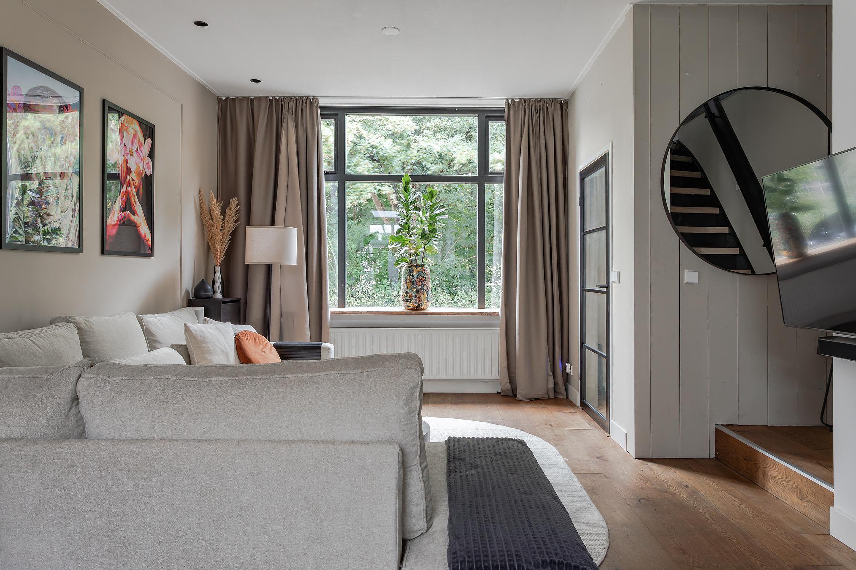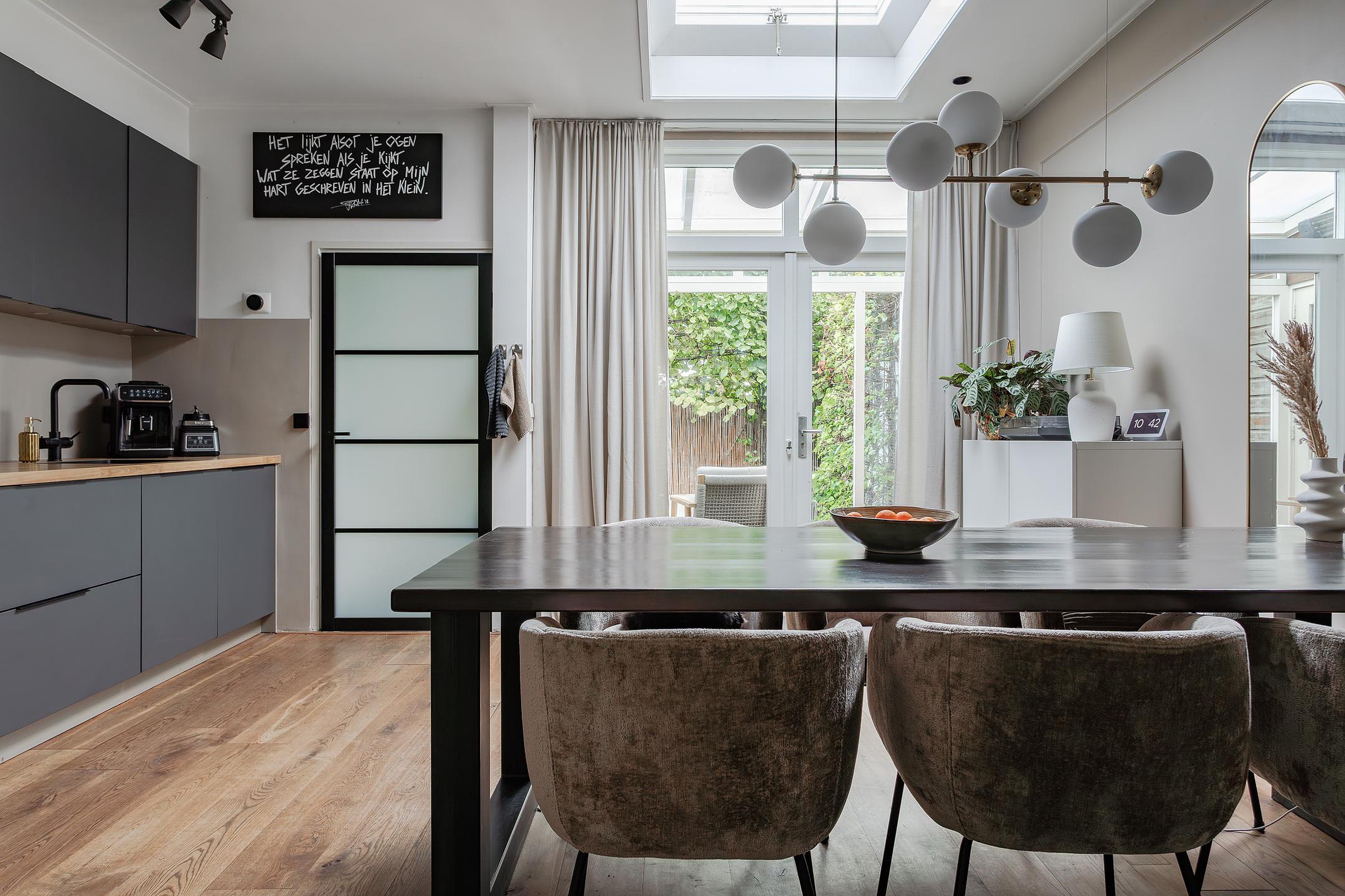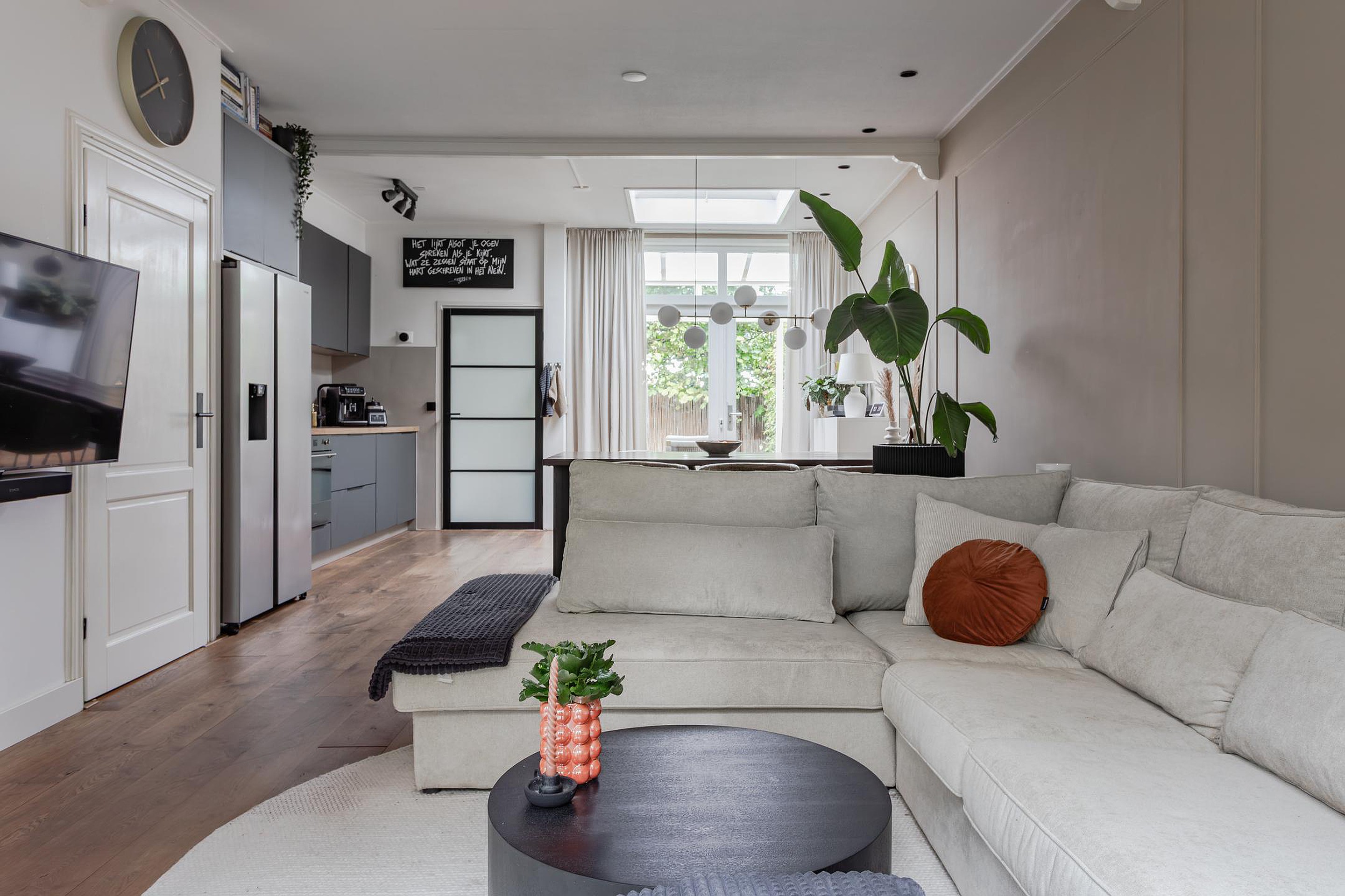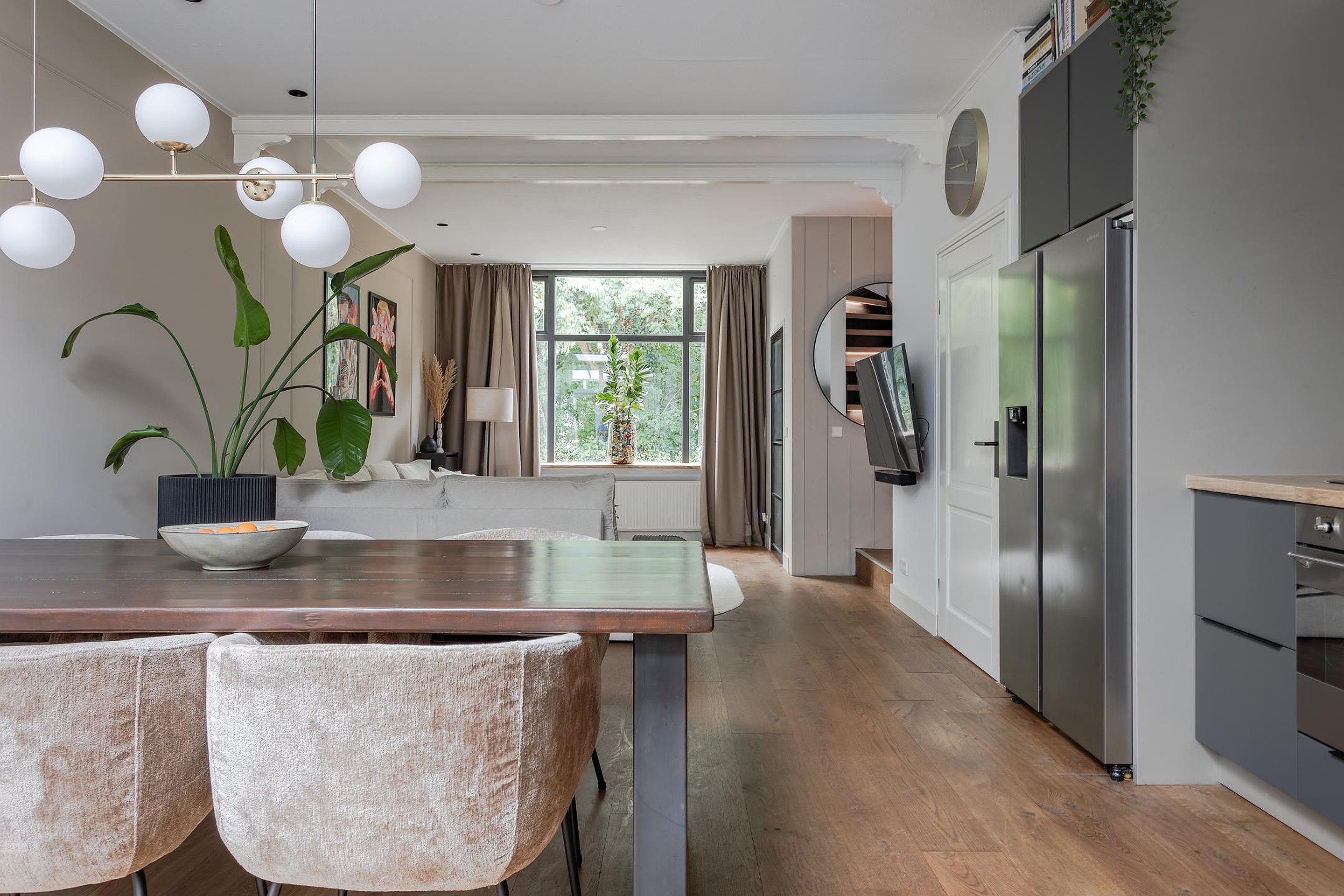 Sfeervolle en vooral royale living met een grote raampartij bij de zithoek en zicht op Gemeentegroen dus geen inkijk van overburen. Op de vloer ligt een massief houten vloer die vanuit de hal is doorgelegd, de wanden zijn gestuukt en het hoge plafond met inbouwspots heeft sierbalken. Naast de trapopgang geeft een paneeldeur toegang tot de diepe trapkast. De eethoek is gesitueerd in de aanbouw waar een groot daglicht zit die opengedraaid kan worden. Heel fijn op warme dagen! Vanuit de eethoek geven openslaande deuren toegang tot de tuin met een overkapping.