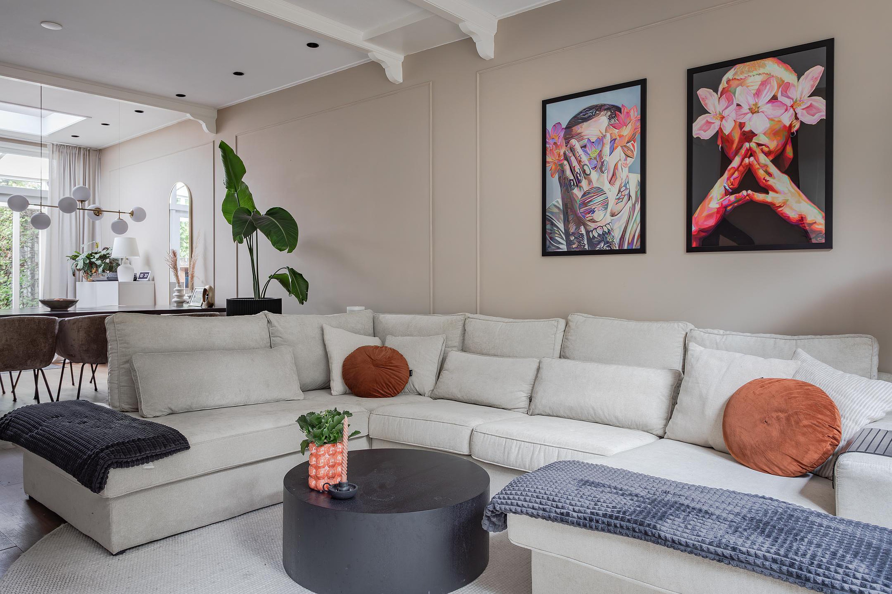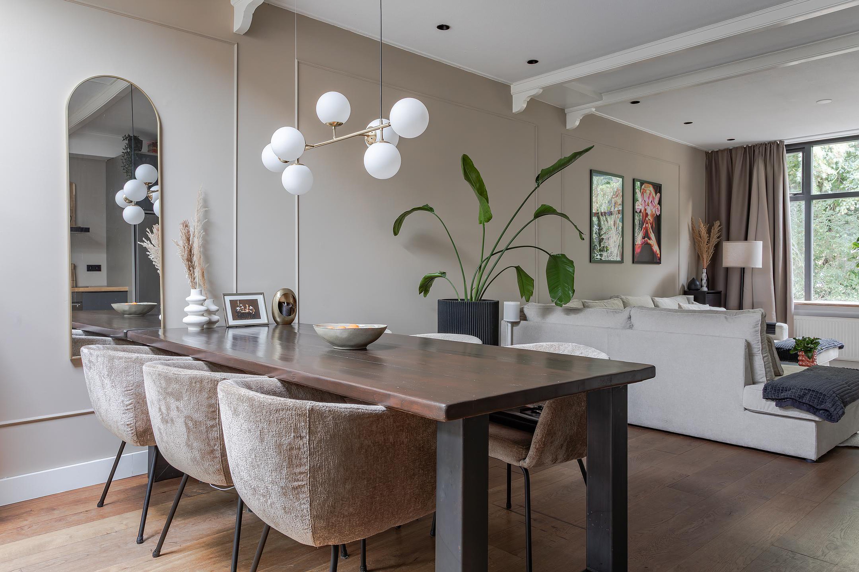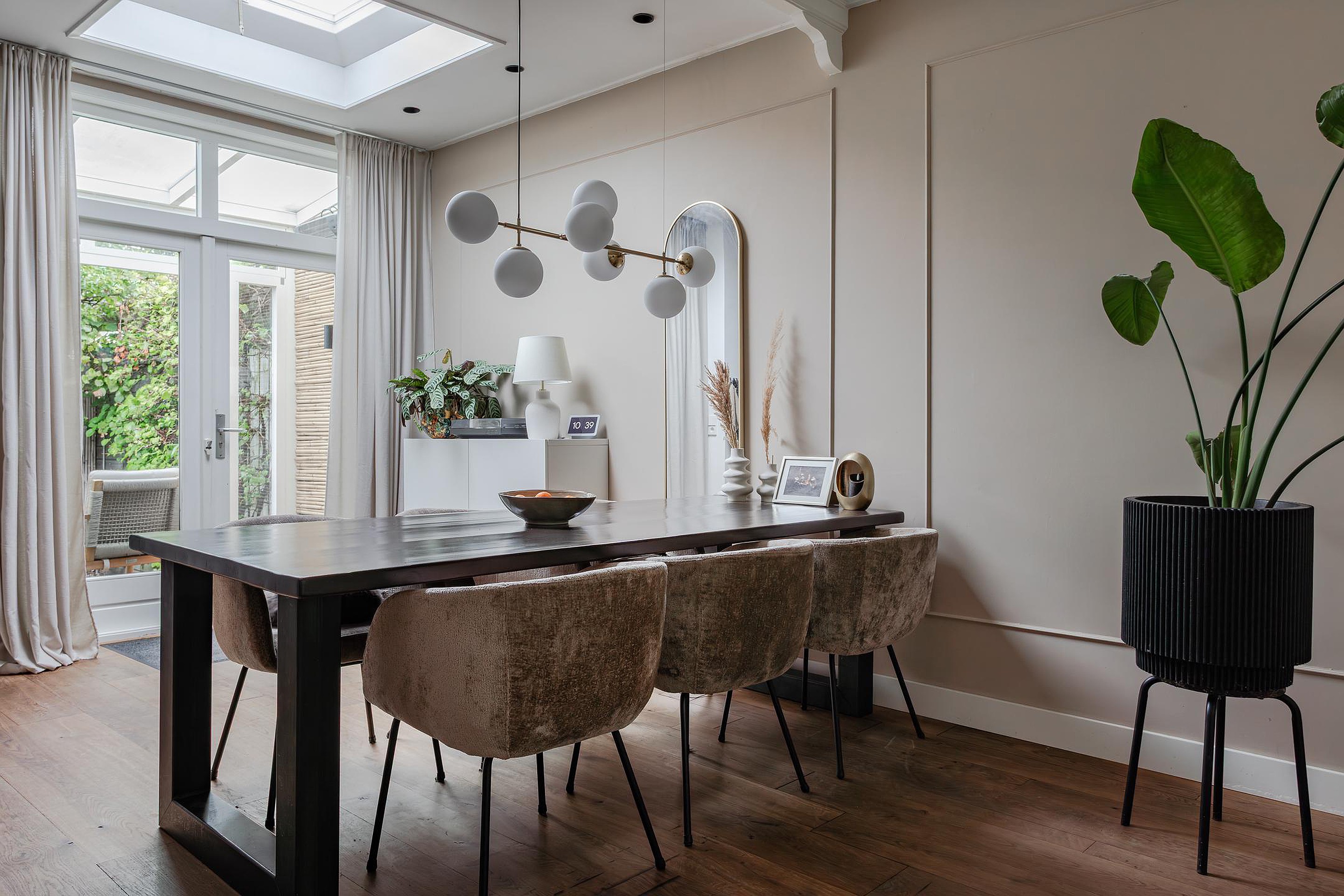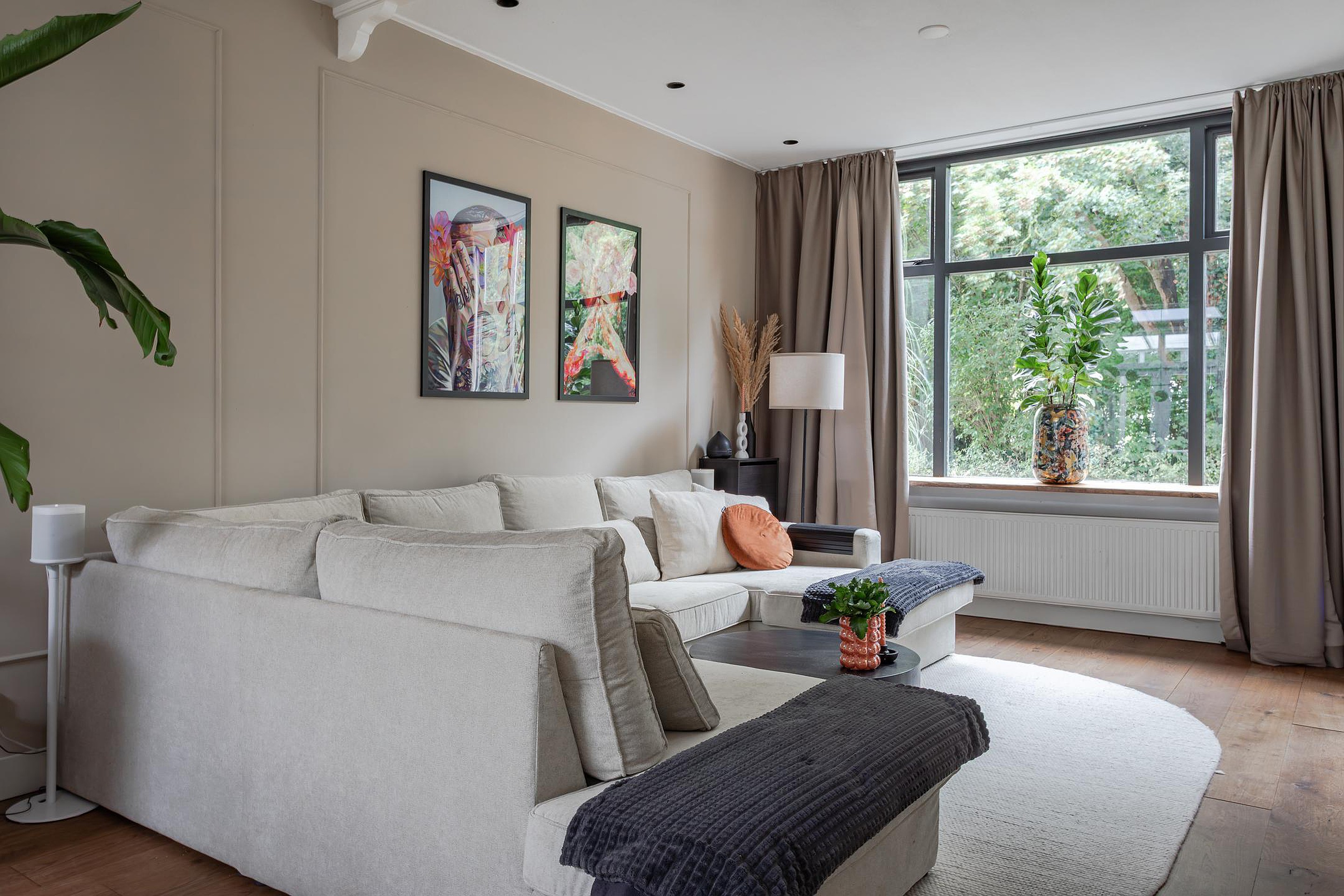 Sfeervolle en vooral royale living met een grote raampartij bij de zithoek en zicht op Gemeentegroen dus geen inkijk van overburen. Op de vloer ligt een massief houten vloer die vanuit de hal is doorgelegd, de wanden zijn gestuukt en het hoge plafond met inbouwspots heeft sierbalken. Naast de trapopgang geeft een paneeldeur toegang tot de diepe trapkast. De eethoek is gesitueerd in de aanbouw waar een groot daglicht zit die opengedraaid kan worden. Heel fijn op warme dagen! Vanuit de eethoek geven openslaande deuren toegang tot de tuin met een overkapping.