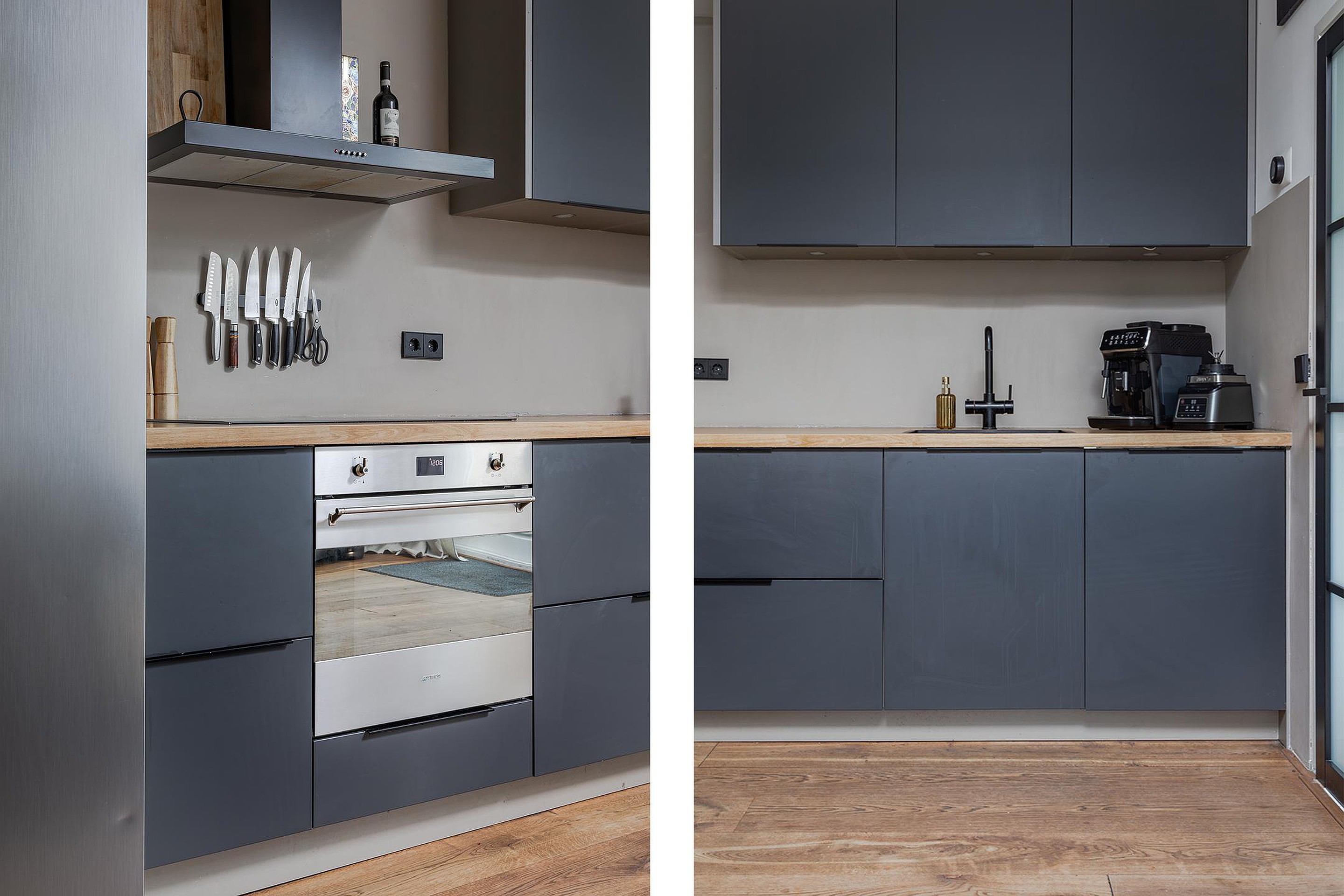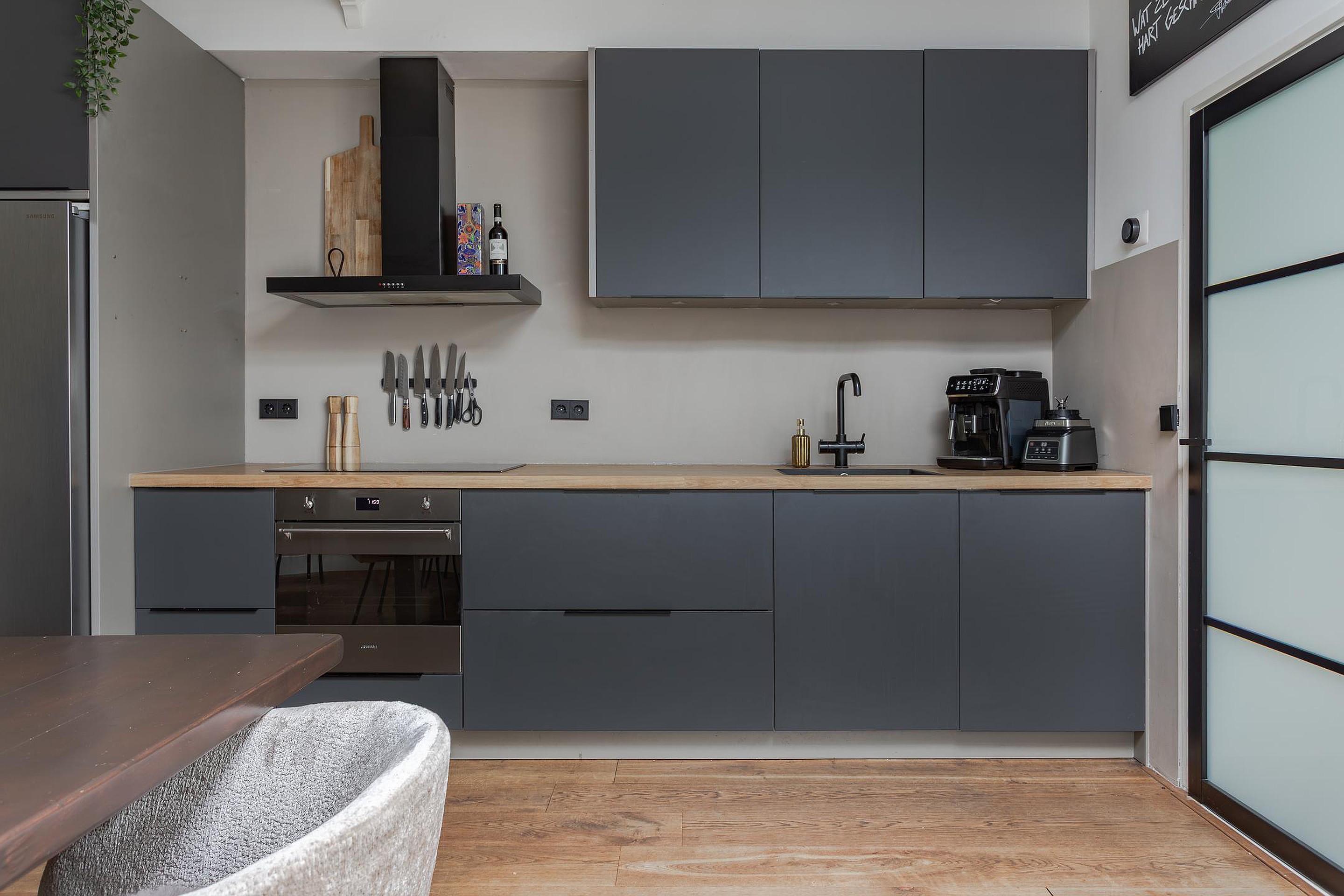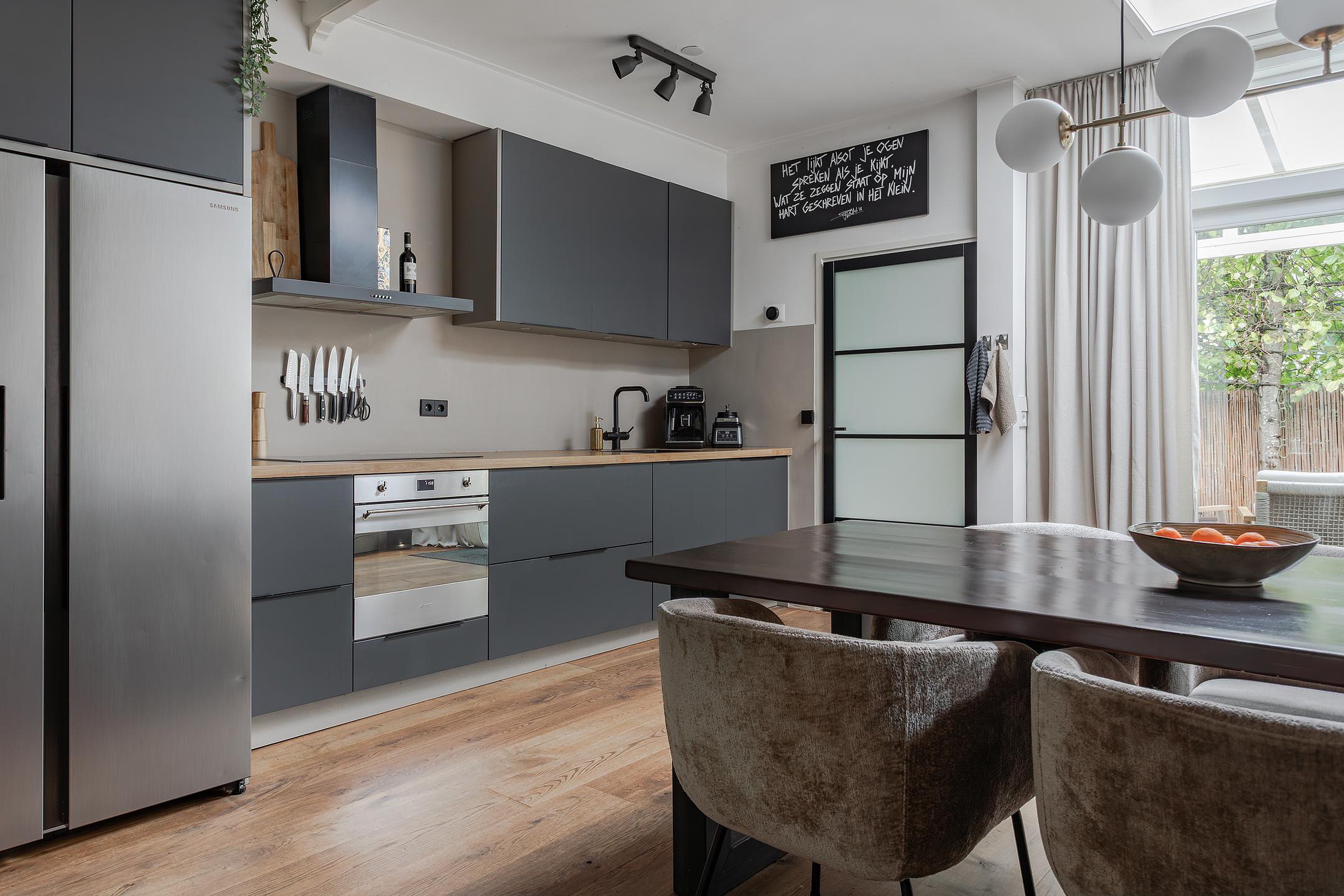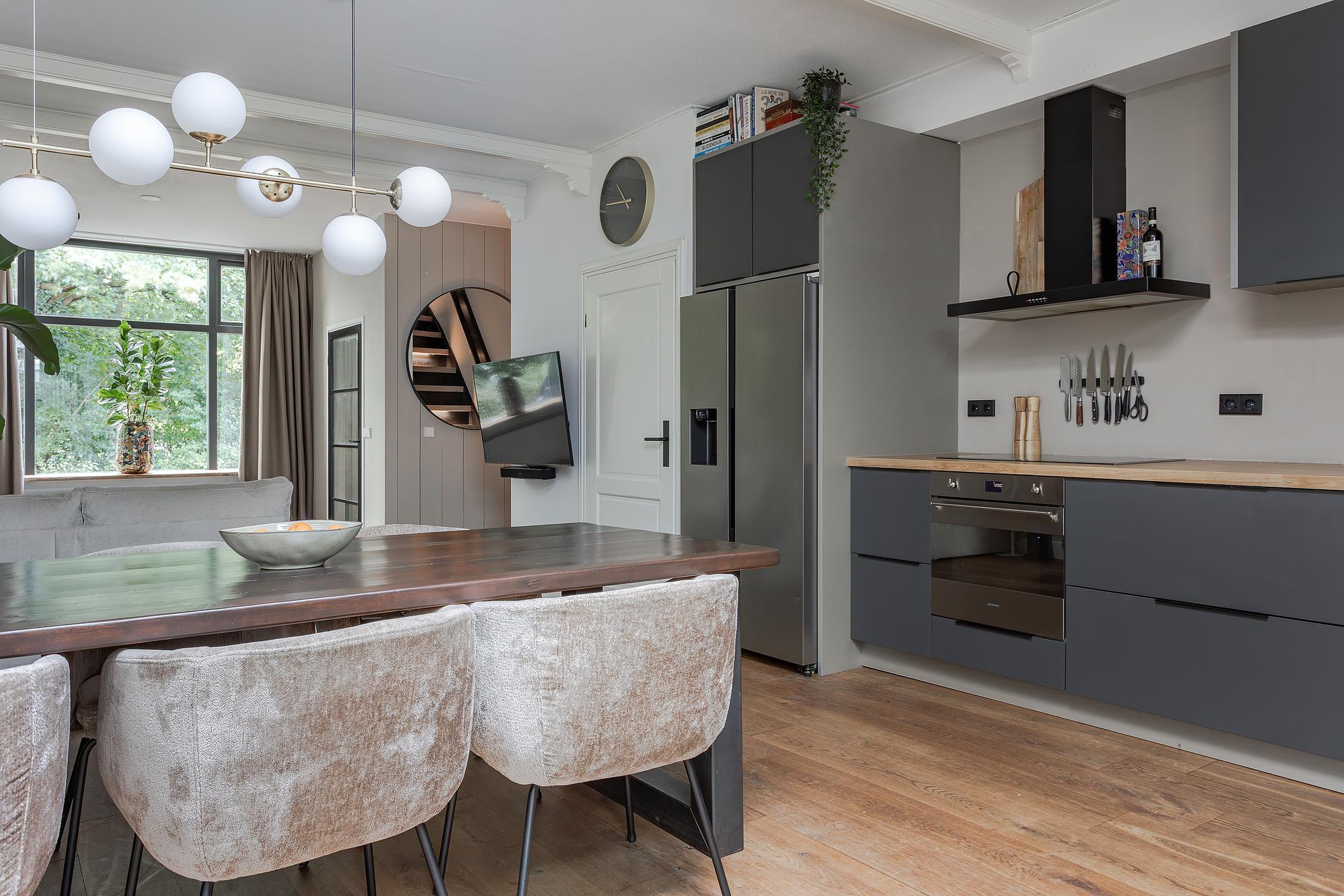 De trendy keuken in een rechte opstelling geplaatst waar in 2022 een nieuw en diep werkblad is geplaatst met een inductie kookplaat, diepe spoelbak en kokendheet waterkraan. Naast de vele laden en LED-bladverlichting is er een vaatwasser, heteluchtoven en afzuigkap met de afvoer naar buiten. De Amerikaanse koelkast met ijsblokjes en ijswater dispenser is 1 jaar oud en wordt ter overname aangeboden. Een hele fijne keuken met veel werkblad om uitgebreid te kokkerellen als de overige gezinsleden en/of gasten aan een grote eettafel zitten.