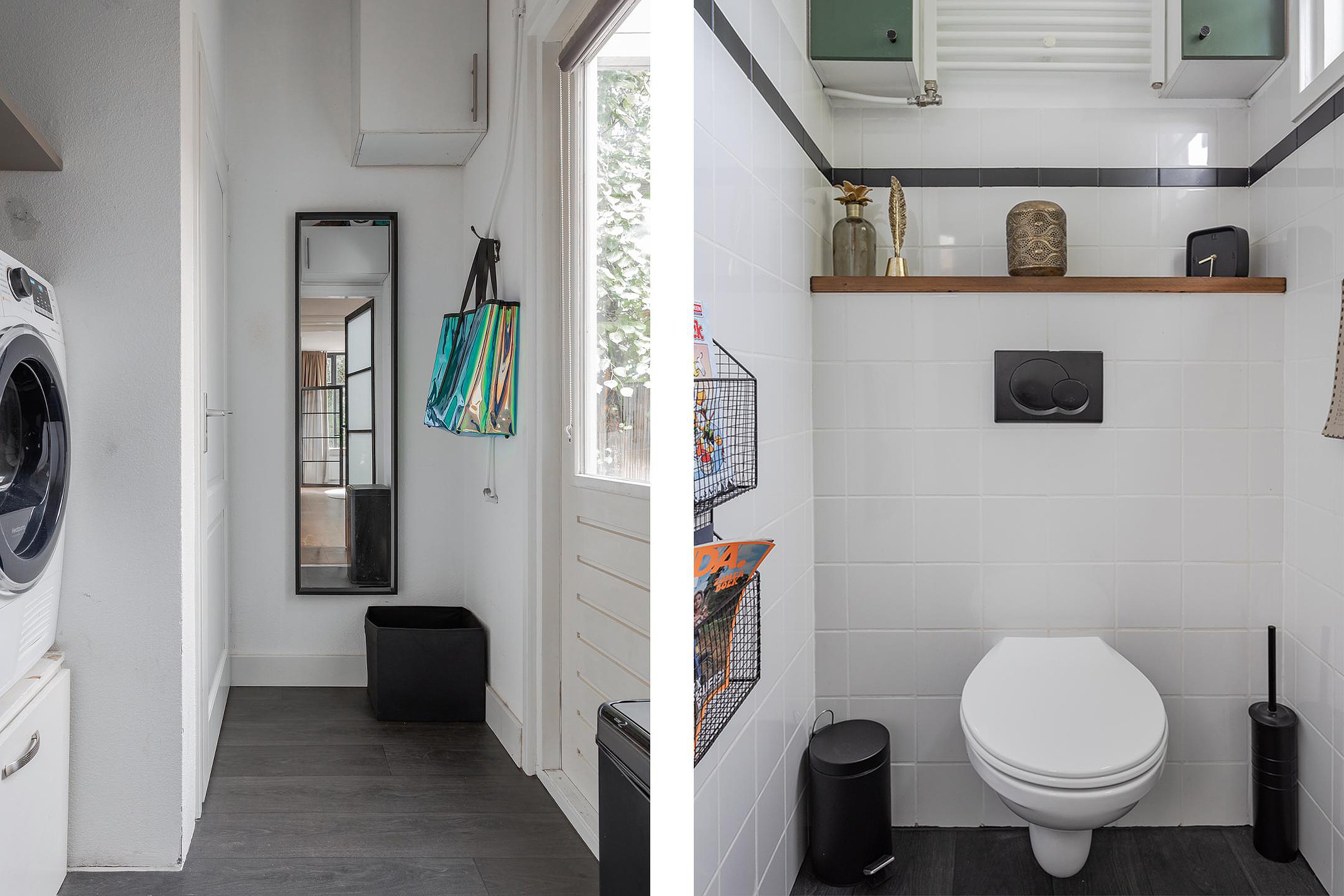 Vanuit de keuken geeft een moderne paneeldeur met melkglas toegang tot de bijkeuken met een buitendeur, de wasmachine- en drogeraansluiting op een verhoging, de cv-installatie, designradiator en de toiletruimte.