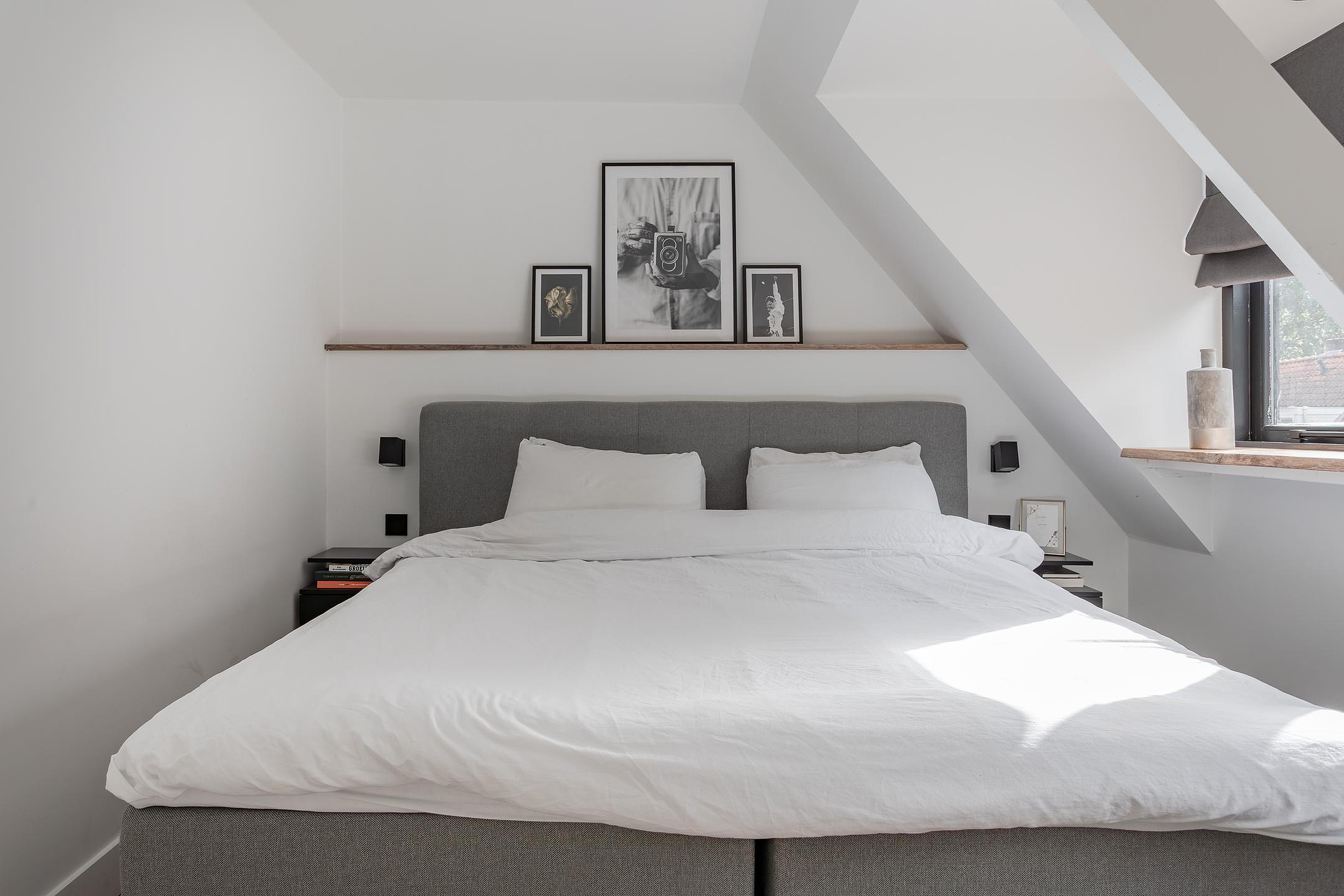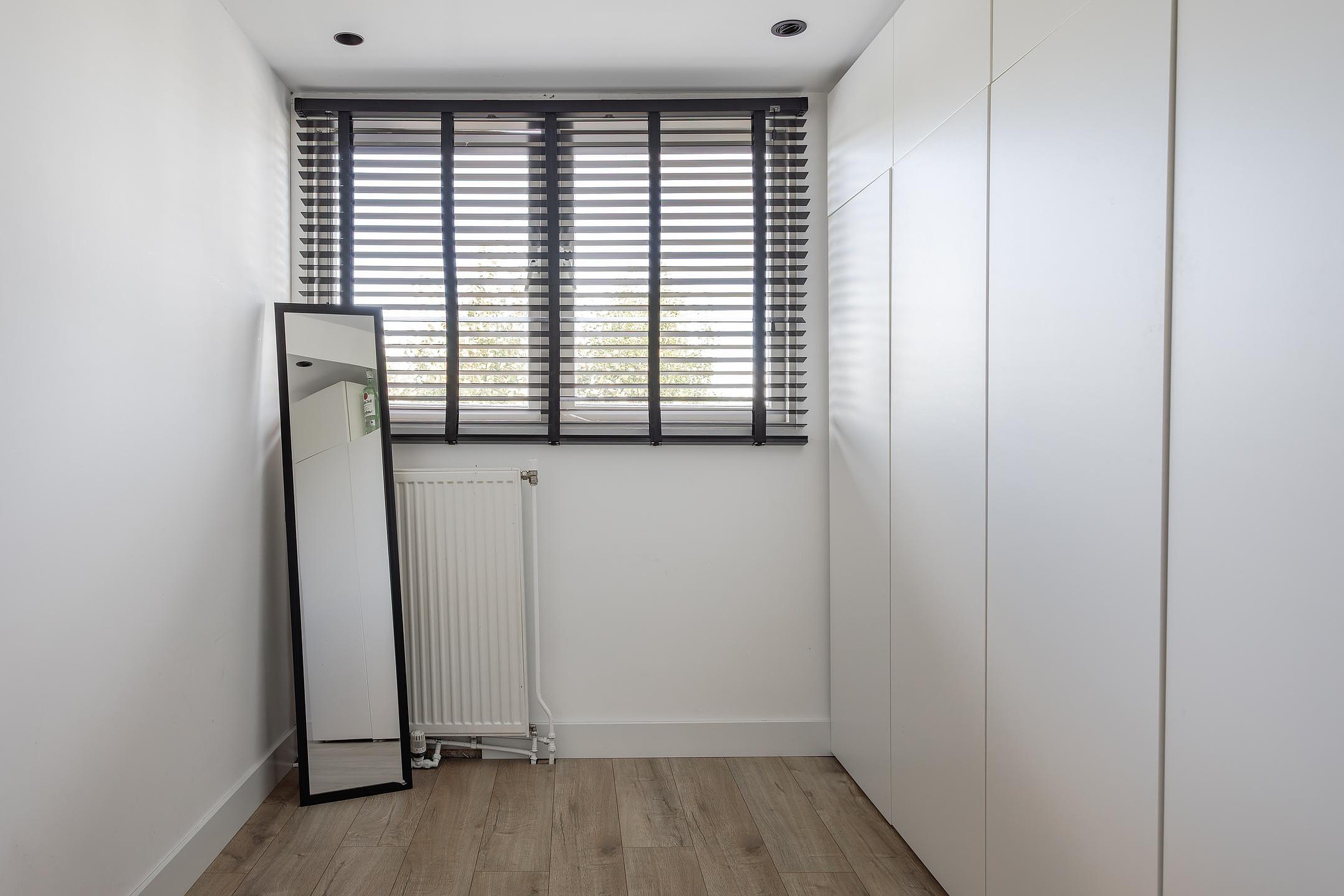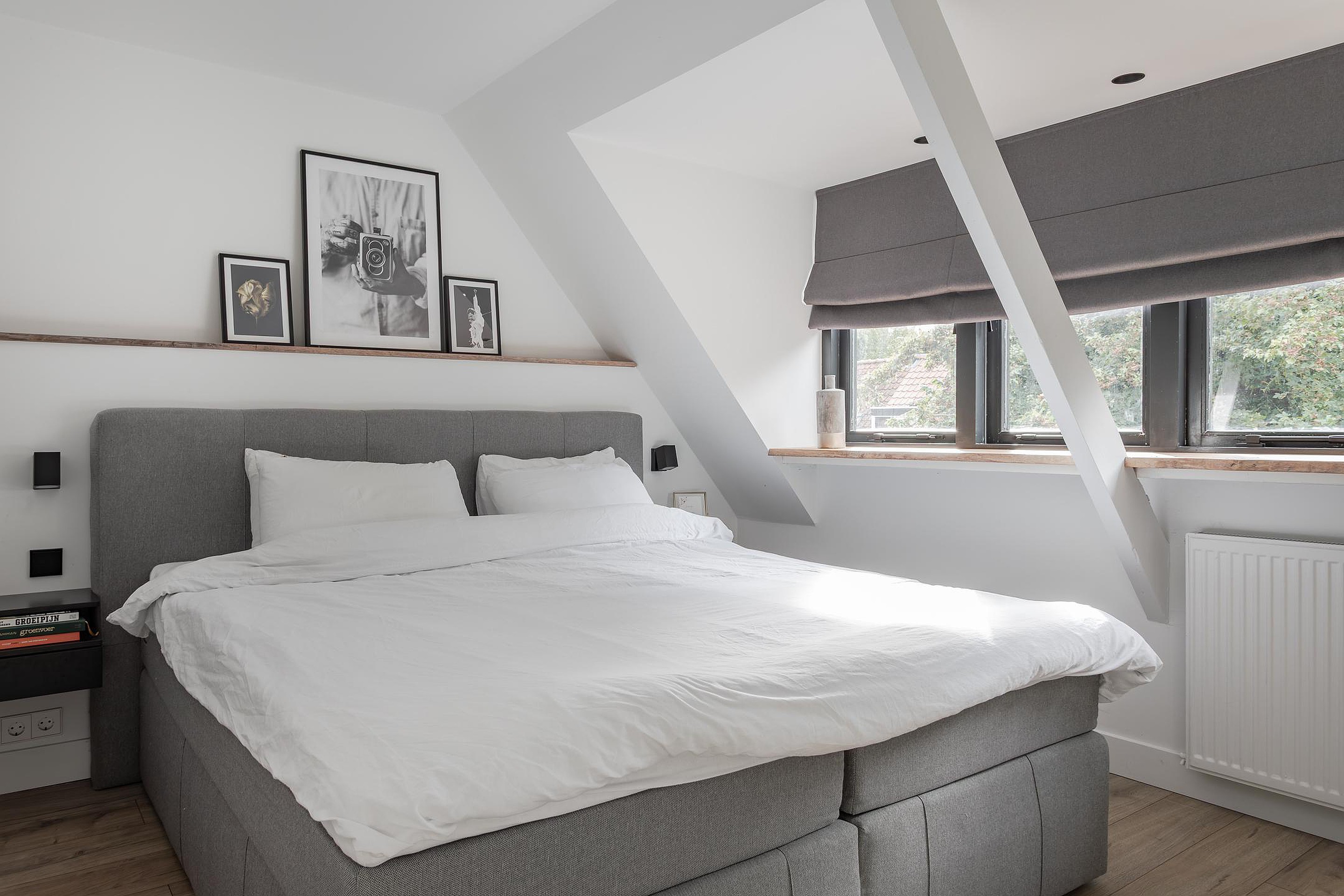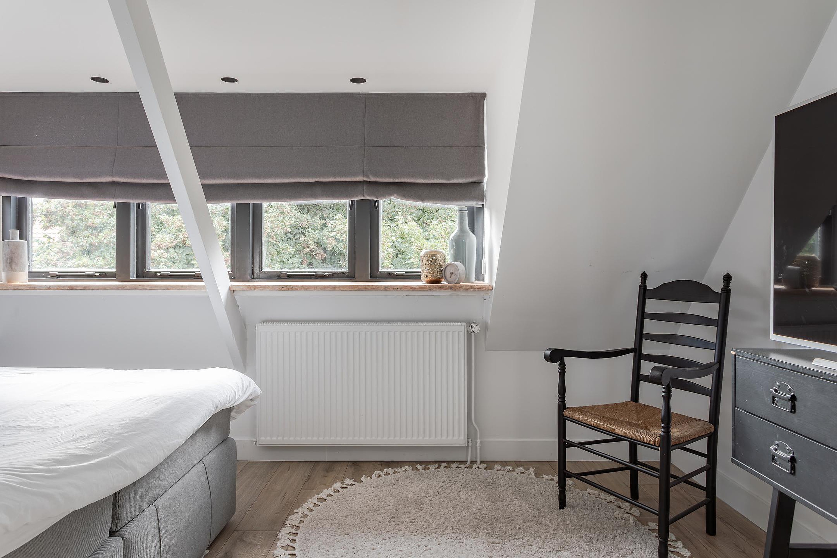 1e Slaapkamer voorzijde – royale kamer met een brede dakkapel met dubbel glas waar alle ramen open kunnen, brede houten vensterbanken en de wanden van de dakkapel zijn in 2024 vervangen. De wanden zijn strak gestuukt en daarna gespoten, inbouwspots verlichten de kamer en als er een warme zomer is, verkoelt de airco de slaapkamer dus je bent gegarandeerd van een goede nachtrust.