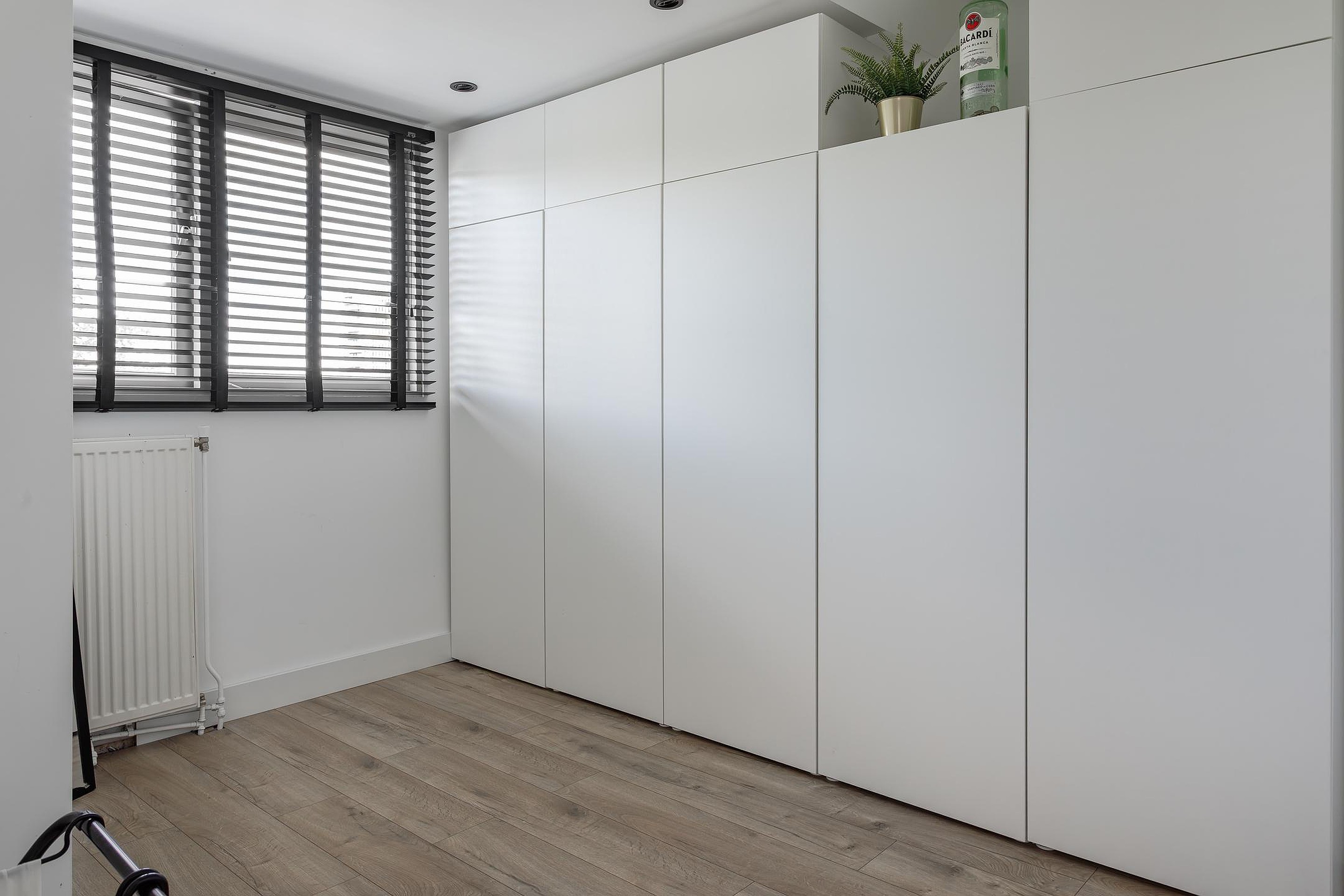 2e Slaapkamer achterzijde – ruime kamer met recht opgetrokken wanden, ook hier zijn de wanden strak gestuukt en gespoten en verlichting door middel van inbouwspots in het geïsoleerde plafond.