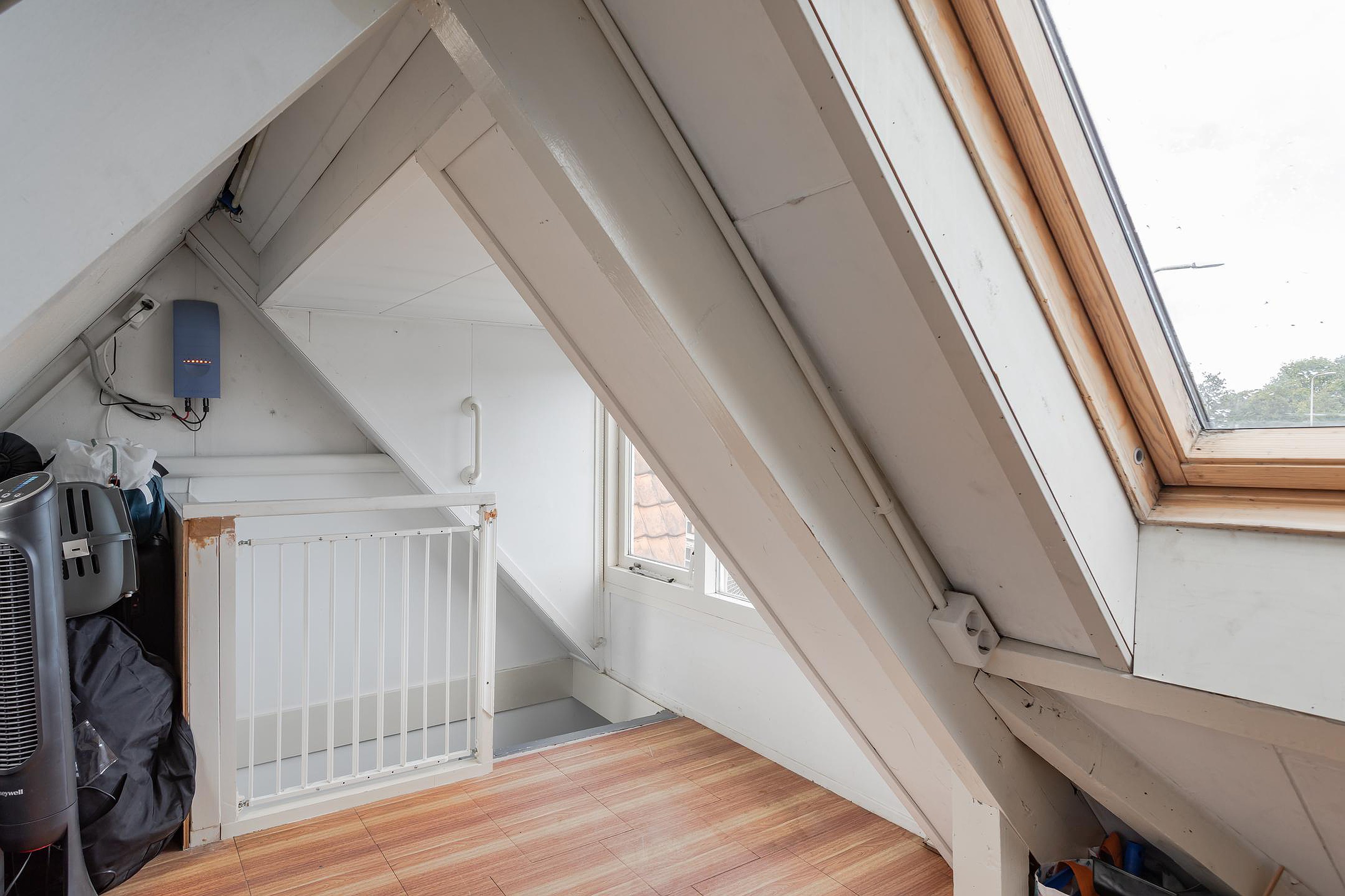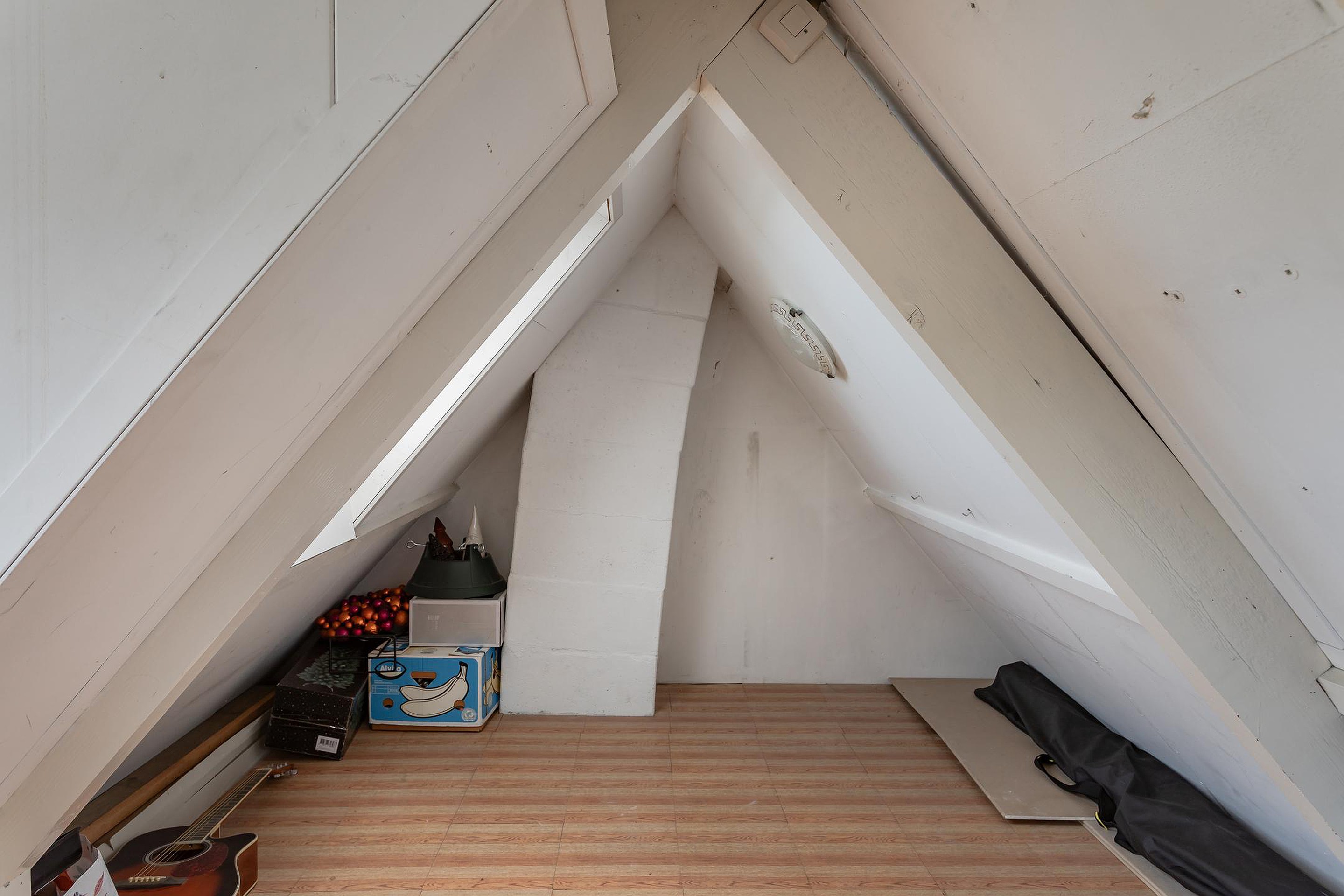 Vanaf de overloop is een vaste open trap naar de wegzetzolder. Het is net geen stahoogte maar wel opvallend ruim, mede door de kunststof dakkapel met dubbel glas in het houten kozijn en 2 Velux dakramen. Op de houten verdiepingsvloer liggen plaktegels, de omvormer van de 3 zonnepanelen hangt hier en het aanwezige rookkanaal is in zicht.