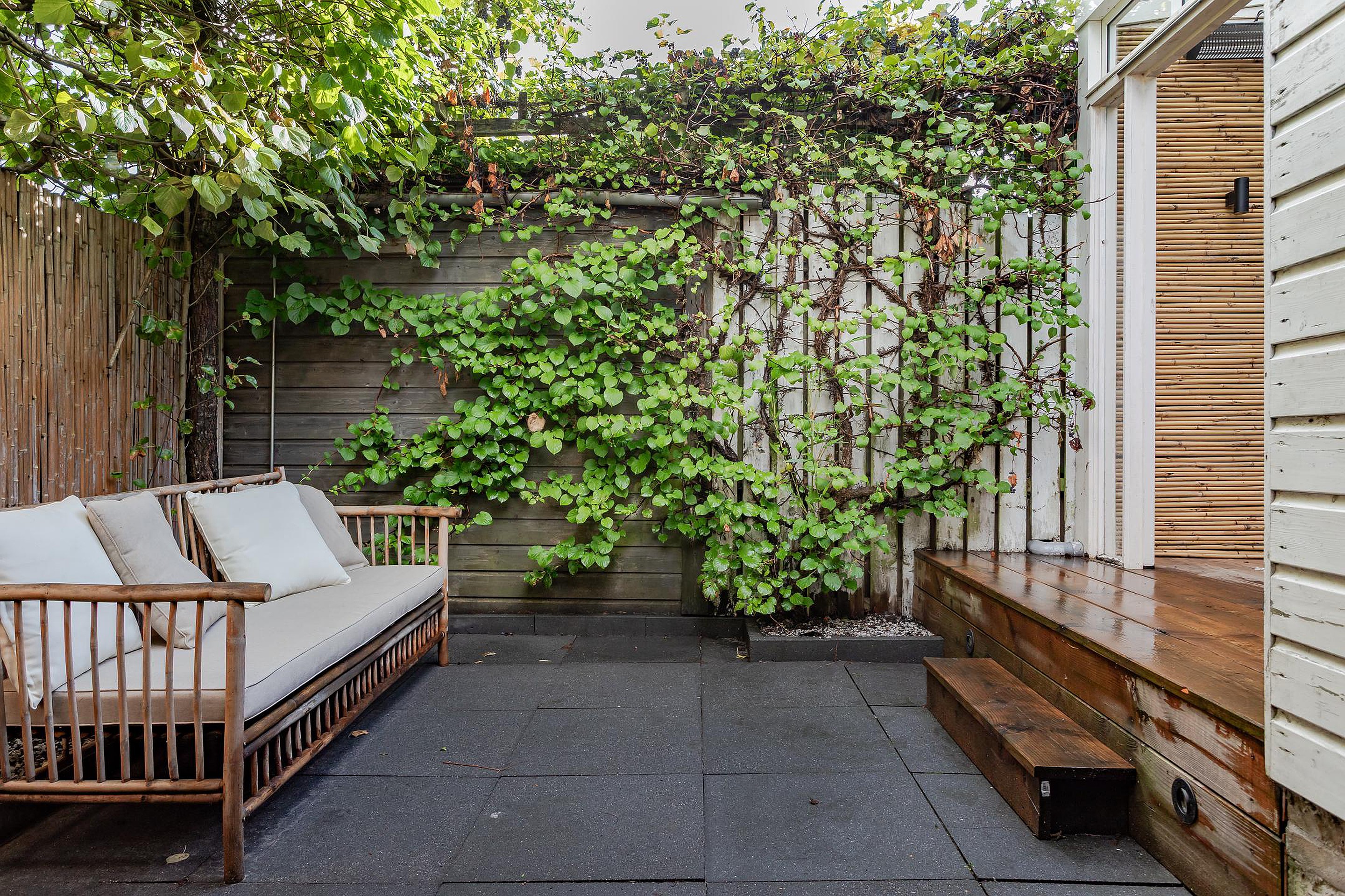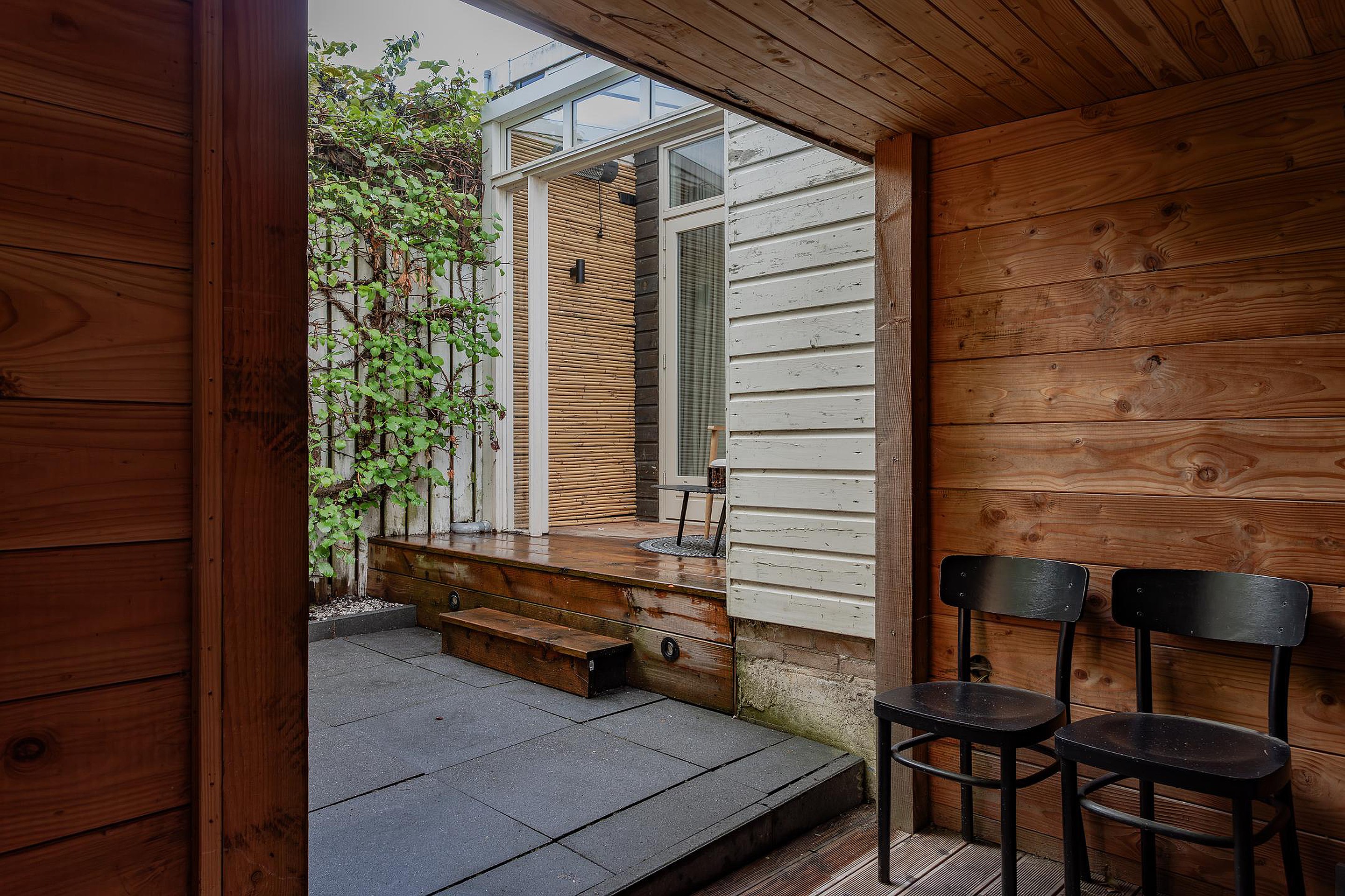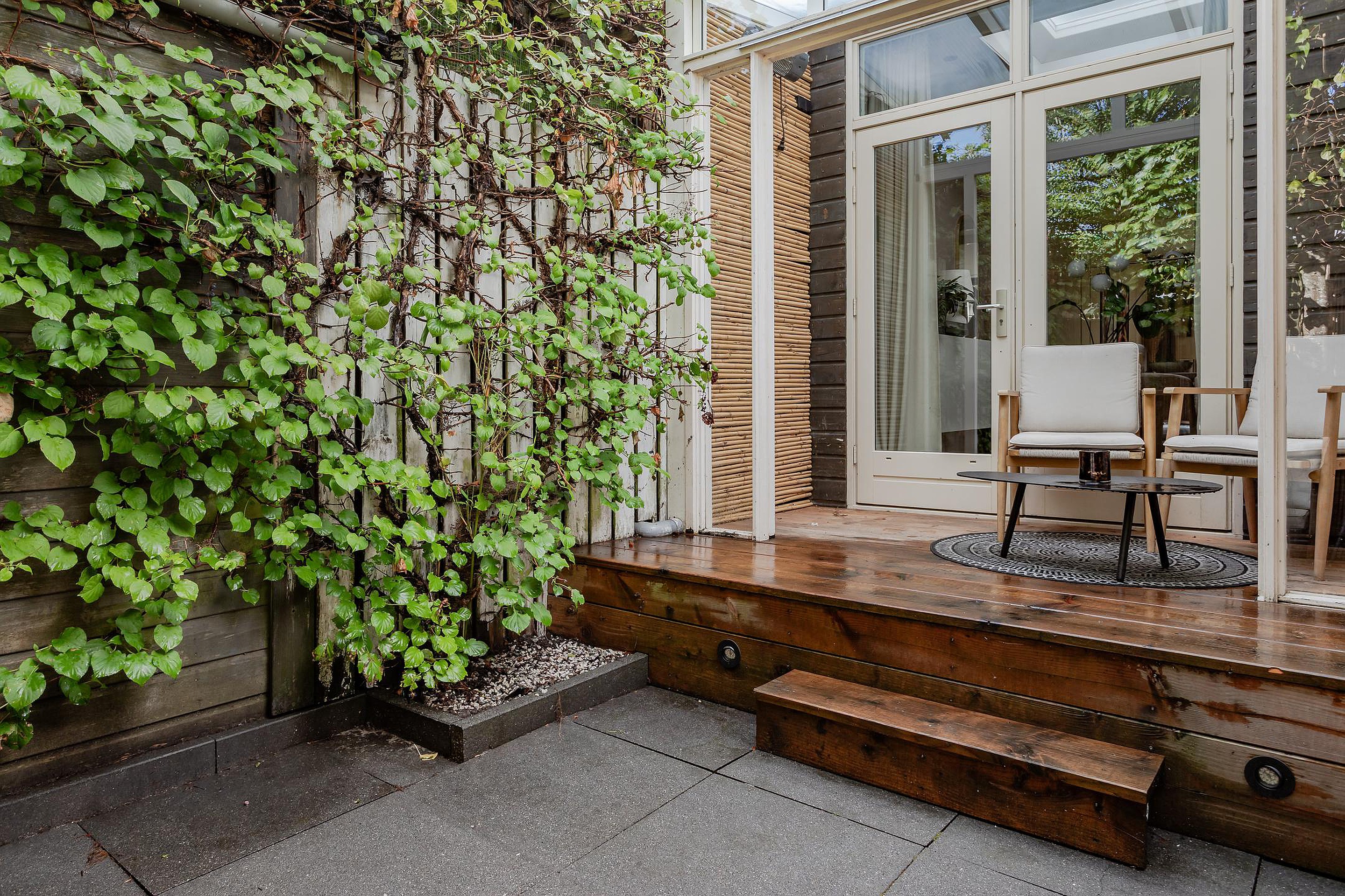 Er is een opstap met verlichting naar de overkapping bij de openslaande deuren. Wel zo fijn om de deuren open te kunnen zetten als het regent en er kan ook hier een gezellig zitje worden geplaatst. Kortom, een hele fijne tuin met veel privacy.