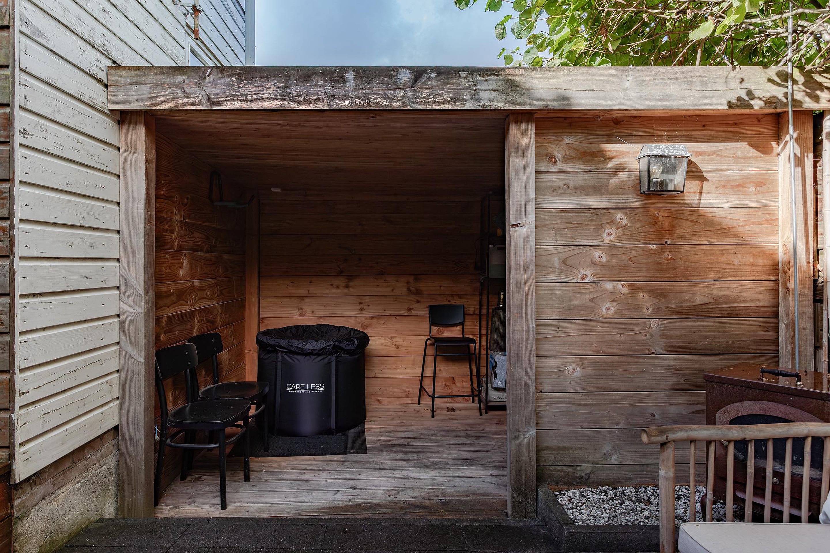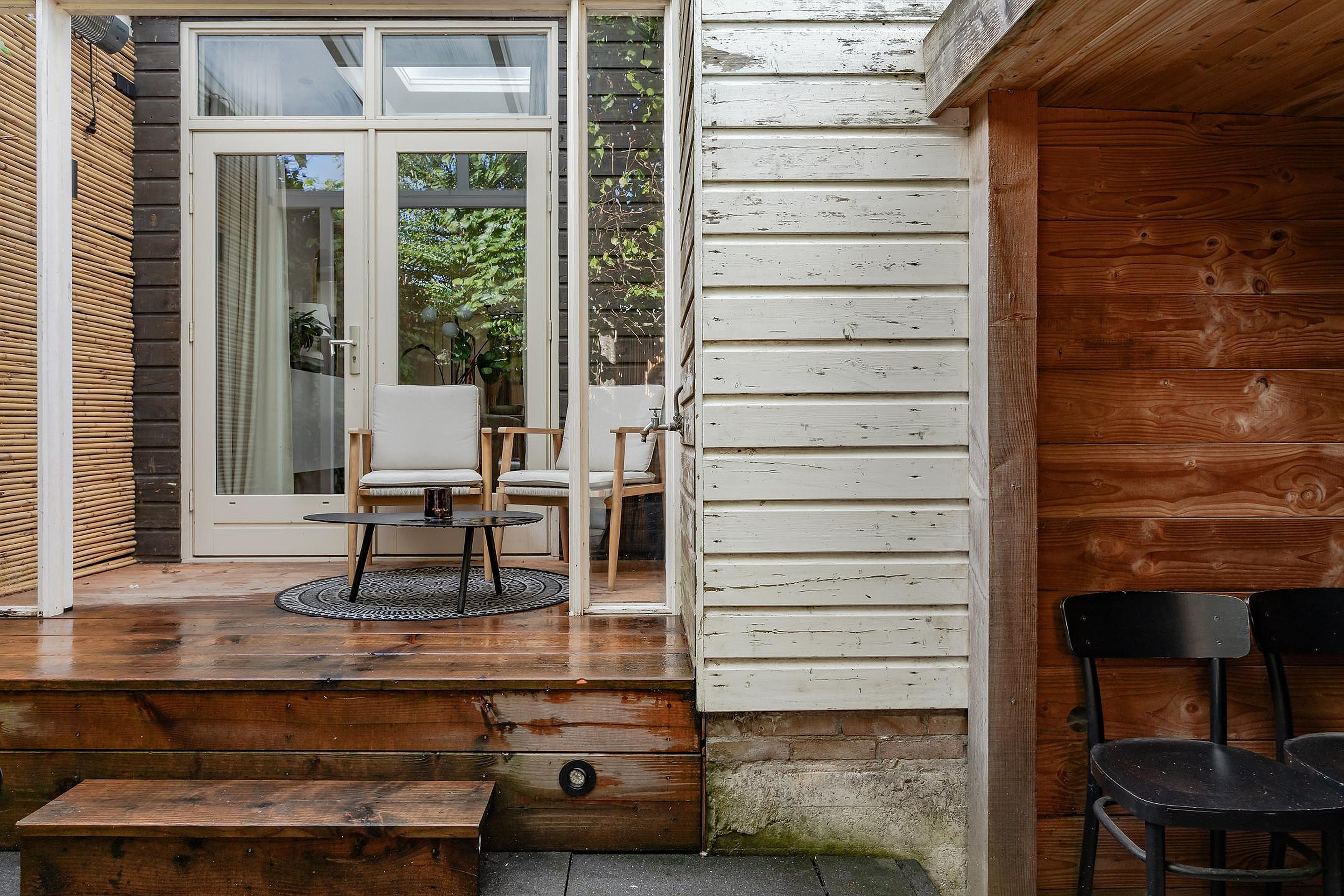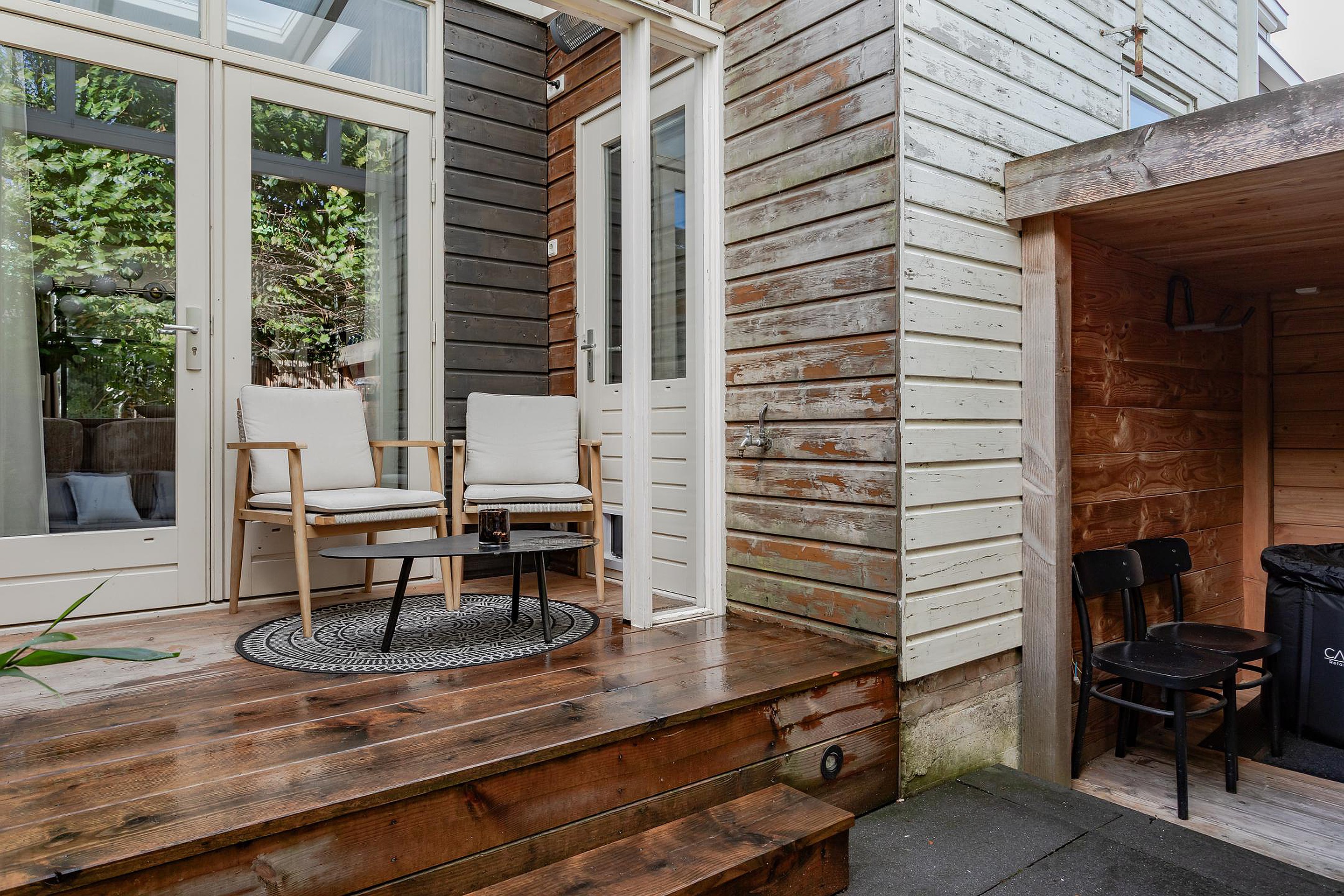 Er is een opstap met verlichting naar de overkapping bij de openslaande deuren. Wel zo fijn om de deuren open te kunnen zetten als het regent en er kan ook hier een gezellig zitje worden geplaatst. Kortom, een hele fijne tuin met veel privacy.