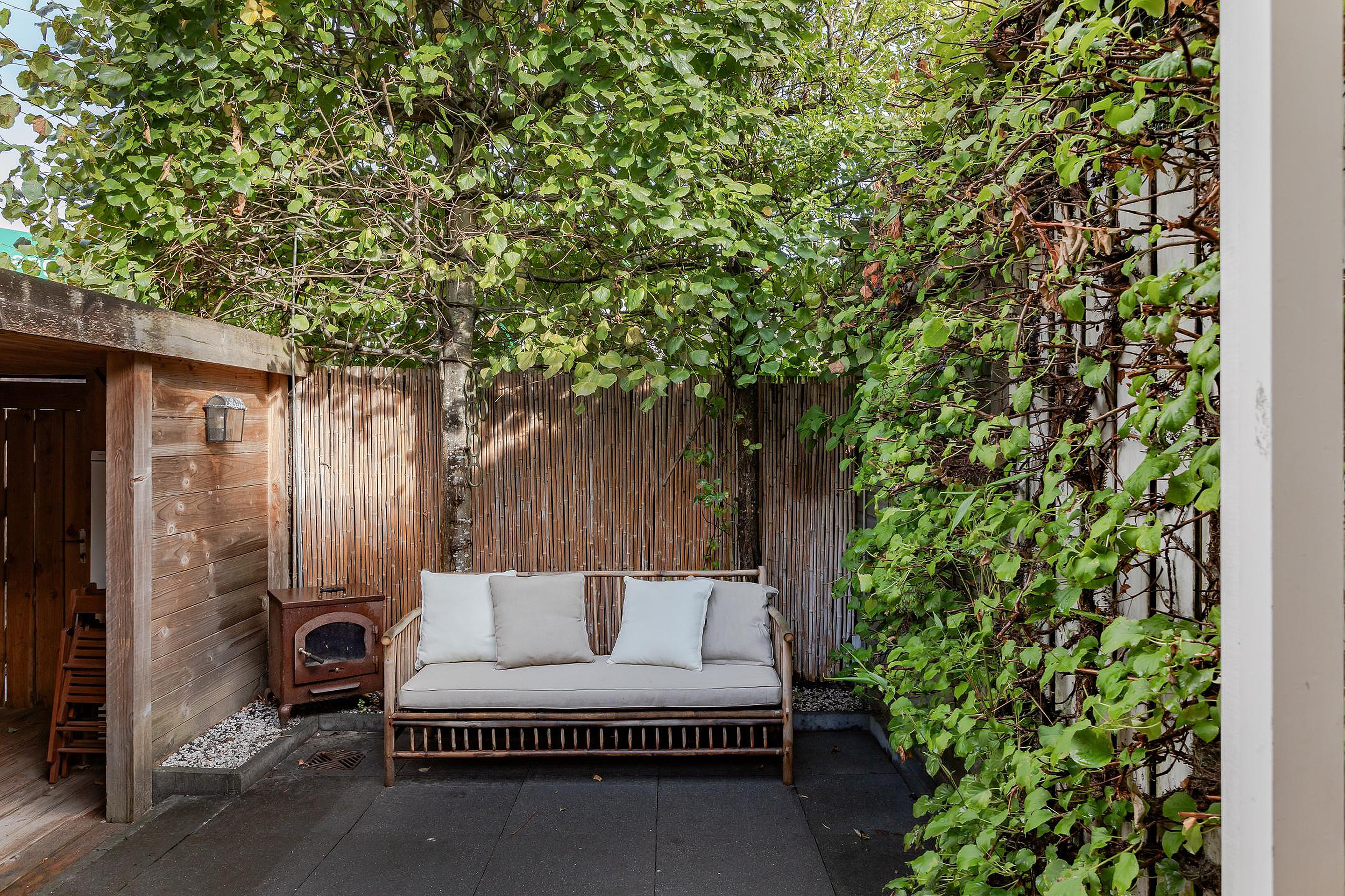Zonnige tuin op het noordwesten met zicht op veel groen en gezellige bamboebekleding tegen de schutting waar je ’s morgens al kan genieten van je eerste kopje koffie. De tuin is grotendeels bestraat met grote tegels, er is een ruime overkapping waar je een gezellig tuinset kan plaatsen en toch nog buiten kan zitten als het een beetje regent. In deze overkapping zijn meerdere stopcontacten en geeft een poortdeur toegang tot het achterom.