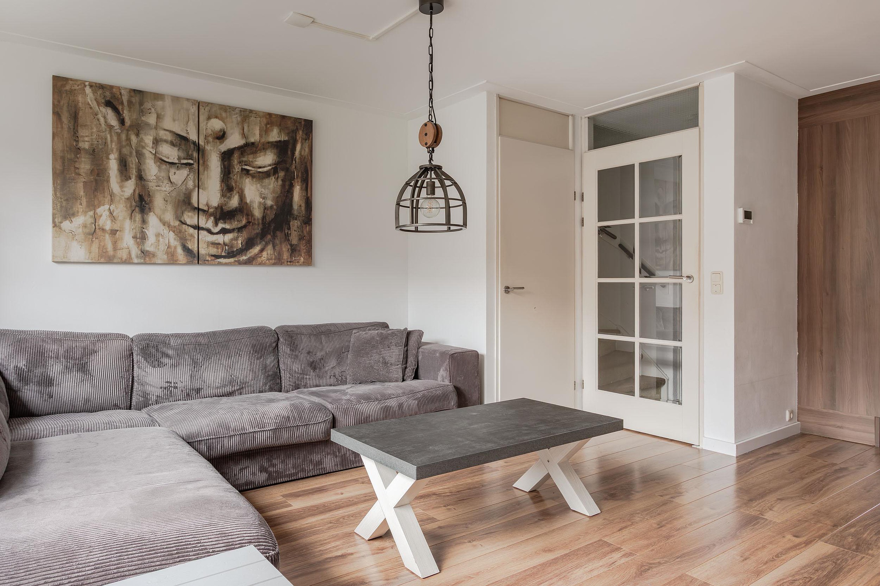 Een roededeur met facet geslepen glas geeft toegang tot de tuingerichte living met gestuukte wanden en dito plafond met een platte plint. Op de vloer ligt laminaat wat is doorgelegd vanuit de hal en ook in de diepe en praktische trapkast is het laminaat doorgelegd. Er kan fijn worden geventileerd d.m.v. het uitzetraam aan de tuinzijde en een tuindeur geeft toegang tot de zonnig gelegen tuin.