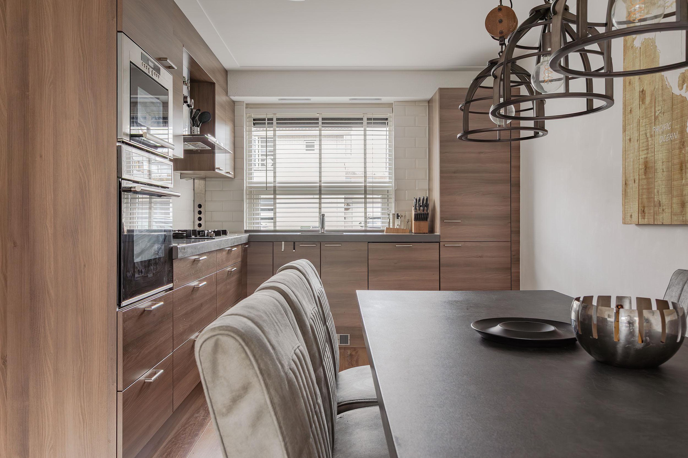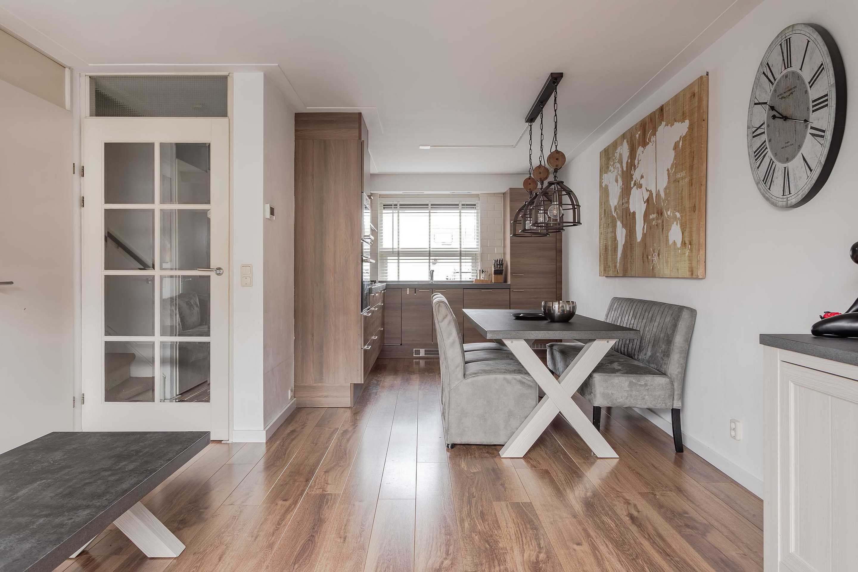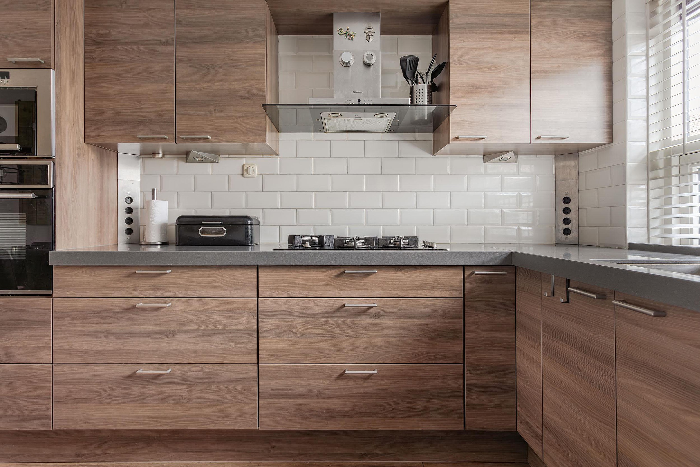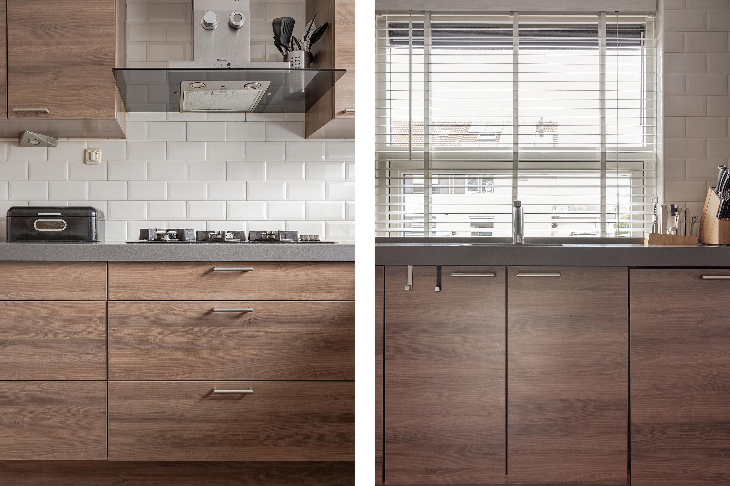 Ruime keukenopstelling met verhoogd werkblad uitgevoerd in composiet en veel werkruimte. Vanwege de grote raampartij met ventilatierooster en een uitzetraam heeft u prettig lichtinval op het werkblad. De keuken met enorm veel bergruimte in de soft-close laden, kastjes, carrouselkast en bovenkastjes met bladverlichting voorziet in diverse inbouwapparatuur, zoals: een grote oven, separate magnetron, koel-vriescombinatie, vaatwasser, 5 pits gaskomfoor, afzuigkap met de afvoer naar buiten en een kick-space. Opvallend zijn de vele stopcontacten waar je er nooit genoeg van kan hebben in een keuken en de achterwand is betegeld met lichte metrotegeltjes.