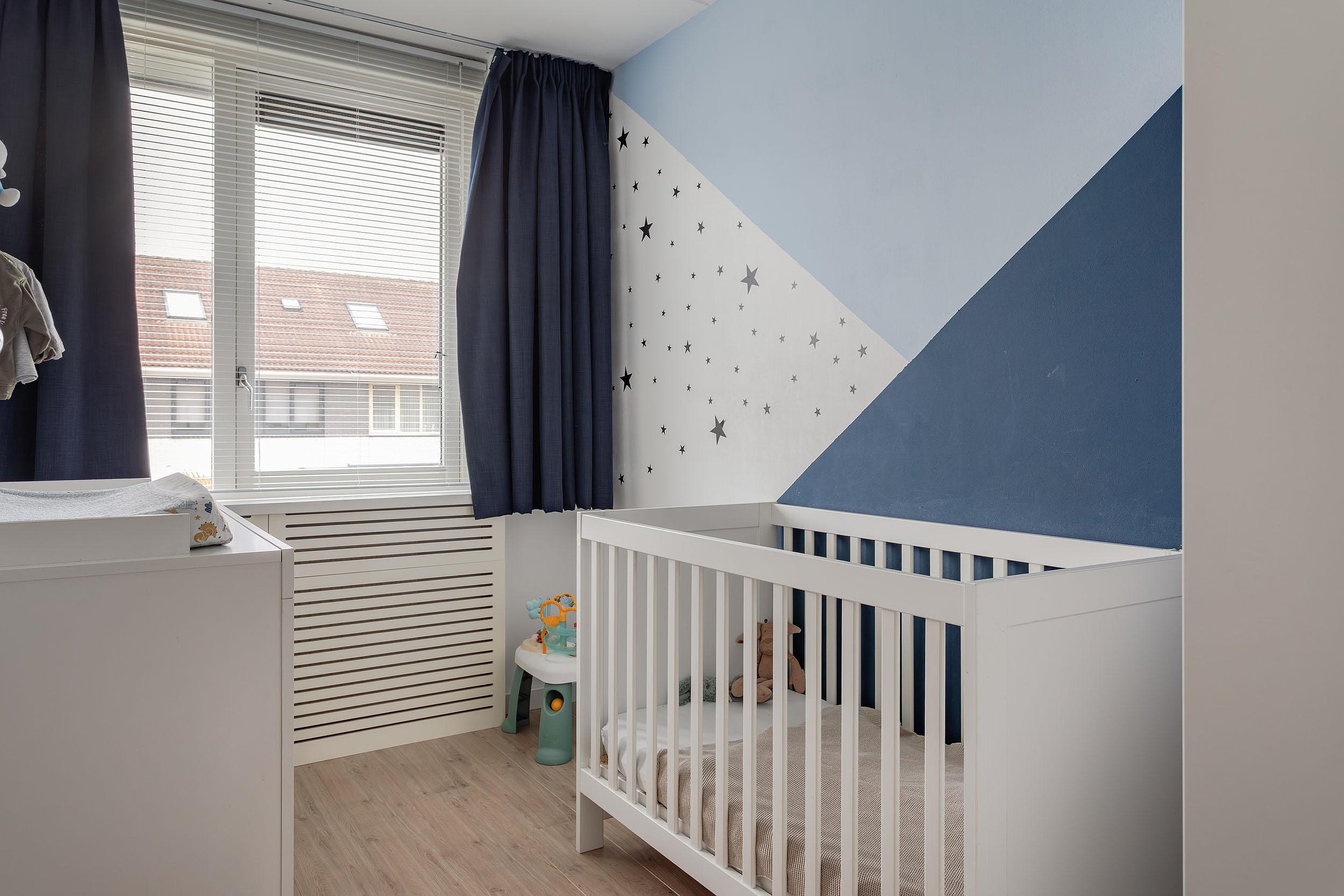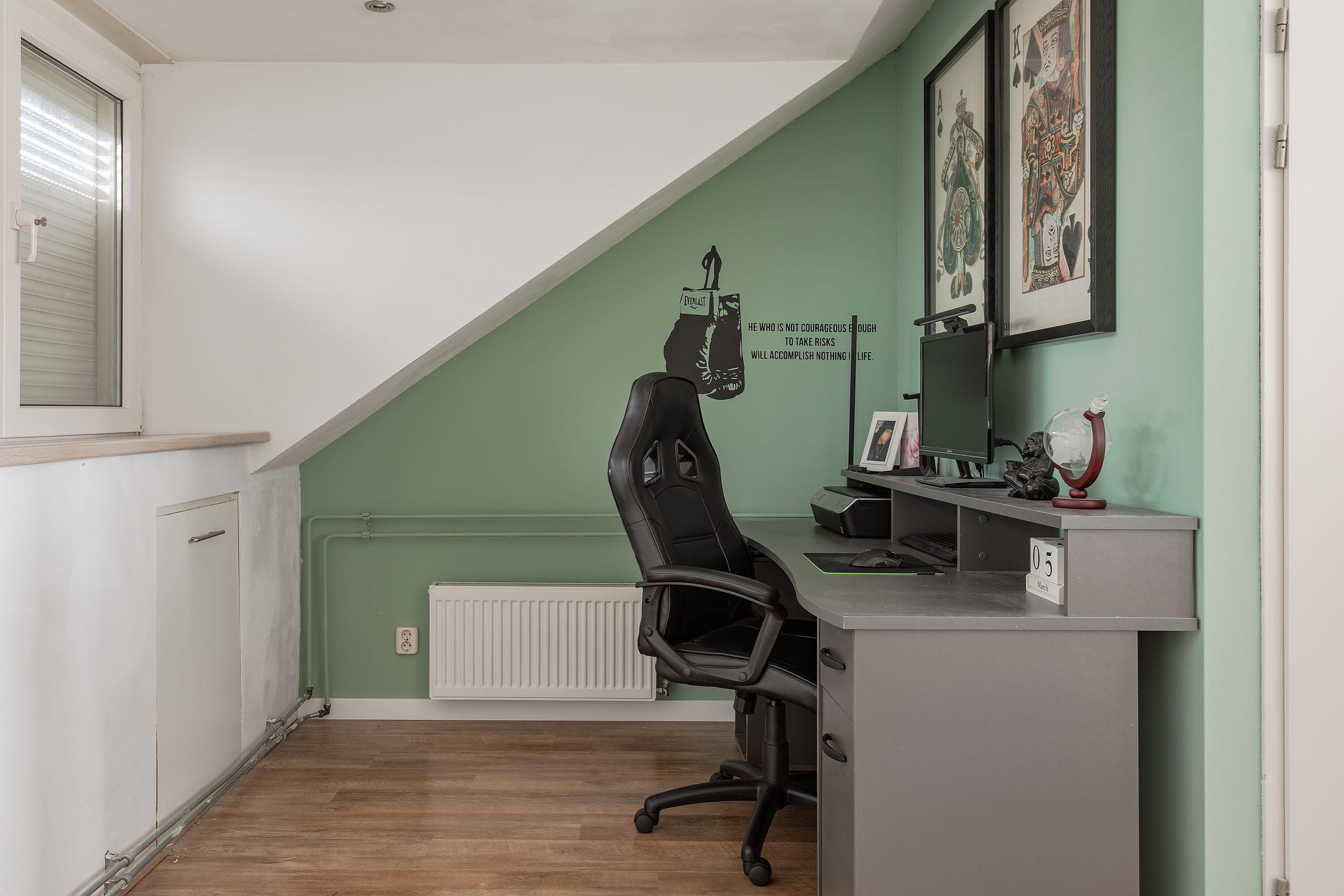 2e Slaapkamer achterzijde – ruime kamer met recht opgetrokken en gestuukte wanden. Ook deze kamer heeft een radiatorombouw en een hor bij het raam wat open kan.