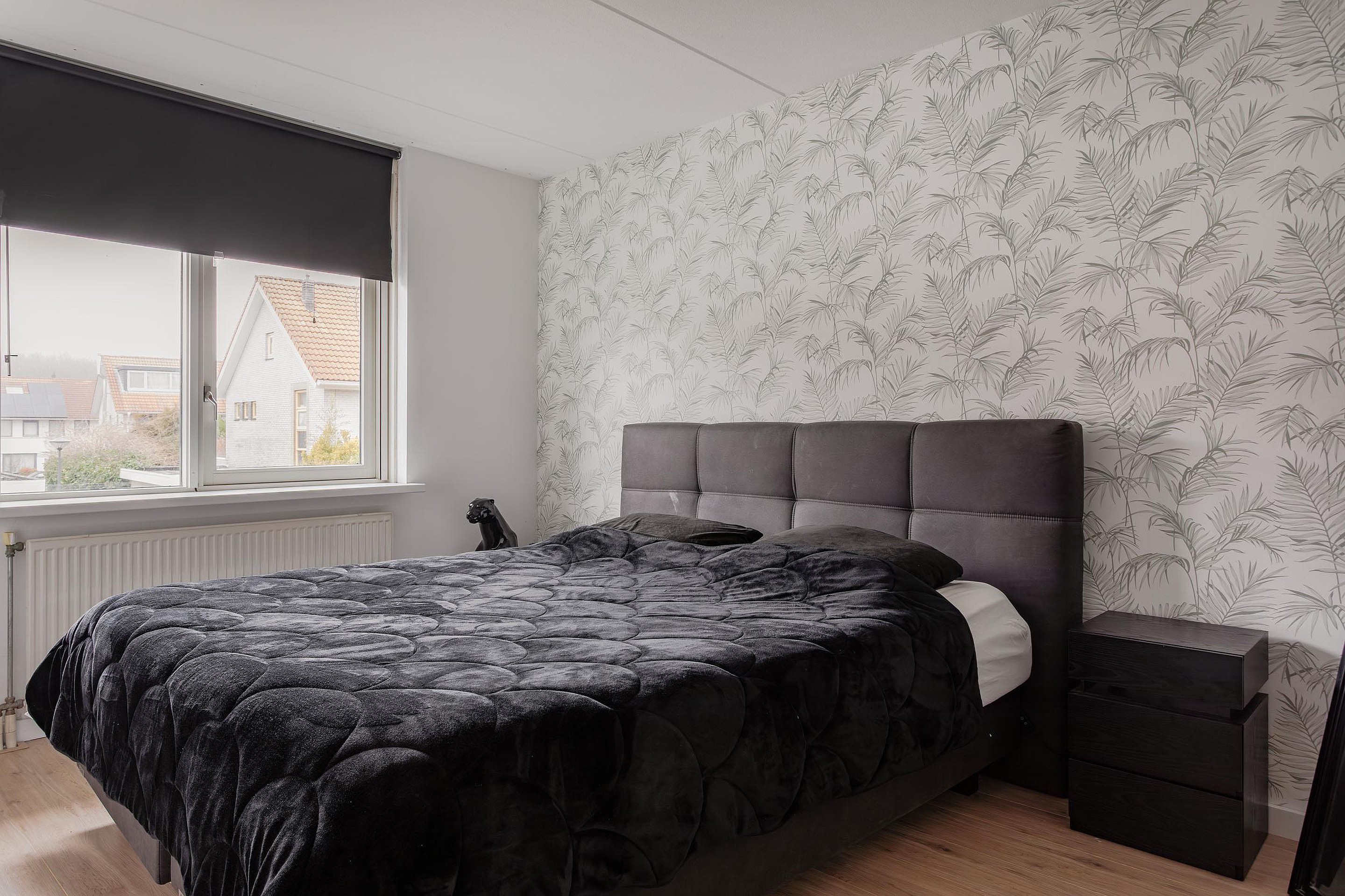 3e Slaapkamer voorzijde – ruime slaapkamer met recht opgetrokken en gestuukte wanden, 1 wand is behangen en ook deze kamer heeft een hor voor het raam wat open kan.